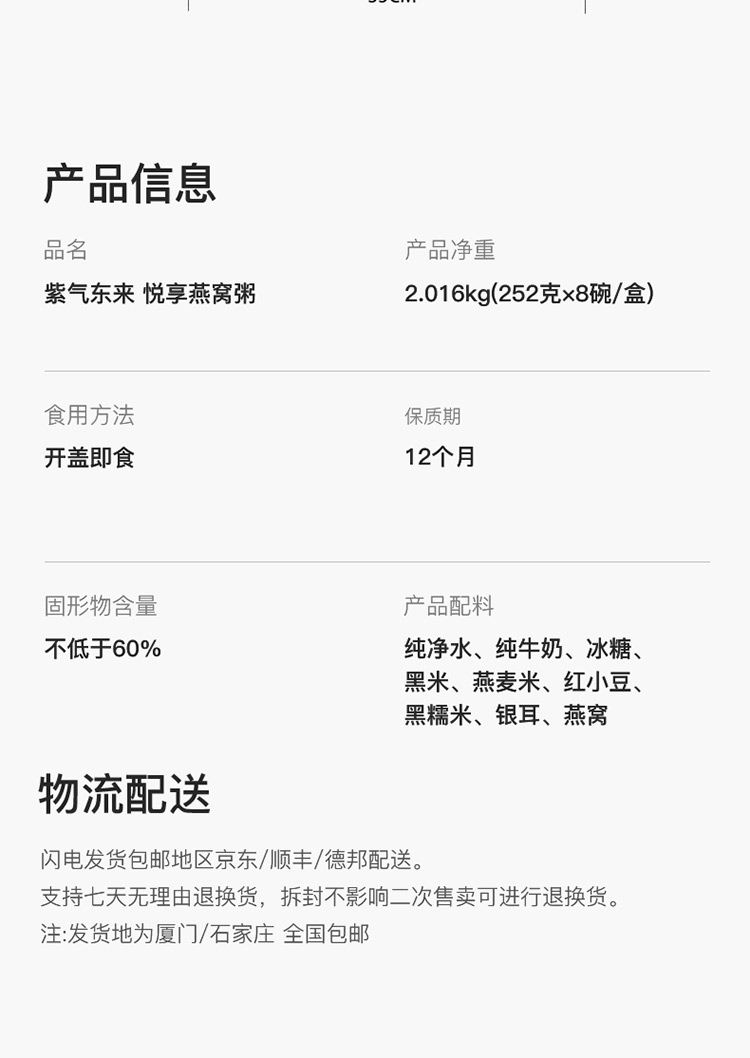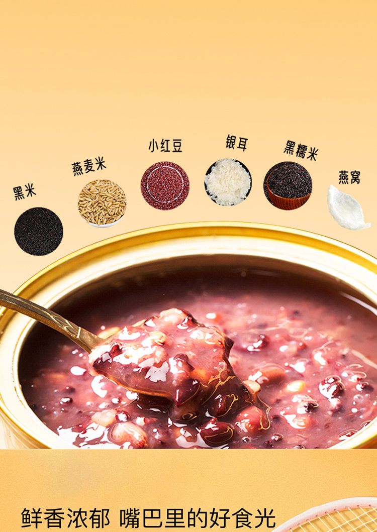 配置:252g*8碗 +勺子*8 /盒 固形物含量≥60% 配料表:纯净水、纯牛奶、冰糖、黑米、燕麦米、红小豆、黑糯米、银耳、燕窝 食用方法:开盖即食 净含量:2016克/盒 保质期:12个月 储存方法:存放于通风干燥处