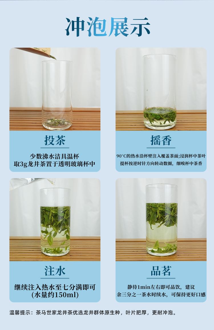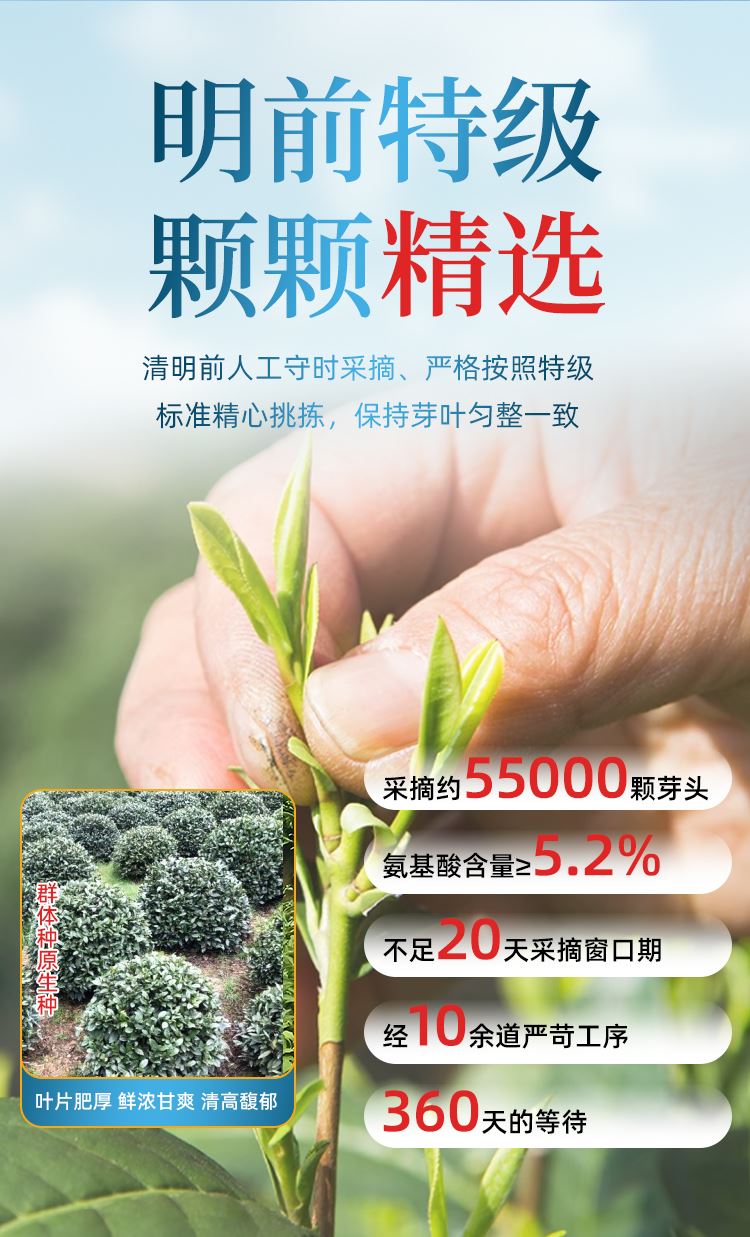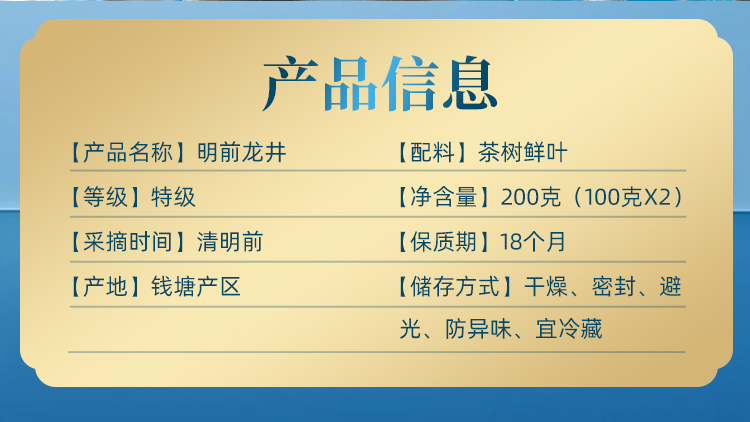 【等级】特级 【采摘时间】清明前 【产地】钱塘产区 【配料】茶树鲜叶 【净含量】200克(100克X2) 【保质期】18个月 【储存方式】干燥、密封、避光、防异味、宜冷藏
