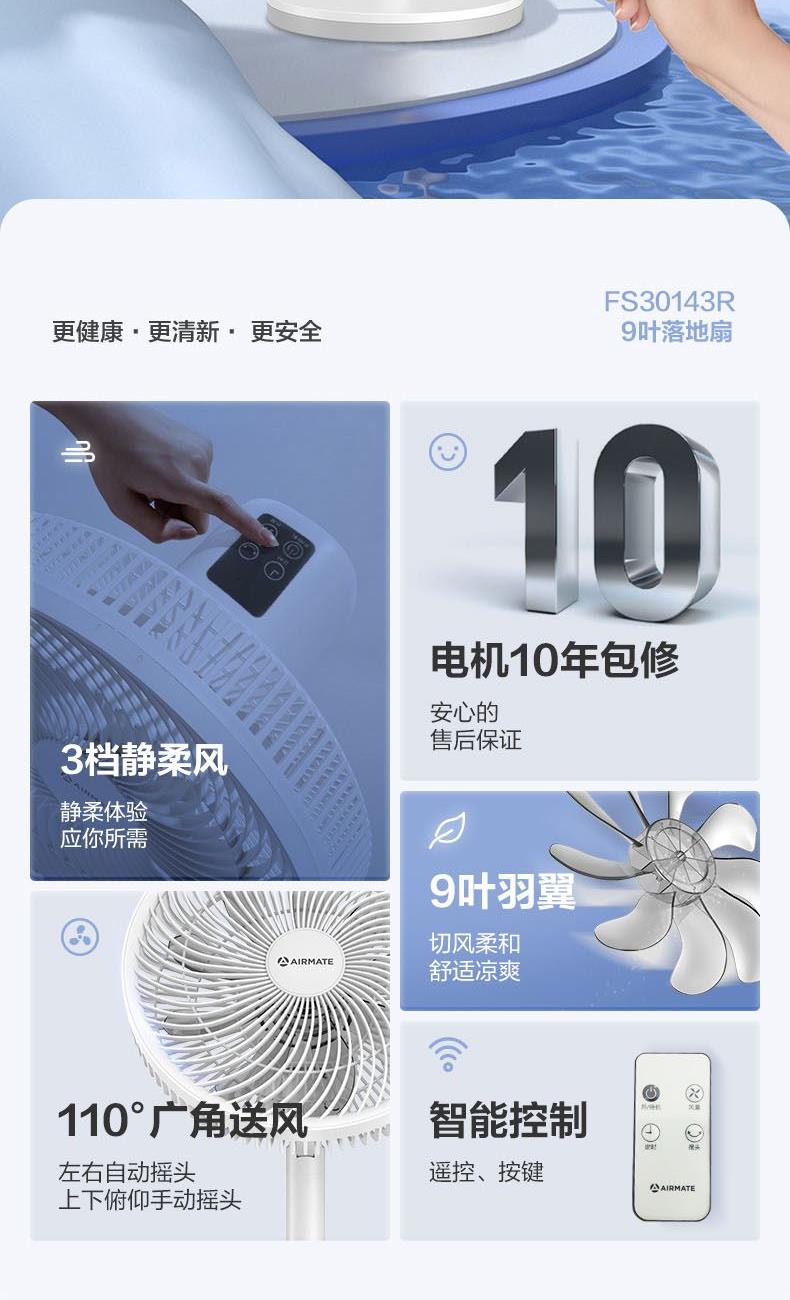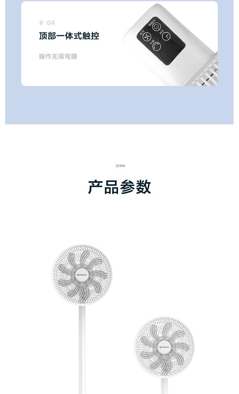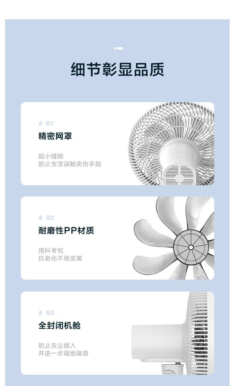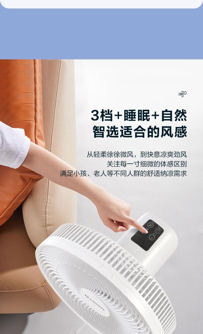 额定功率:45W 额定电压:220V 控制方式:遥控/触控 风扇叶片:9叶 产品档位:3档调节 高度:落地94cm/台式51cm 1、51年造风工艺及技术沉淀,结合仿生原理,9片羽翼扇叶更大程度模拟自然风 1、结合仿生原理,9片羽翼扇叶更大程度模拟自然风 2、110°左右广角送风,30°俯仰可调 3、反抛物线加速网格,塑造风的形态,送风平稳范围广,风感更柔和 4、强中弱三档调节,大风强劲舒爽,小风轻柔细腻