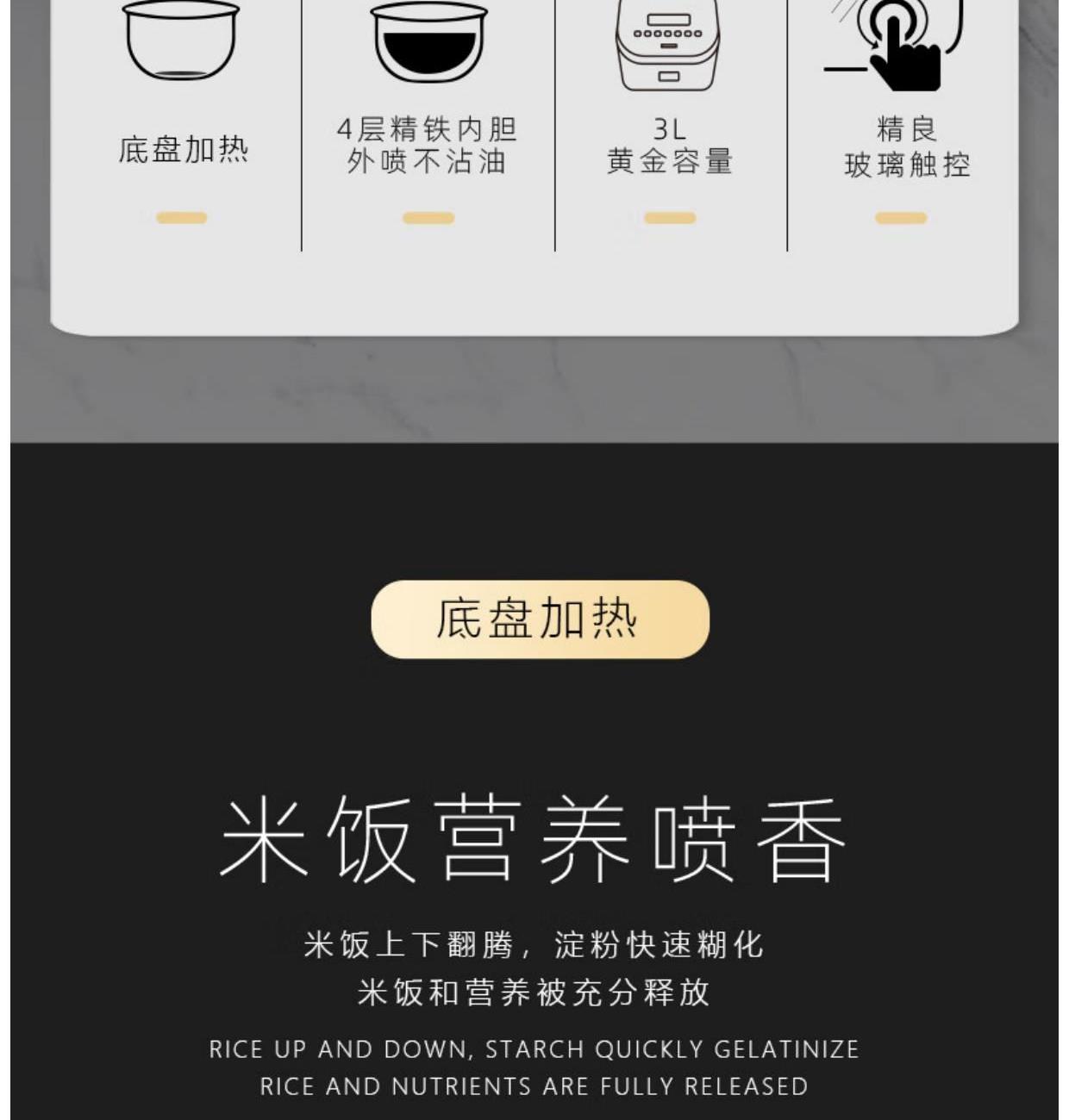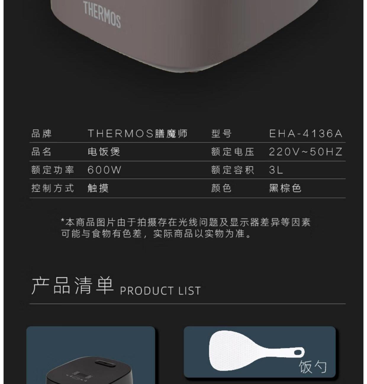 产品型号 :EHA- 4136A 额定电源 :220V~50Hz 能效等级:三级 额定功率 :1160W 额定容量 :3L 内胆重量:0.65kg 控制方式 :触摸 配件清单 :主机*1、内胆*1、量杯*1、饭勺*1、电线*1 环绕加热,上下立体加热; • 显隐式LED触摸面板智慧易操作,平整光洁,方便更贴心; • 快速导热锁热,烹煮效率高,热量穿透每一颗米; • 24小时智能预约,多种菜单选择,承包全家人美味大餐;