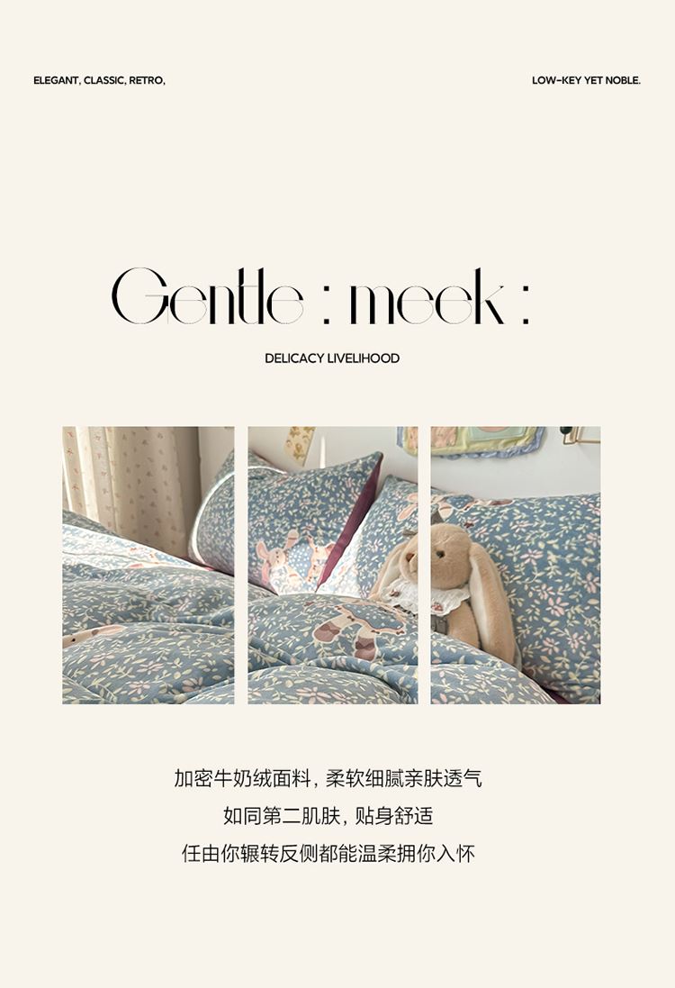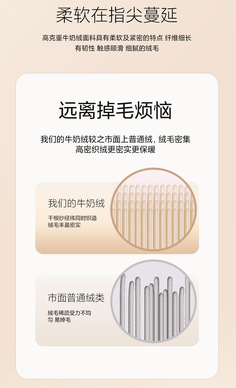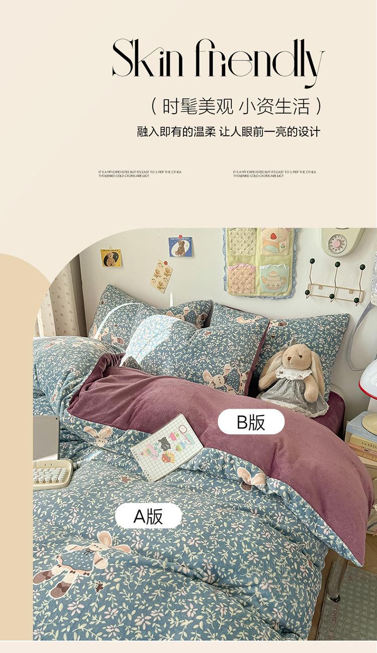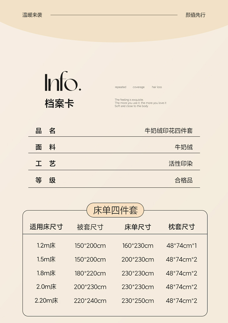1:加密牛奶绒面料,柔软细腻亲肤透气如同第二肌肤,贴身舒适任由你辗转反侧都能温柔拥你入怀 2:克重加厚牛奶绒面料 柔软触感安抚内心 软糯厚实有肉感 让温暖自由来去亲肤速暖 尺寸:被套 200*230cm*1 床单:230*230cm*1 枕套48*74cm*2
