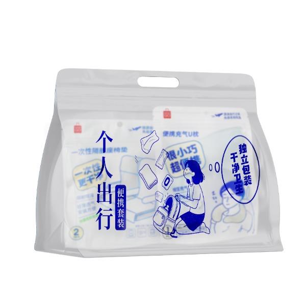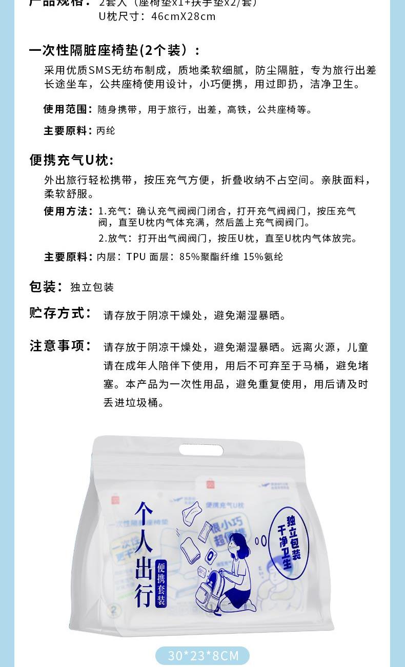 便携充气U枕1只(46*28cm): 主要原料:内层:TPU面层:85%聚酯纤维15%氨纶 外出旅行轻松携带,按压充气方便,折叠收纳不占空间。亲肤面料,柔软舒服。 使用方法:1.充气:确认充气阀阀门闭合,打开充气阀阀门,按压充气阀,直至U枕内气体充满,然后盖上充气阀阀门。2.放气:打开出气阀阀门,按压U枕,直至U内气体放完。 使用范围:随身携带,用于旅行,出差,高铁,公共座椅等。 一次性隔脏座椅垫2套(每套含座椅垫1+扶手垫2):主要原料:丙纶 采用优质SMS无纺布制成,质地柔软细腻,防尘隔脏,专为旅行出差长途坐车,公共座椅使用设计,小巧便携,用过即扔,洁净卫生。 代发价指常规区域,偏远区域新疆/西藏+12元/单;宁夏/内蒙古/青海省/甘肃+5元/单)