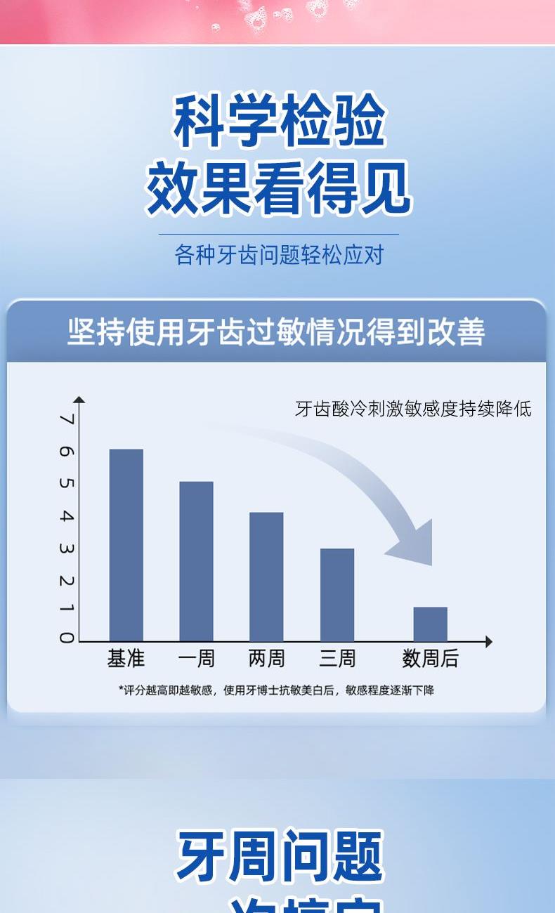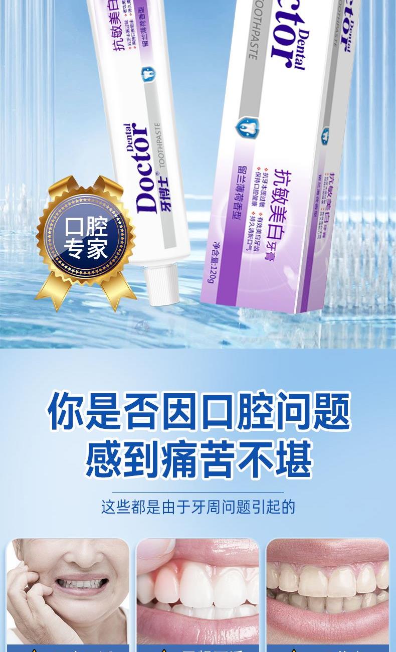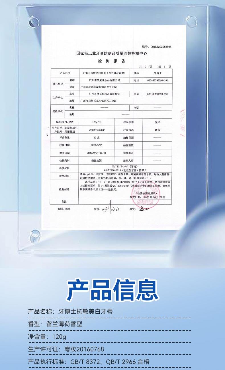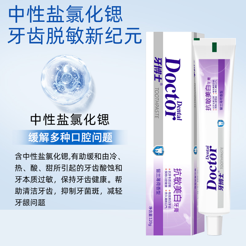 香型:留兰薄荷香型 净含量:120g 生产日期:2025年 保质期:3年 1.减轻牙齿敏感,深入修复牙釉质 2.含中性盐氯化锶,有助缓和由冷热、酸、甜所引起的牙齿酸蚀和牙本质过敏, 3.帮助清洁牙齿,抑制牙菌斑,减轻牙龈问题