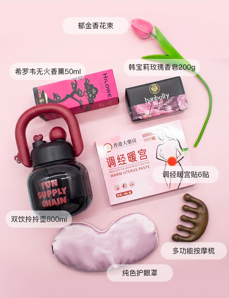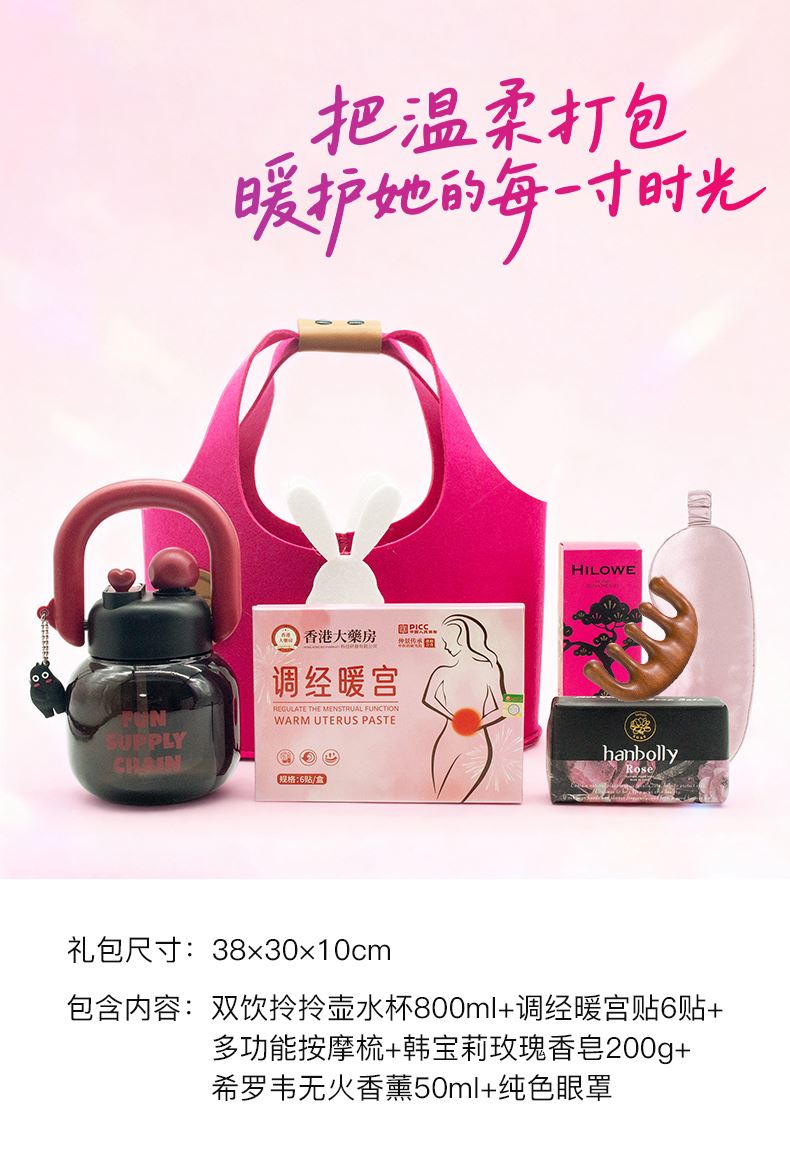 毛毡包尺寸:38*30*10cm 双饮拎拎壶水杯:800ml 藤枝无火香薰:50ml 多功能按摩梳 调经暖宫贴:6贴 韩宝莉玫瑰香皂:200g 纯色眼罩
