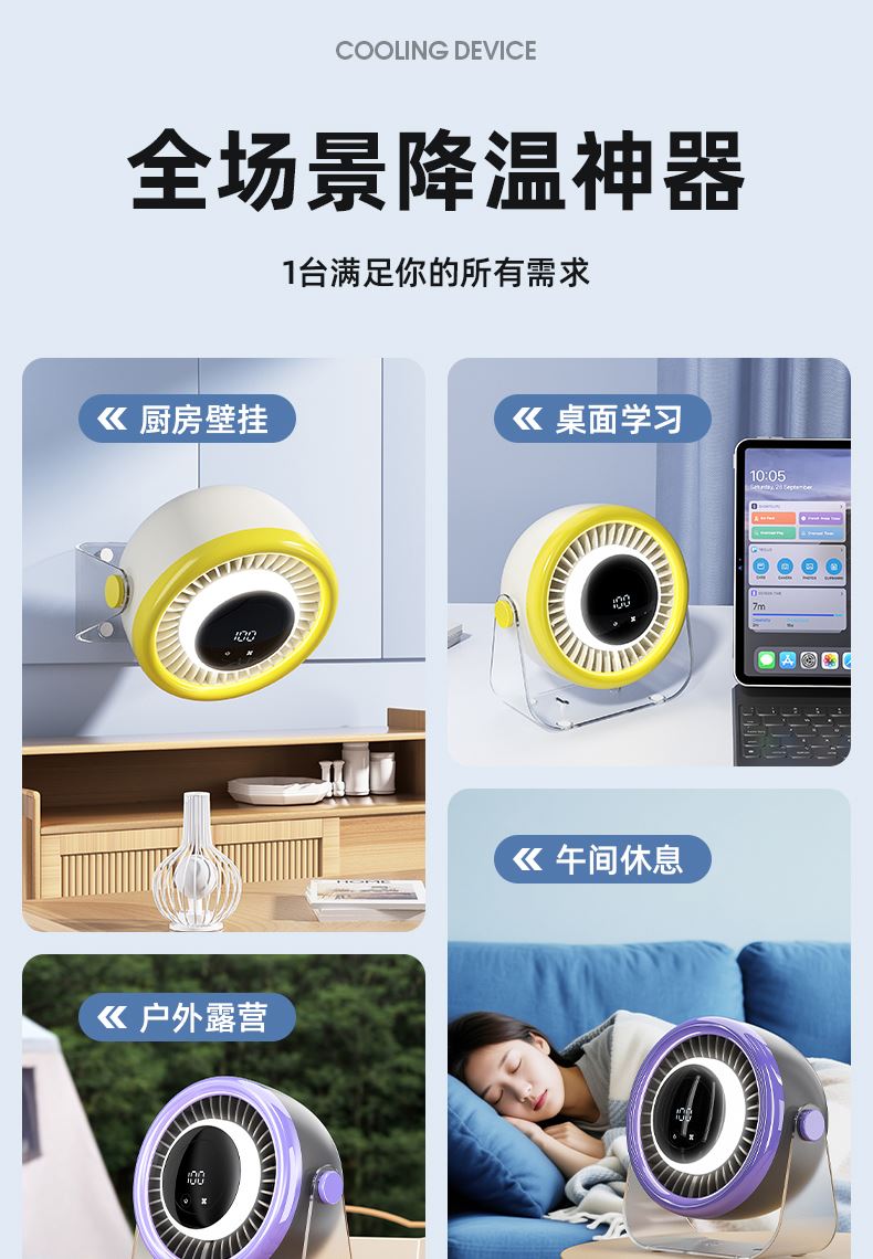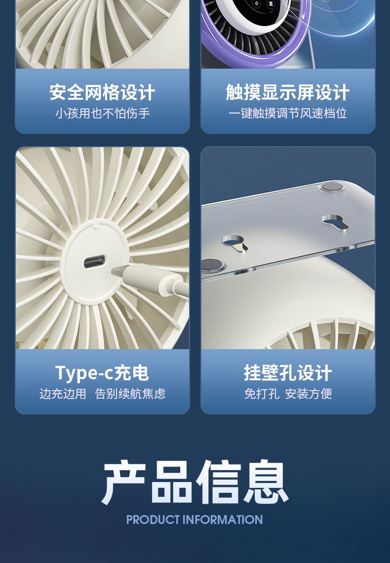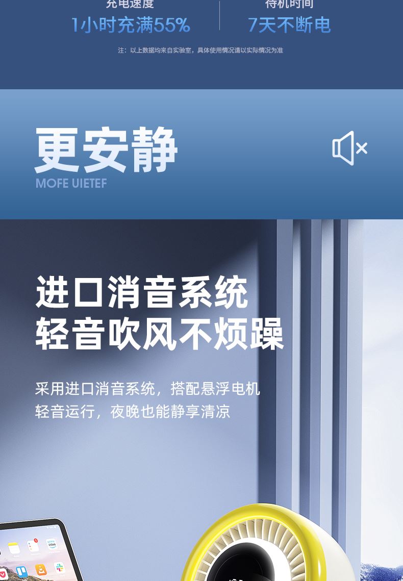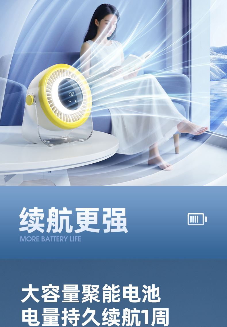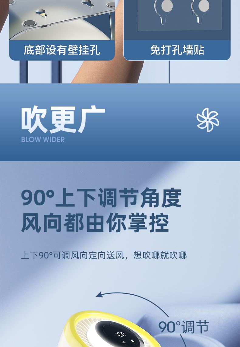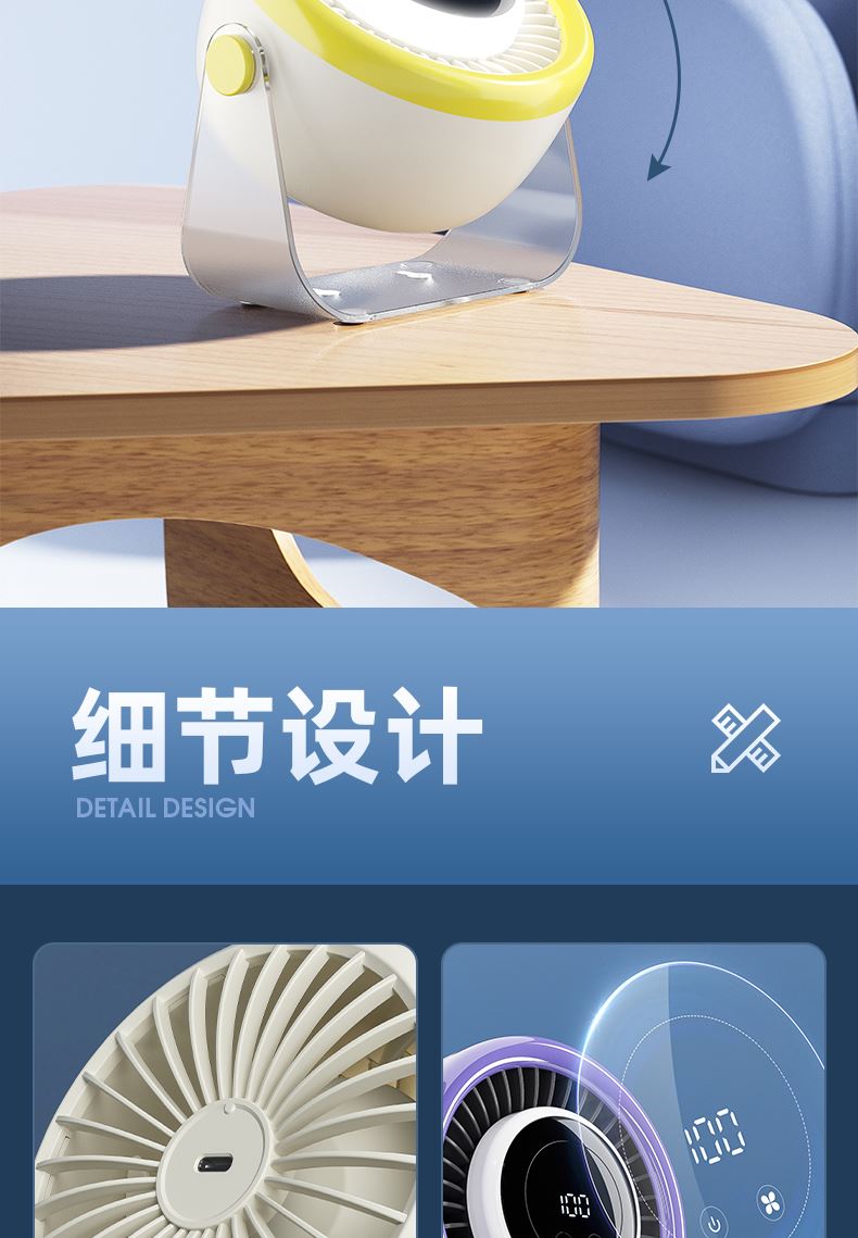 产品材质:ABS 产品功能:100档风力调节 产品容量:3000mAh 产品尺寸:165*166*90.8mm 产品颜色:戴森灰,柠檬色 100档调节,风力随心选;智能数显外屏,档位清晰可见;搭配空调使用,能够加快制冷;可挂壁两用,使用更方便,使用场景更多;小夜灯功能,伴我们安心入眠。