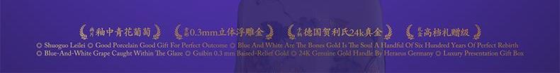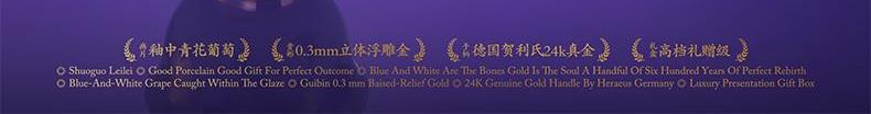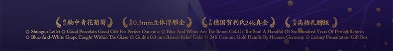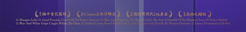 1.盖碗:高62mm、口径88mm、容量150ml 2.公道杯:高80mm、口径77mm、容量220ml 3.主人杯:高40mm、径64mm、容量70ml 4.品茗杯:高37mm、口径60mm、容量50ml 5.贺 卡:高130mm、宽100mm、 6.快客包:长167mm、宽148mm、高120mm 7.礼 盒:长190mm、宽190mm、高126mm 8.手提袋:长220mm、宽209mm、高138mm