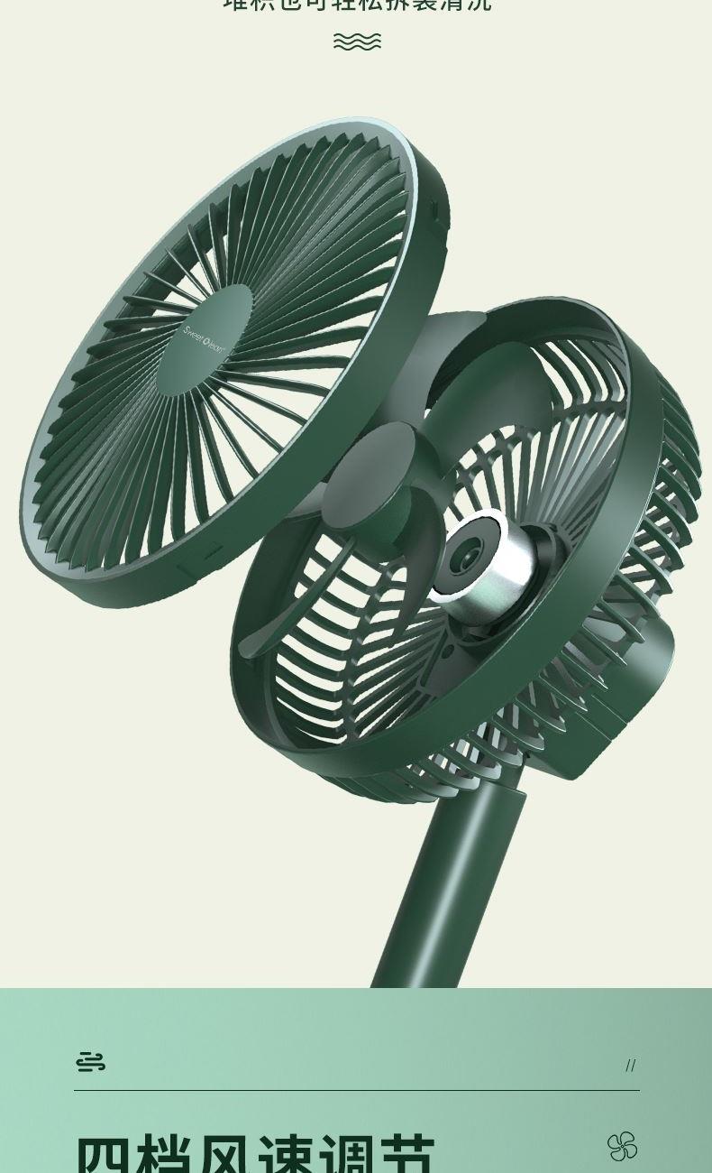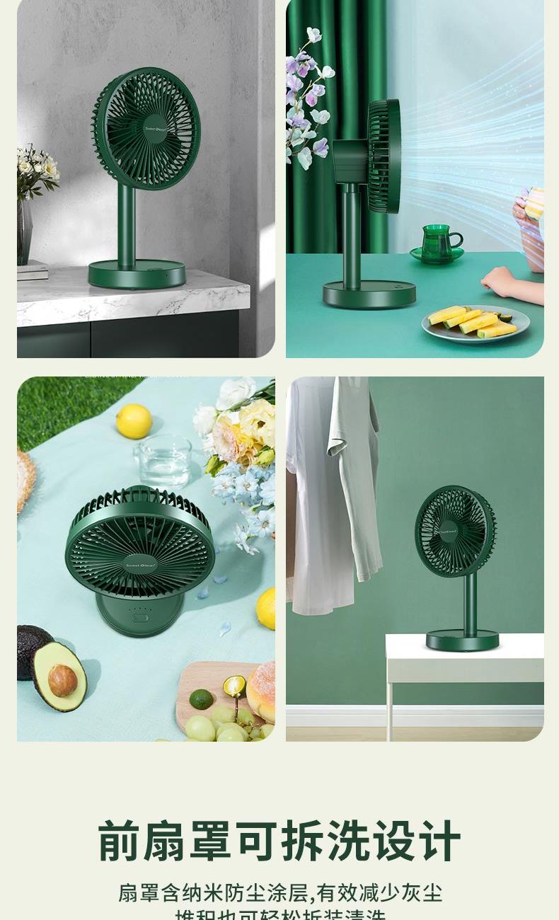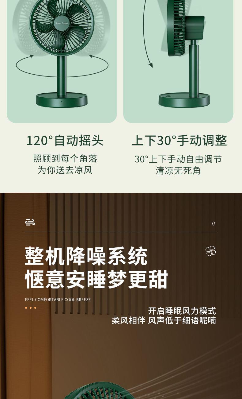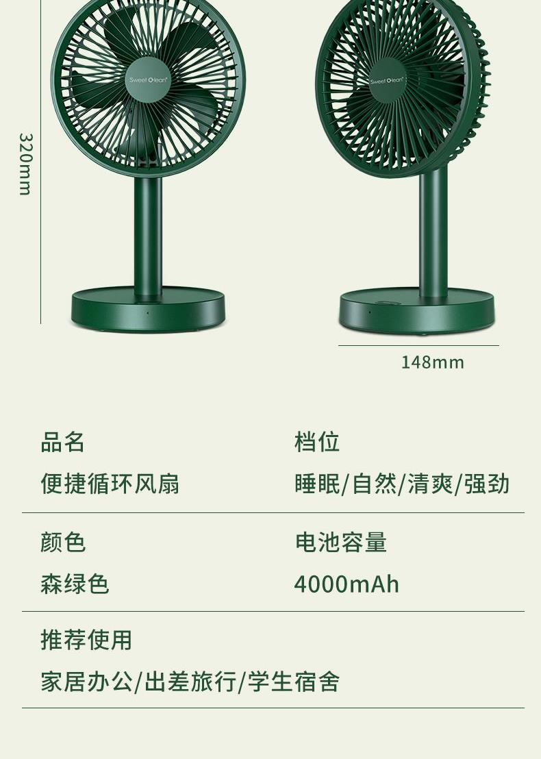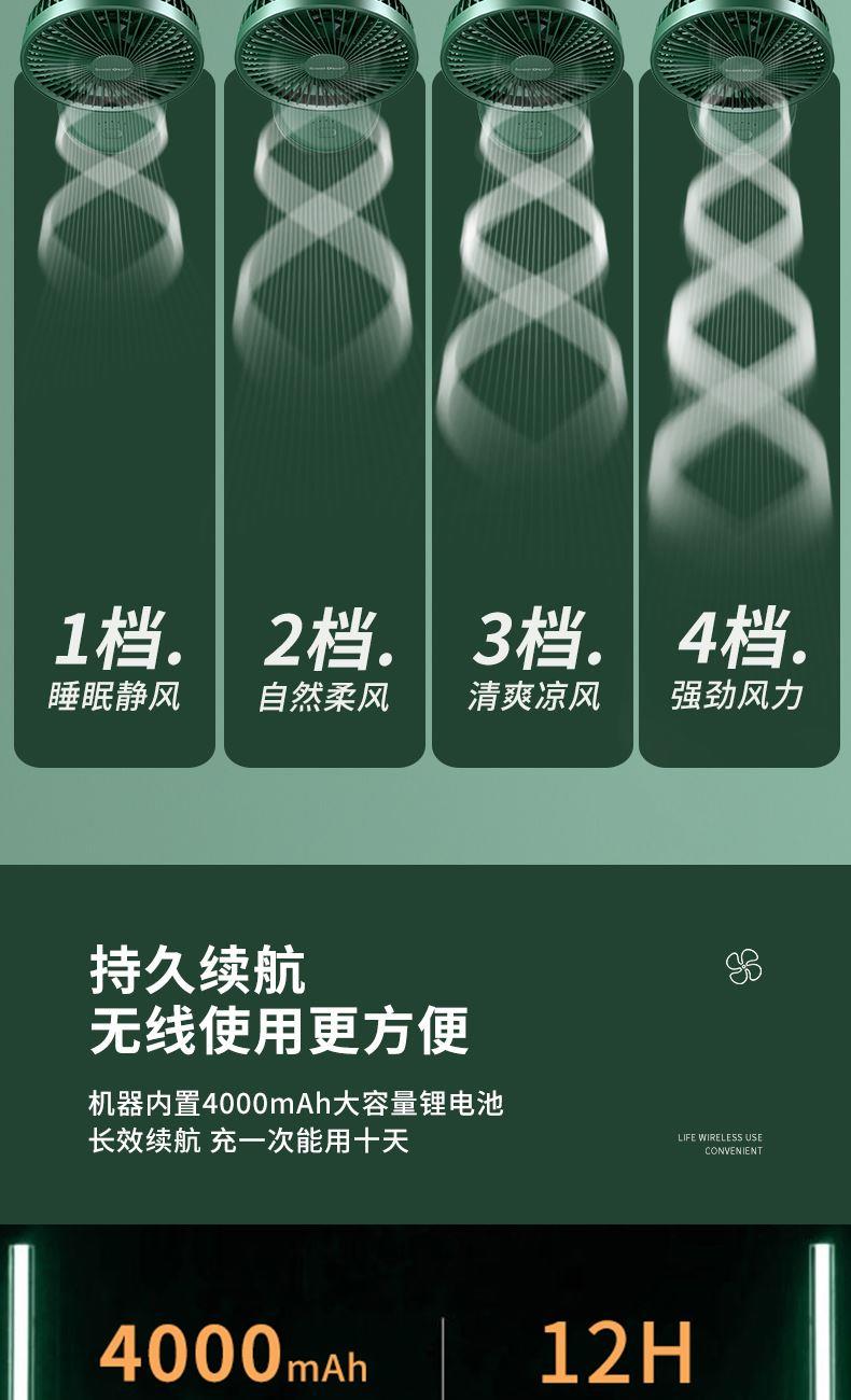 档位:睡眠/自然/清爽 电池容量:4000mAh 推荐使用:家居办公/出差旅行/学生宿舍 涡轮螺旋扇叶 + 强电机 旋涡大风力,出风直降 10℃,瞬间横扫酷热。 纳米防尘涂层 + 可拆洗扇罩 少积灰、易拆装,一冲即净,干净又省心。 120° 自动摇头 + 30° 俯仰调节 广角送风无死角,全屋都凉快。 4 档风速可调 微风到劲爽,满足不同场景需求。 无线便携设计 摆脱电源线,客厅 / 卧室 / 户外都能用。 持久续航 全天不断电,清凉一整夏
