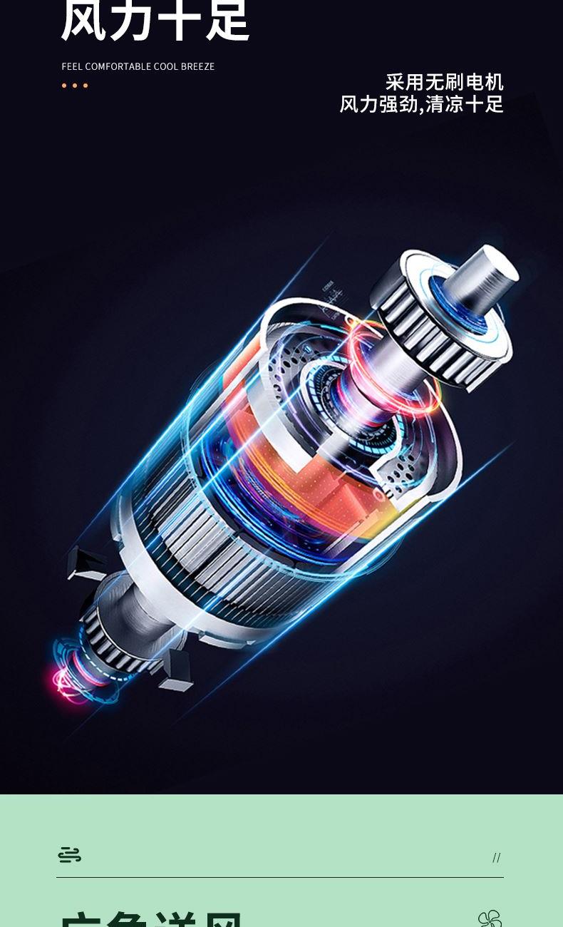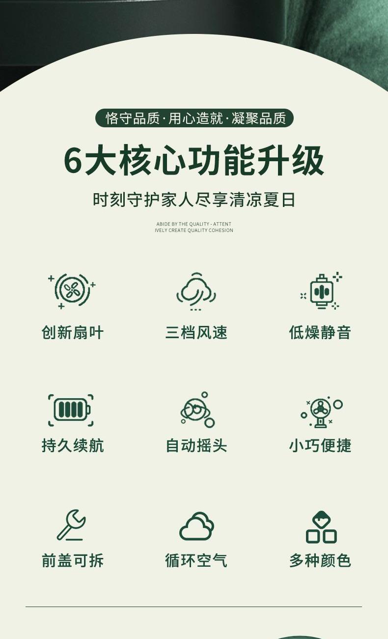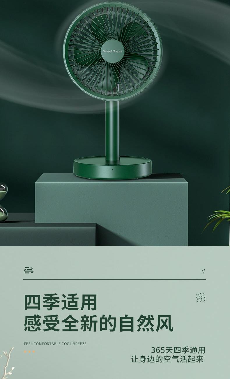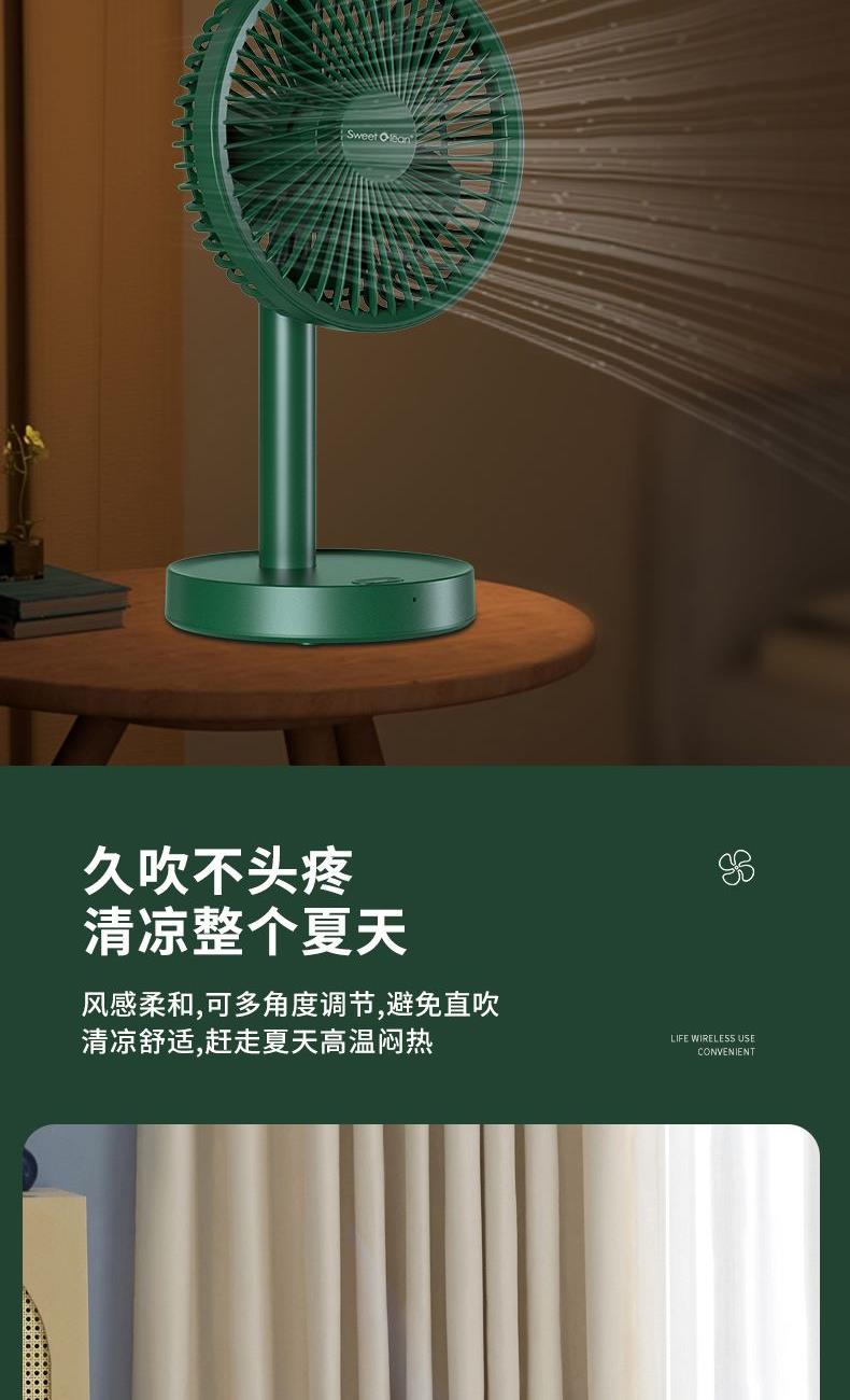 档位:睡眠/自然/清爽 电池容量:4000mAh 推荐使用:家居办公/出差旅行/学生宿舍 涡轮螺旋扇叶 + 强电机 旋涡大风力,出风直降 10℃,瞬间横扫酷热。 纳米防尘涂层 + 可拆洗扇罩 少积灰、易拆装,一冲即净,干净又省心。 120° 自动摇头 + 30° 俯仰调节 广角送风无死角,全屋都凉快。 4 档风速可调 微风到劲爽,满足不同场景需求。 无线便携设计 摆脱电源线,客厅 / 卧室 / 户外都能用。 持久续航 全天不断电,清凉一整夏