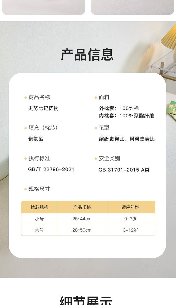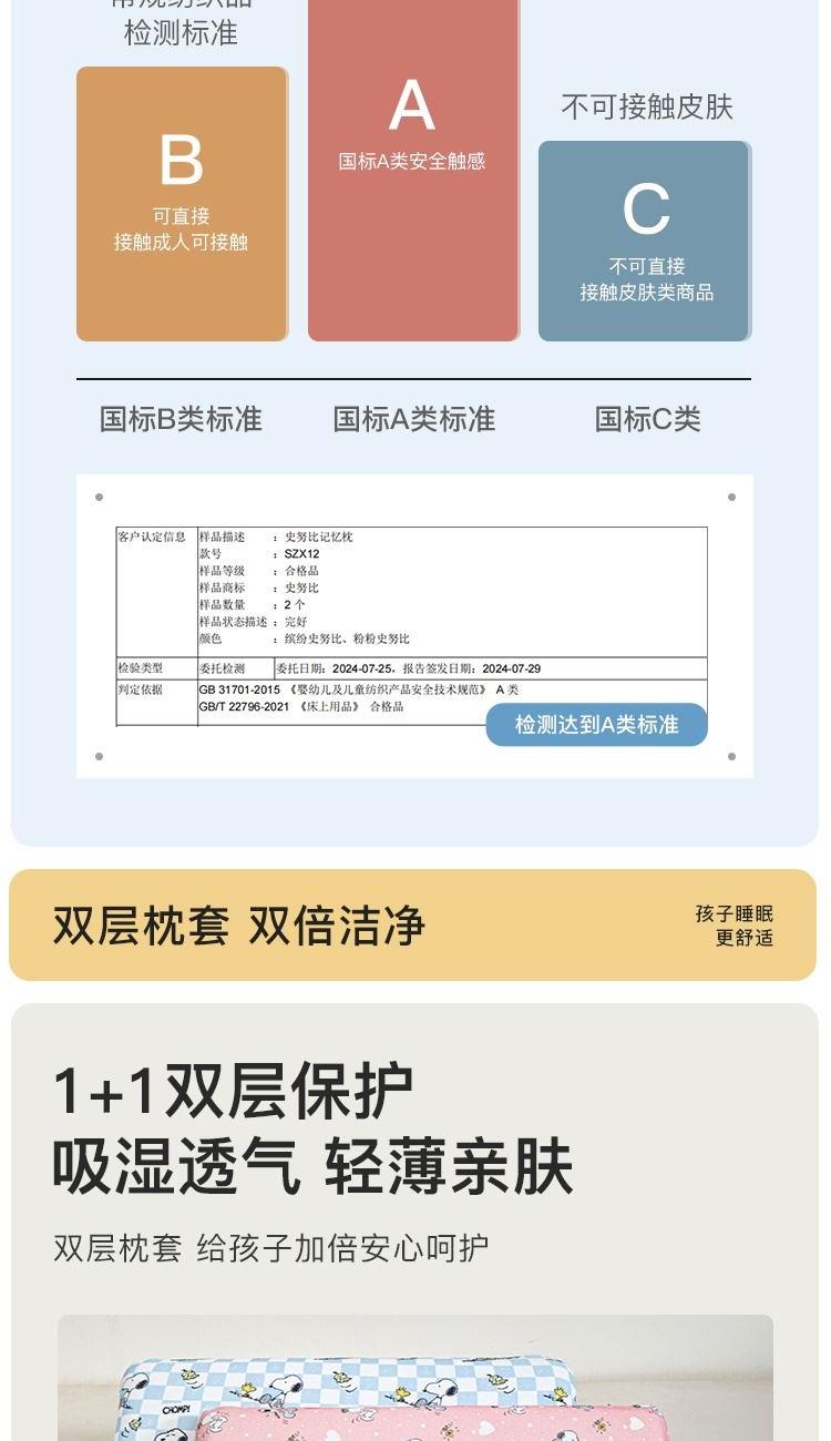 商品货号:SZX12 商品面料:棉、里料:聚酯纤维 枕芯:记忆棉(聚氨酯) 商品颜色:缤纷史努比、粉粉史努比 柔软记忆棉枕 安全慢回弹 释放头部压力 优质枕套 柔软吸湿好舒服 健康活性印染 色牢度高不易褪色 快速响应睡姿变化