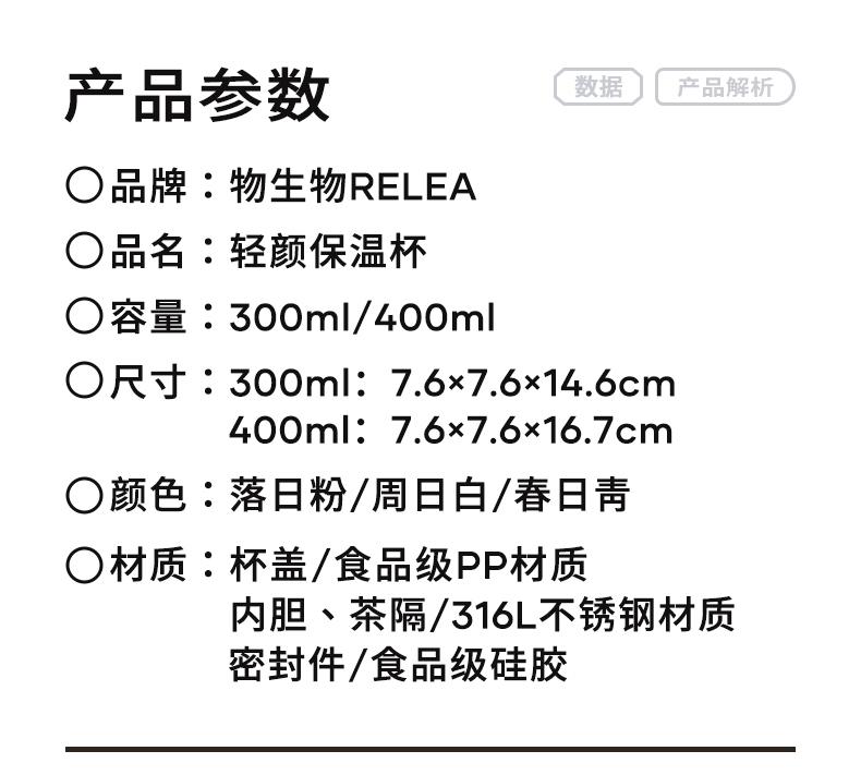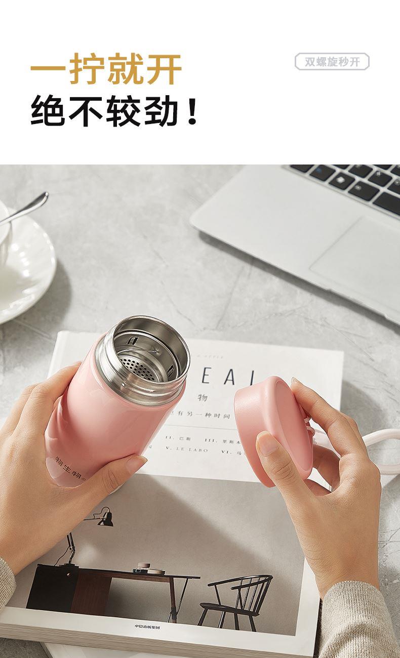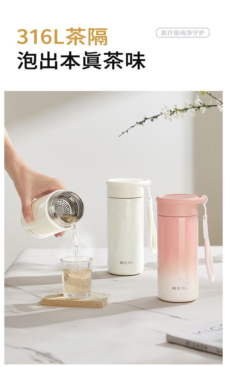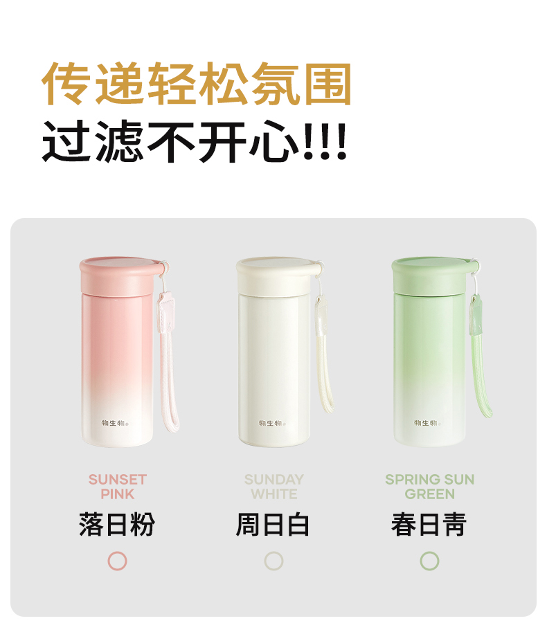 颜色:周日白 落日粉 容量:300ml/400ml 材质:杯盖/食品级pp材质 内胆,茶隔/316L不锈钢 密封胶/食品级硅胶 尺寸300ml:7.6*7.6*14.6 400ml:7.6*7.6*16.7 ①316L内胆耐腐蚀无异味 ②迷你杯身,便携提手 ③316L茶隔过滤茶渍易清洗 此报价为300ml
