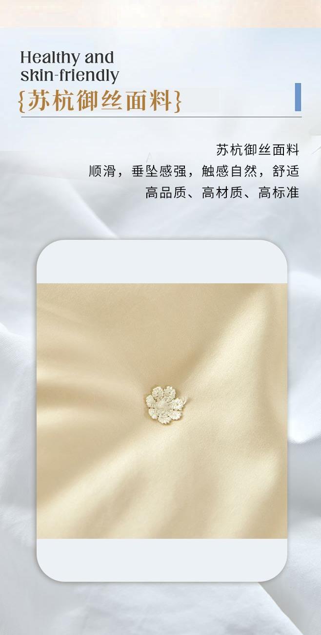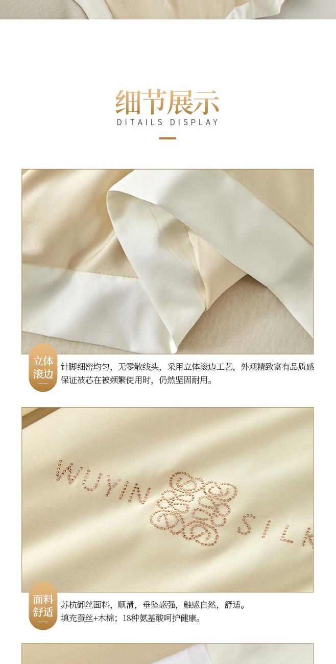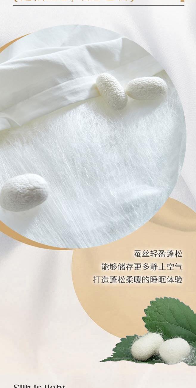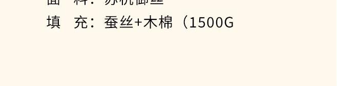 规 格:200×230(±2)cm 克 重:2500g 面 料:苏杭御丝 填 充:蚕丝+木棉(1500g) 高密度苏杭御丝绸面料,紧实,有质感,有光泽。 填充蚕丝,蚕丝的十八种氨基酸,对人体无微不至的呵护。 高品质、高材质、高标准,一款对生活高度负责的产品