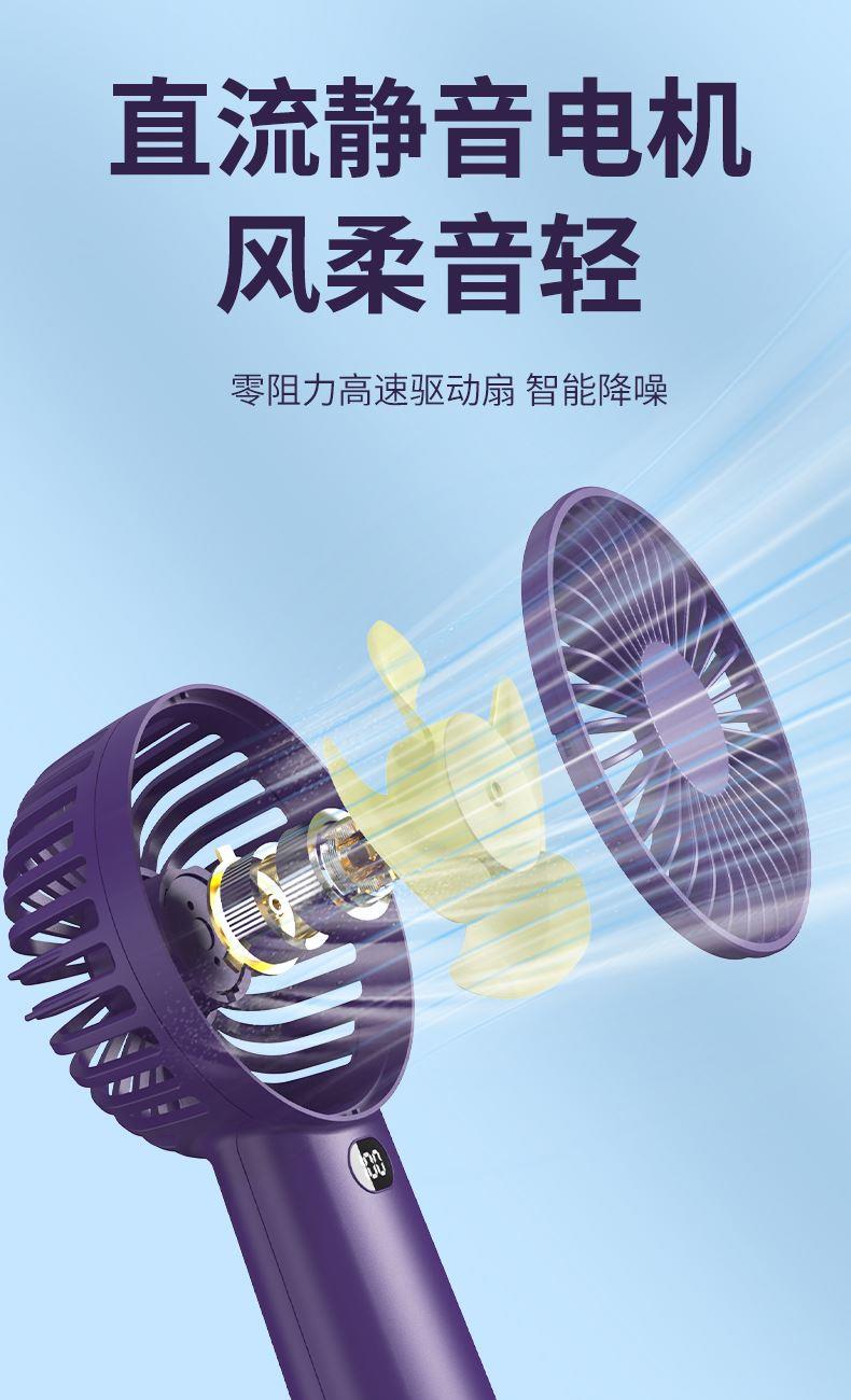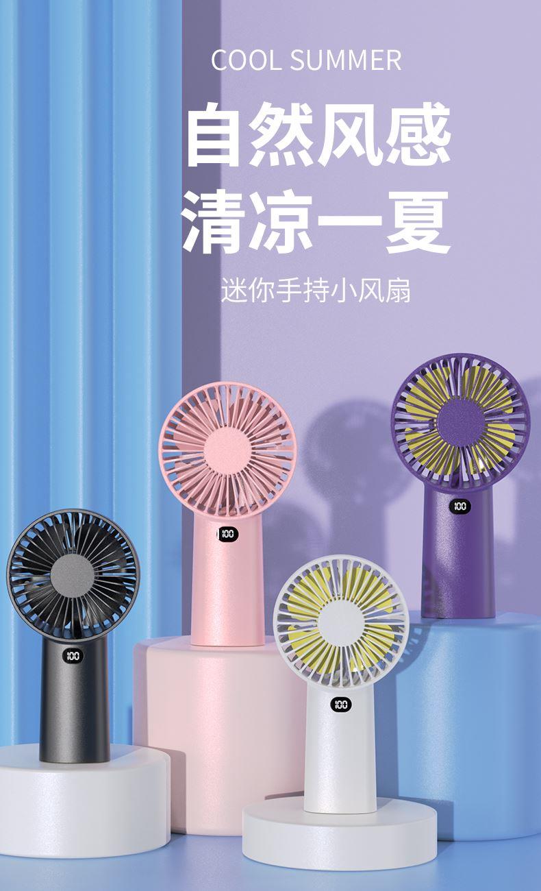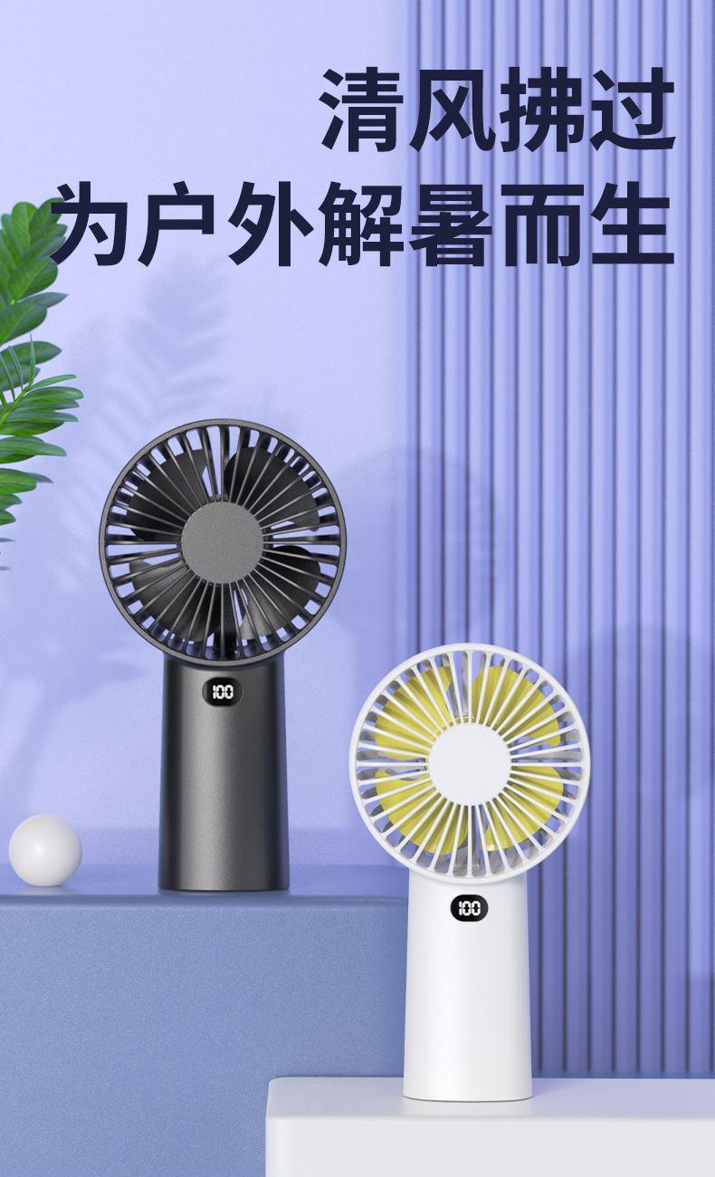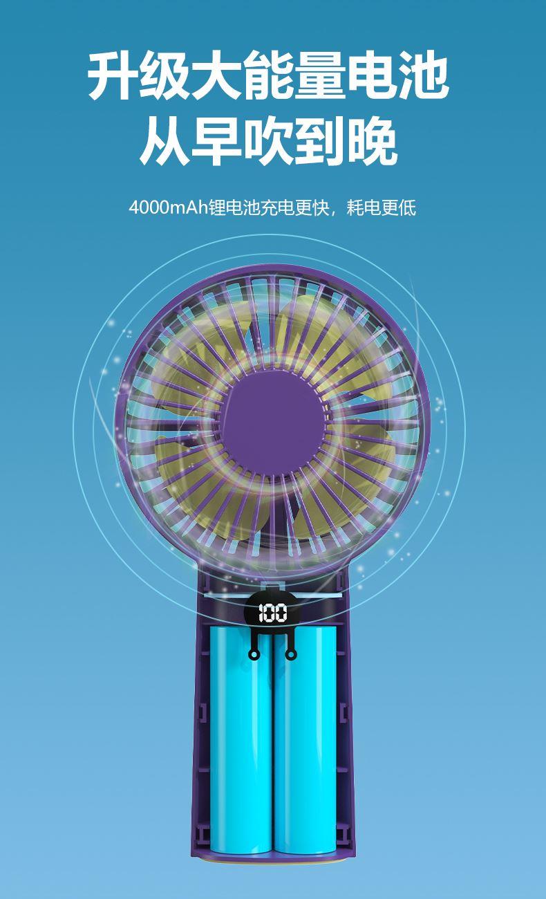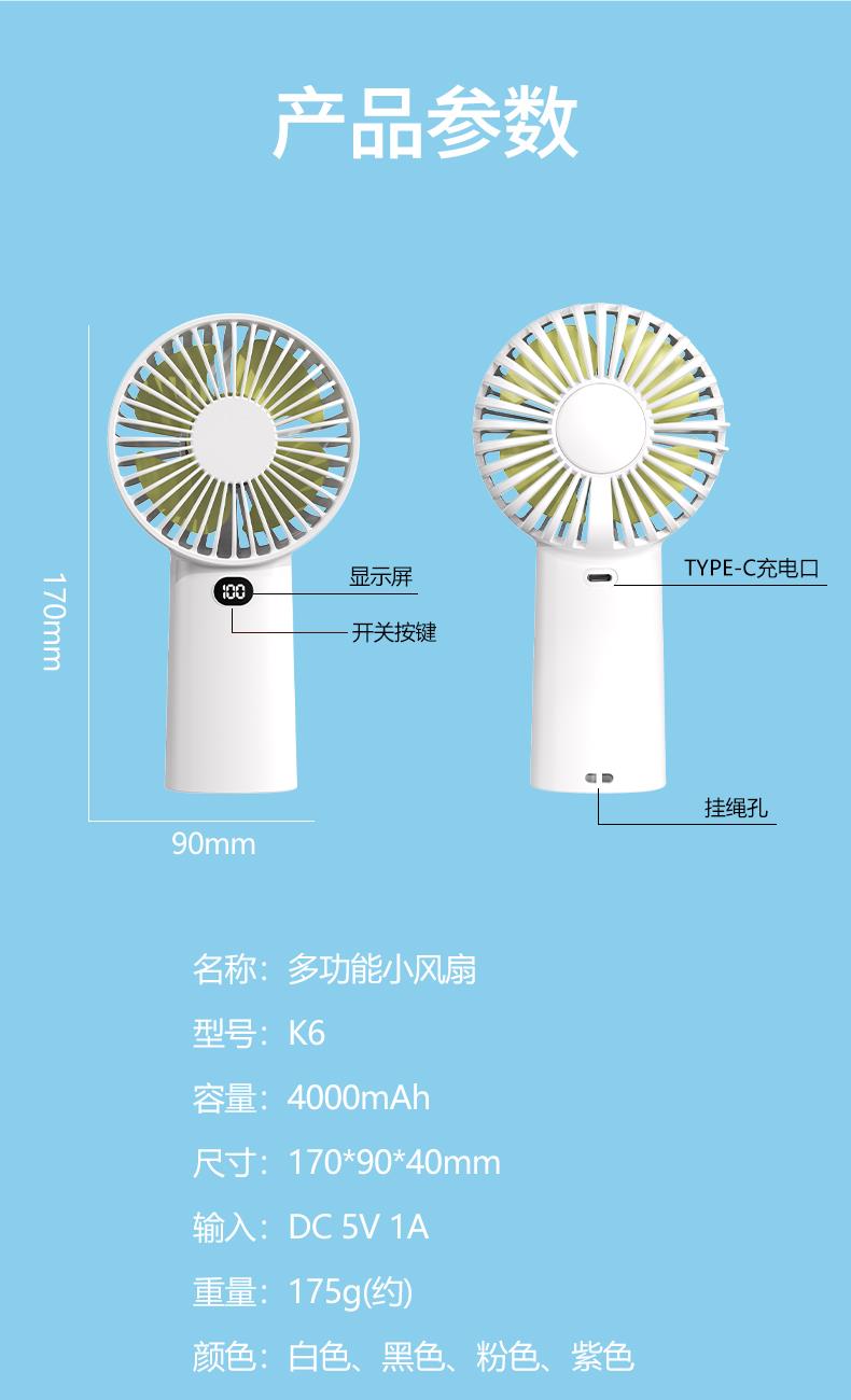产品材质:ABS 产品功能:5档风力调节 产品容量:4000mAh 产品尺寸:210*100*37mm 产品颜色:白色,粉色,紫色,黑色 智能数显设计,剩余电量一目了然;采用高性能锂电池,4000毫安大容量,续航更持久;无刷电机,更静音,使用寿命更长。5档风力调节。定制logo面积大。