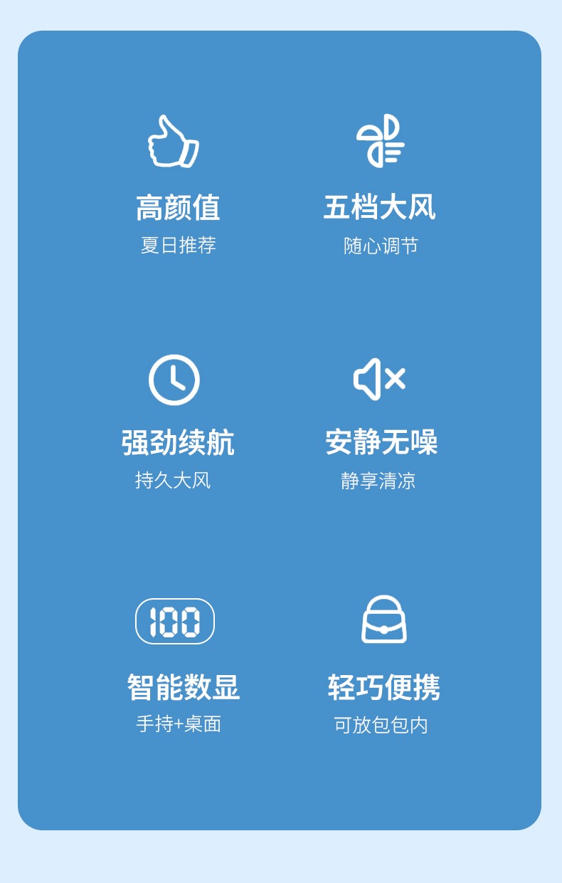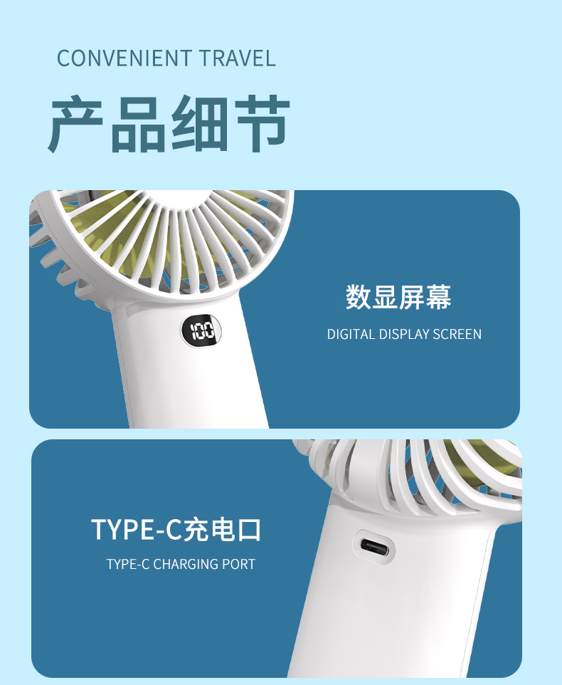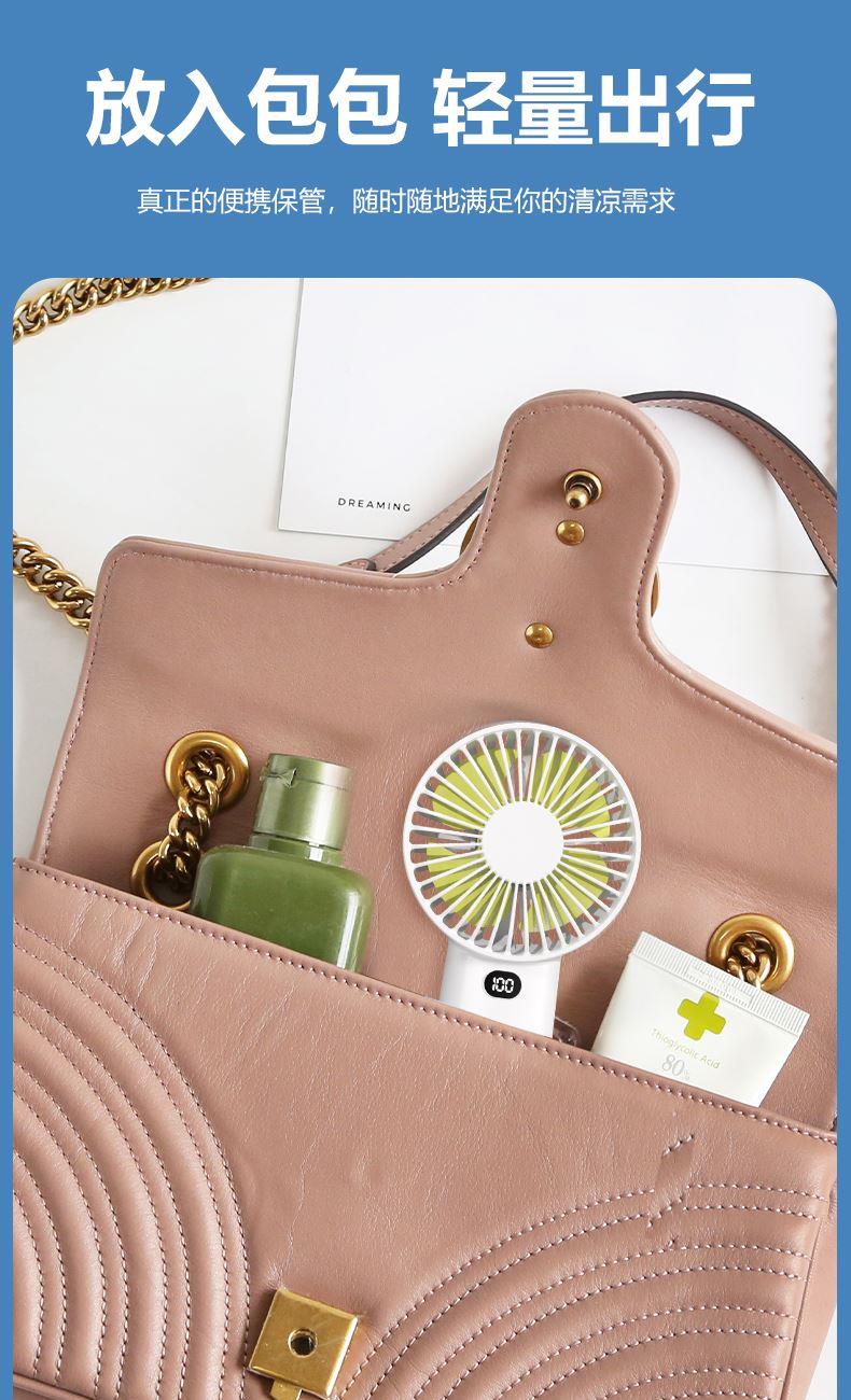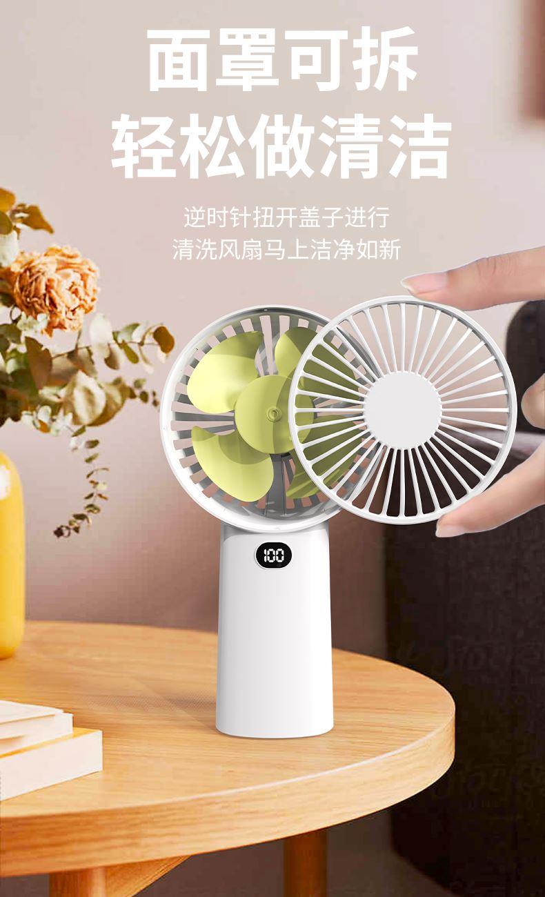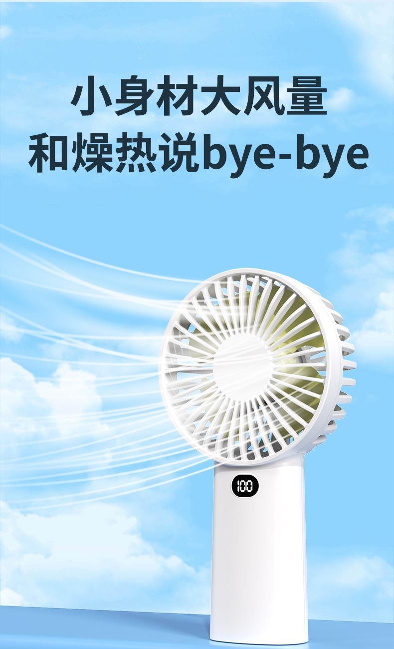 产品材质:ABS 产品功能:5档风力调节 产品容量:4000mAh 产品尺寸:210*100*37mm 产品颜色:白色,粉色,紫色,黑色 智能数显设计,剩余电量一目了然;采用高性能锂电池,4000毫安大容量,续航更持久;无刷电机,更静音,使用寿命更长。5档风力调节。定制logo面积大。
