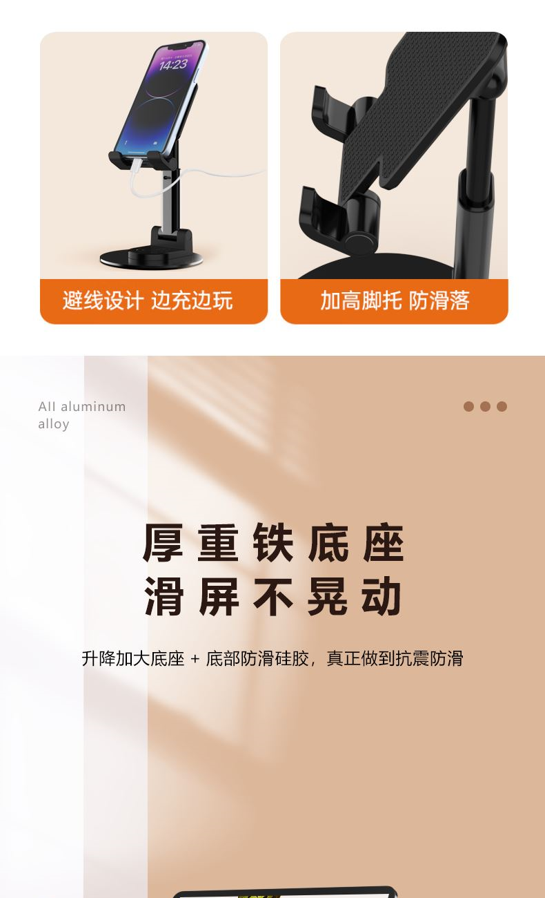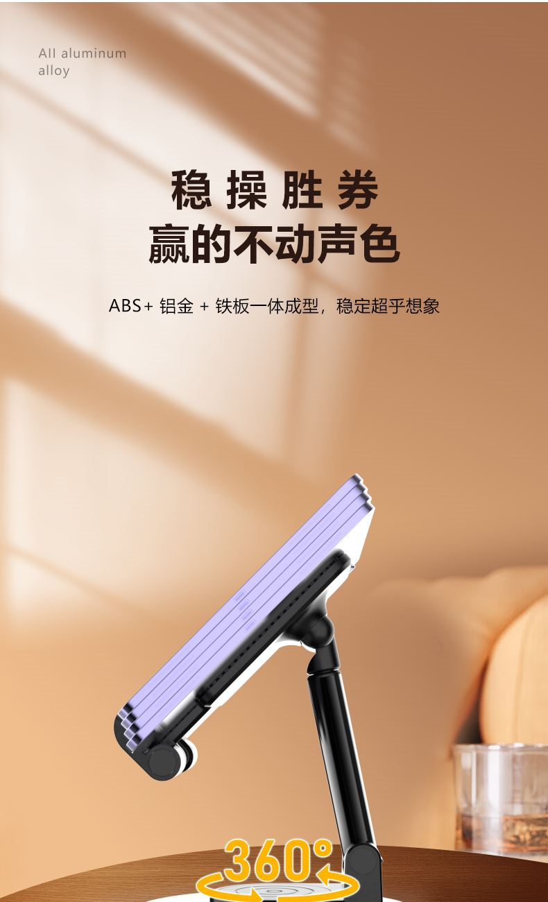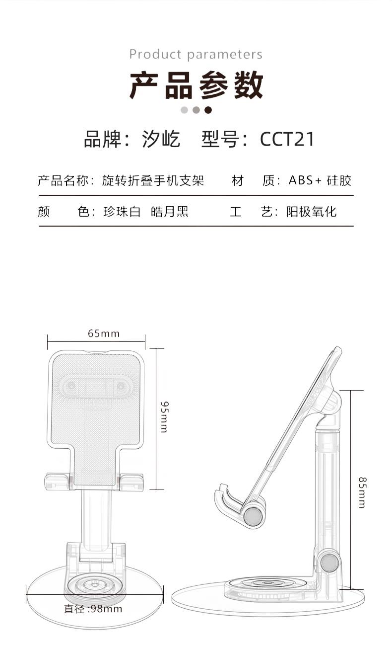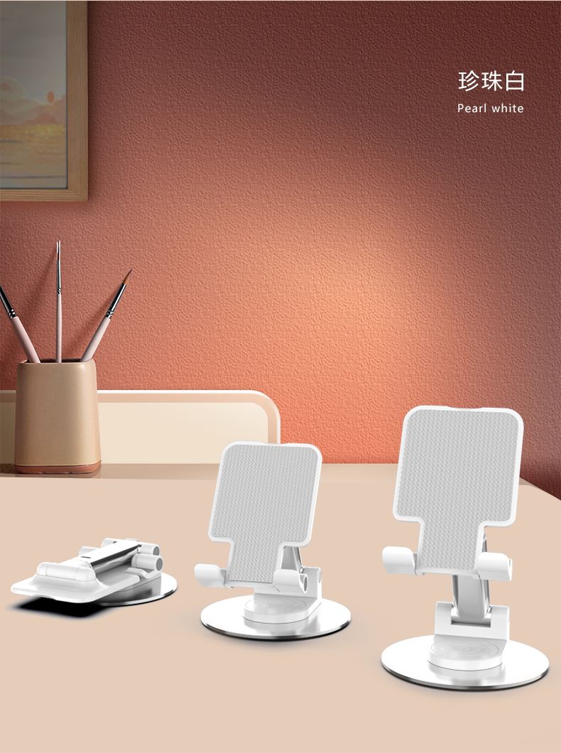 颜色:白色,黑色 材质:ABS+硅胶+金属 尺寸:122*9.8*2.9mm(折叠尺寸) 重量:约180g 适用机型:手机、平板电脑、iPad等 包装尺寸:126*100*33mm(环保牛皮纸盒) 产品卖点:360°旋转,折叠便携,高度可调,自由伸缩,加厚硅胶,加重底座,防止滑动。