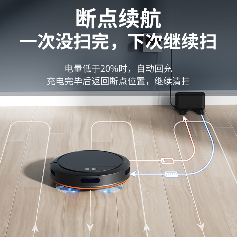 手机App功能:wifi远程控制、启动开关,定时预约,方向控制、强力清扫、定点清扫,返航回充,手机APP,定时功能,自动回充,带水箱拖地功能; 小吸口聚拢吸力更强劲; 自带陀螺仪计步器,线路弓字规划,沿边清扫,不漏死角; 后驱动行驶,加大轮子功耗低,地毯可行走,轻松爬越; 电子感应避障,低噪音,高性价比