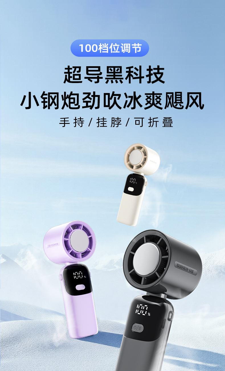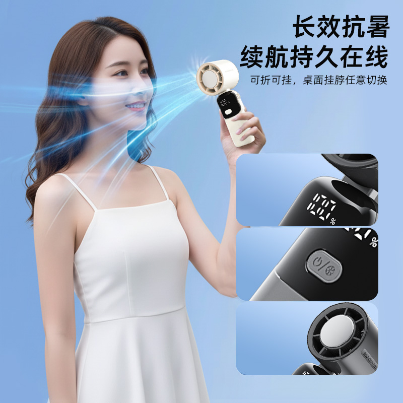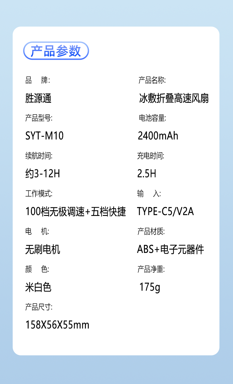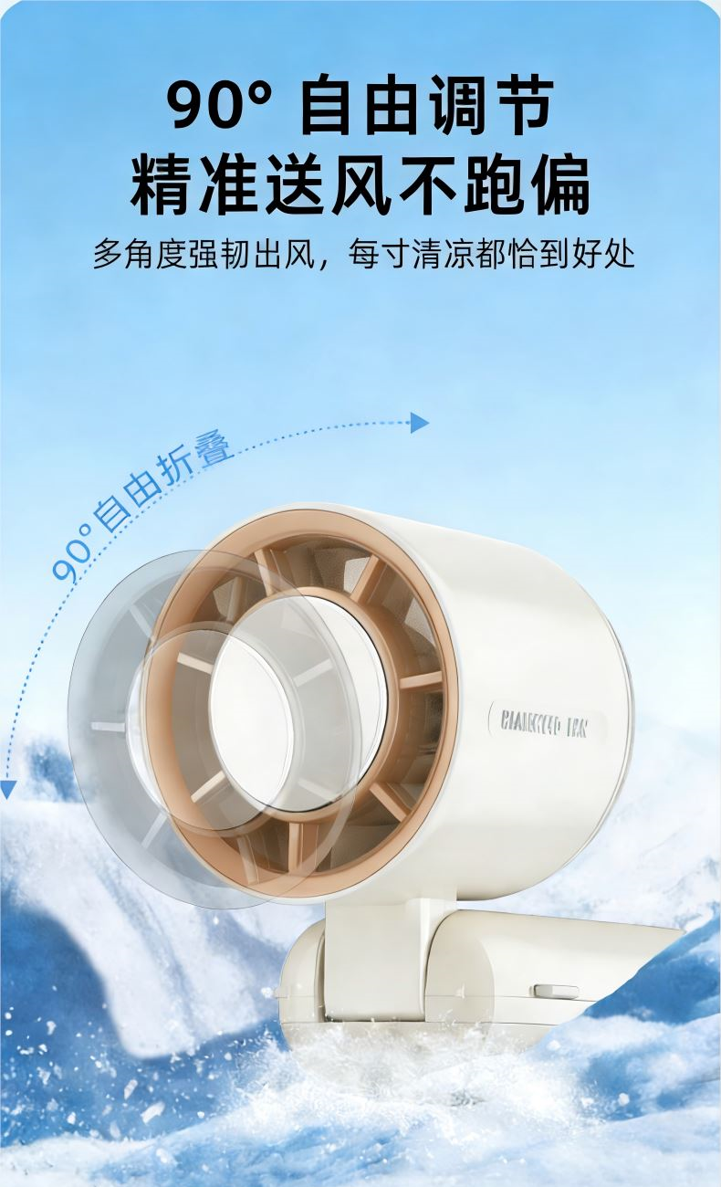 电池容量:2400mAh 续航时间:约3-12H 充电时间:2.5H 工作模式:100档无极调速+五档快捷 输 入:TYPE-C 5/V2A 电 机:无刷电机 产品材质:ABS+电子元器件 颜 色:米白色 电机转速:10500转,产品风量100档可调,半导体制冷,可折叠高颜值,大风力,长续航,2400mAh大容量电池,超大风 无级变速 静音 涡轮增压出风设计,续航快充,双顶配,TYPE-C接口快速充电。