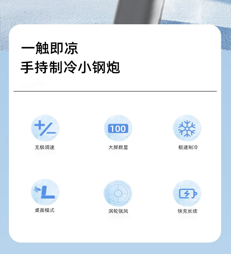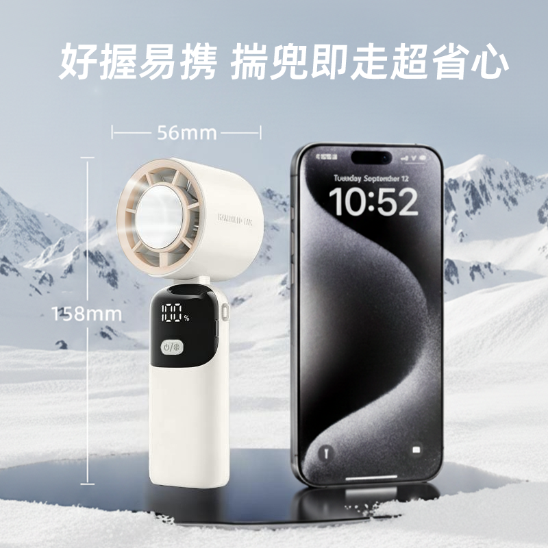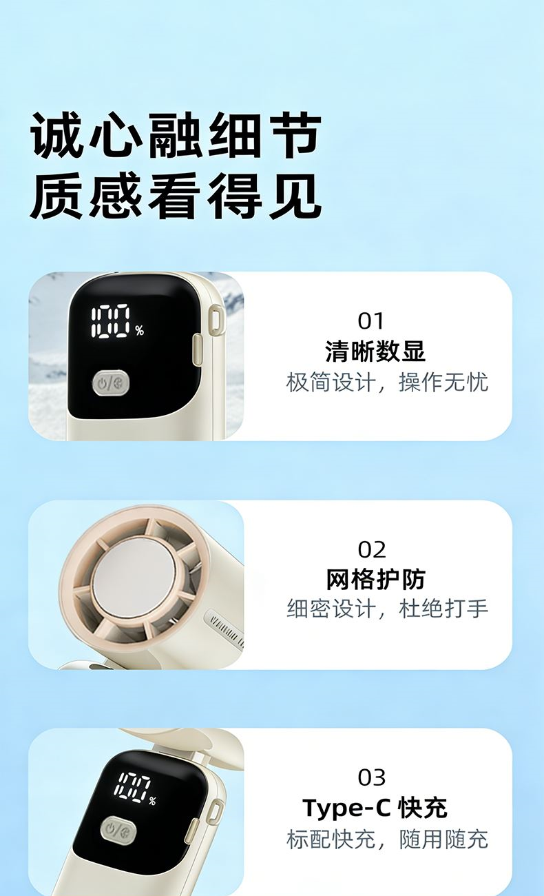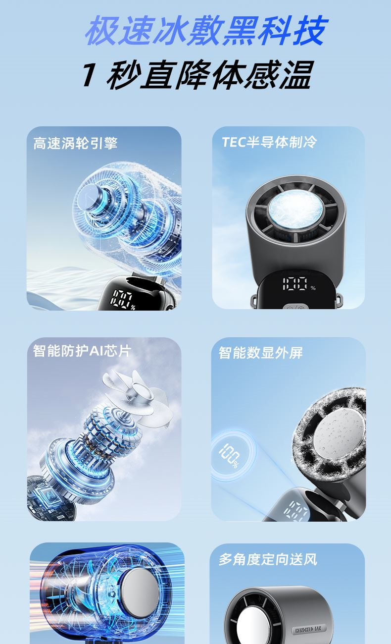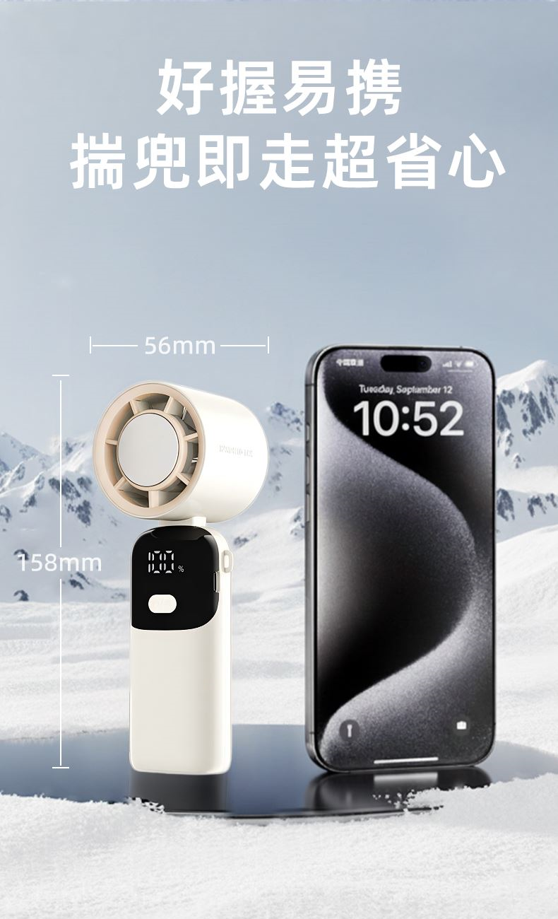 电池容量:2400mAh 续航时间:约3-12H 充电时间:2.5H 工作模式:100档无极调速+五档快捷 输 入:TYPE-C 5/V2A 电 机:无刷电机 产品材质:ABS+电子元器件 颜 色:米白色 电机转速:10500转,产品风量100档可调,半导体制冷,可折叠高颜值,大风力,长续航,2400mAh大容量电池,超大风 无级变速 静音 涡轮增压出风设计,续航快充,双顶配,TYPE-C接口快速充电。