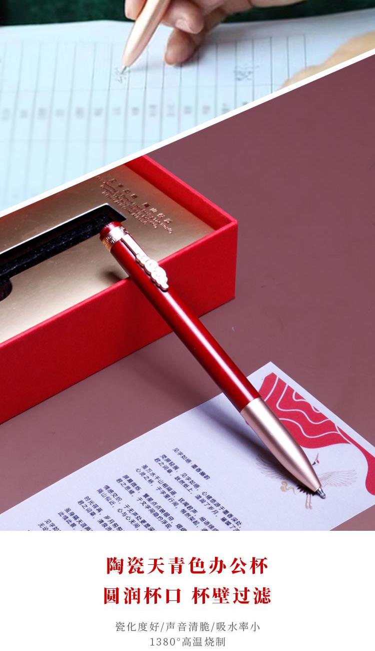 配置 文享办公瓷杯 颜色:天青色 锦云签字笔*1 颜色 红花梨木色 锦翼笔记本*1 颜色红色/黑色 手提袋套*1 精装礼盒手提袋*1 材质 办公杯:德化白瓷 签字笔:红花梨木-笔头铜管笔夹锌合金镀金 笔记本:皮革千越象牙白纸100克80张 定制工艺 激光 镭射 印刷 烫压印 尺寸 笔记本:130*212mm 签字笔:141*10mm 礼盒:245*345*110mm