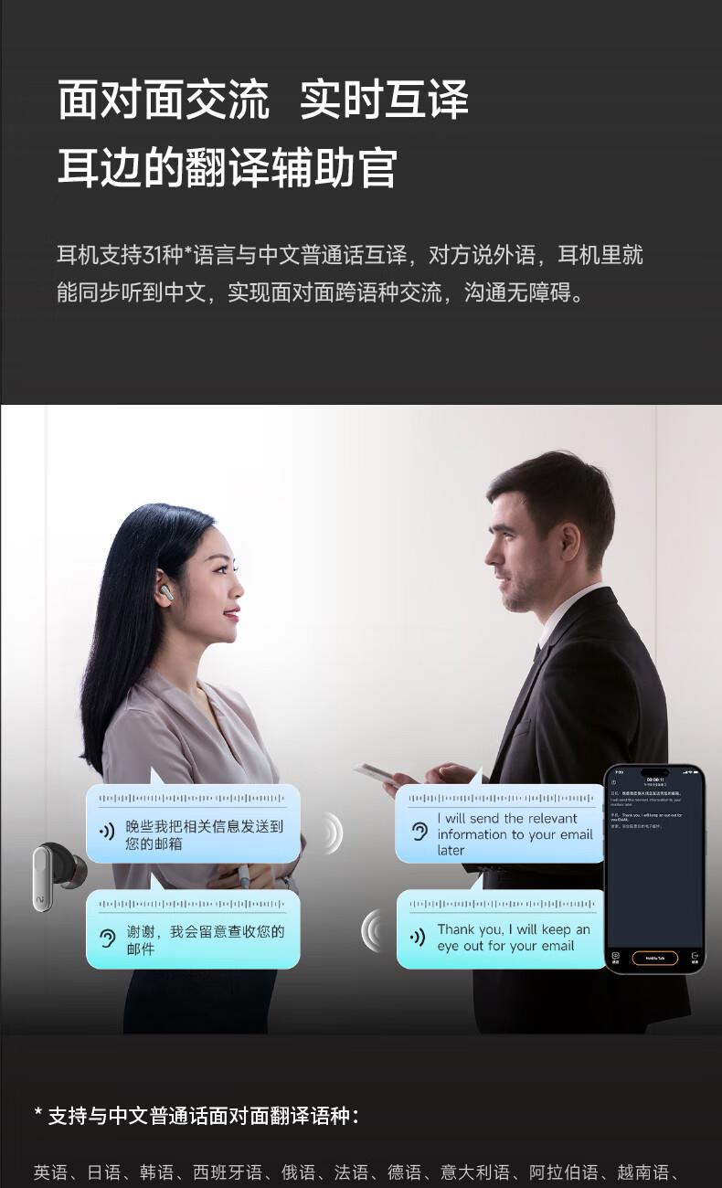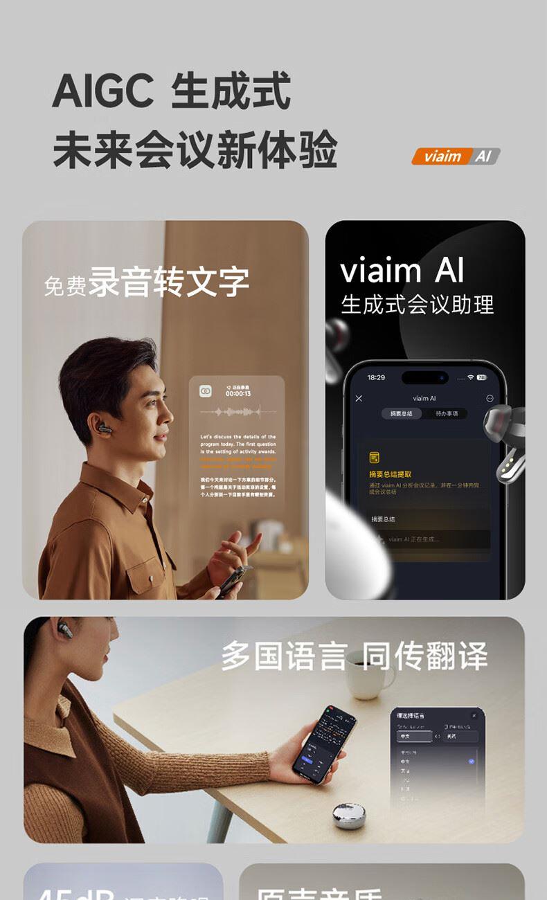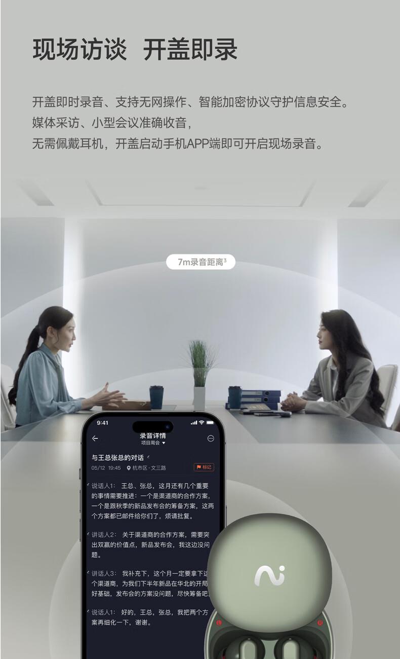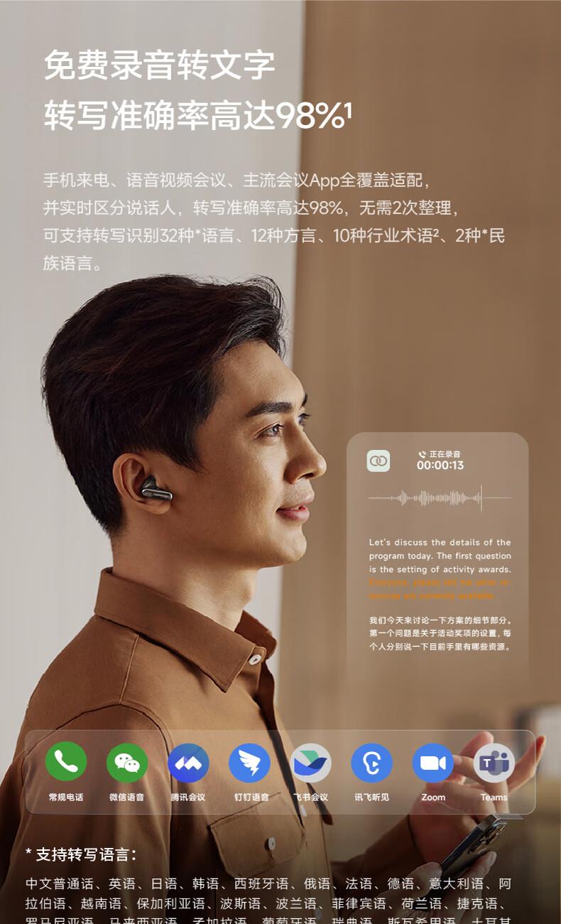 录写译听说一体 录音转文字:手机通话、微信语言等8大平台 摘要总结:现场访谈,开盖即可录音,生成摘要 45db深度降噪,秒变休息室 长按开启闪录,私人助理 9国语言互译 40h小时超长续航 空气感佩戴