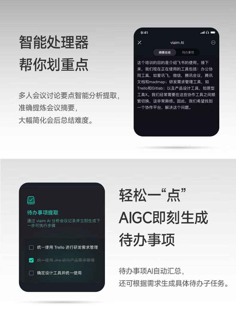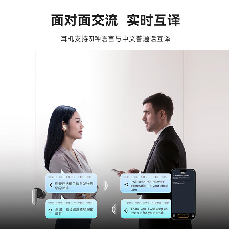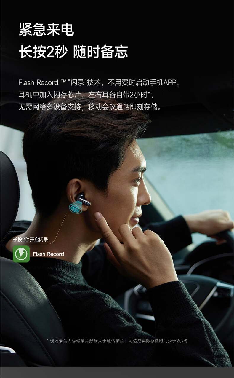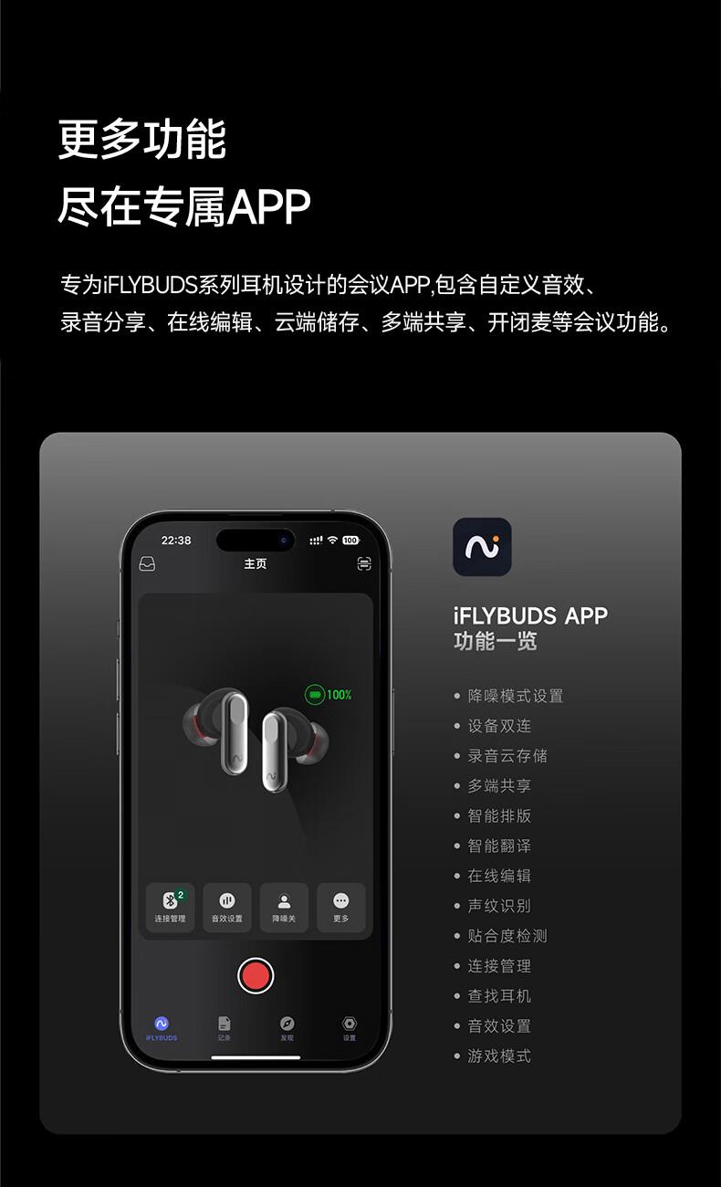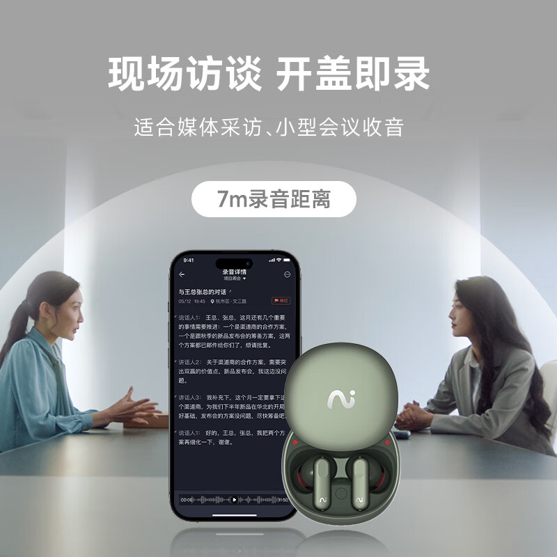 录写译听说一体 录音转文字:手机通话、微信语言等8大平台 摘要总结:现场访谈,开盖即可录音,生成摘要 45db深度降噪,秒变休息室 长按开启闪录,私人助理 9国语言互译 40h小时超长续航 空气感佩戴