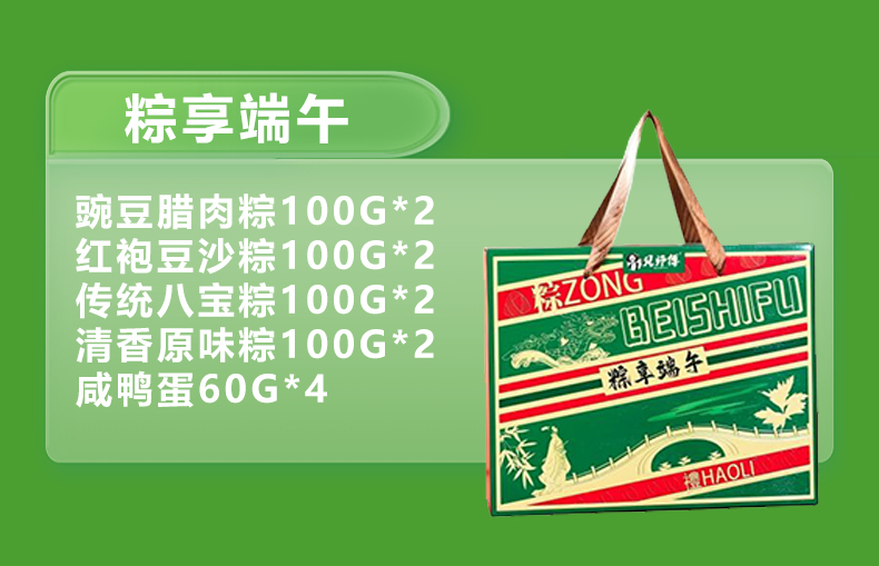 配置: 豌豆腊肉粽100g*2 红袍豆沙粽100g*2 传统八宝粽100g*2 清香原味粽100g*2 高邮咸鸭蛋60g*4 推荐理由: 一盒藏四味,咸甜皆圆满!内含腊香四溢豌豆腊肉粽、甜糯红袍豆沙粽、五谷八宝粽、清香原味粽各2只,配60g流沙高邮咸鸭蛋4枚,双倍鲜香佐餐。“粽享端午”跃然礼盒,贝师傅匠心加持,点亮佳节。赠礼有品,自留有味,咸甜交织包裹安康,端午心意“盒”盘托出!