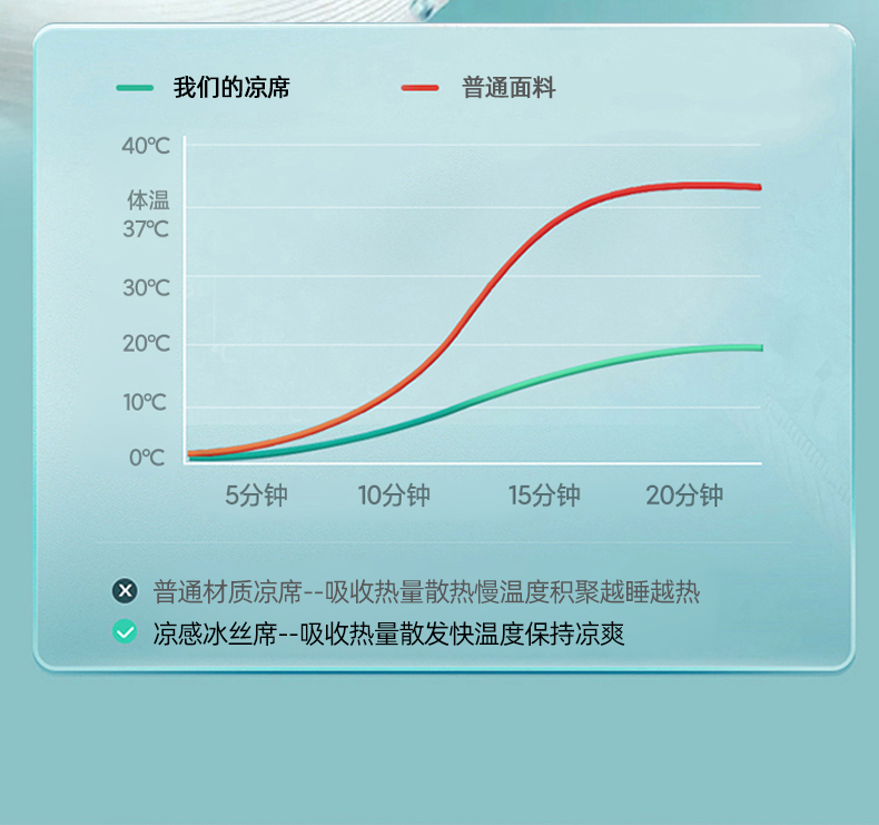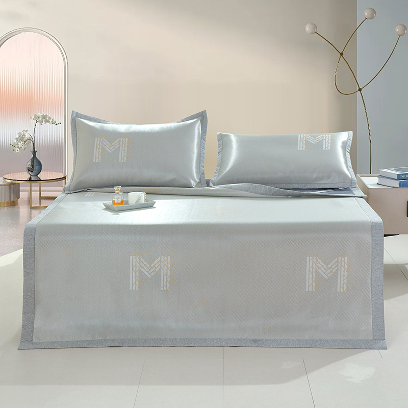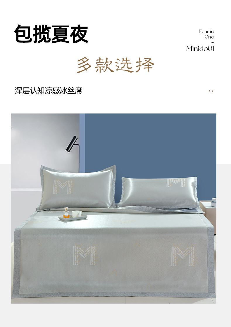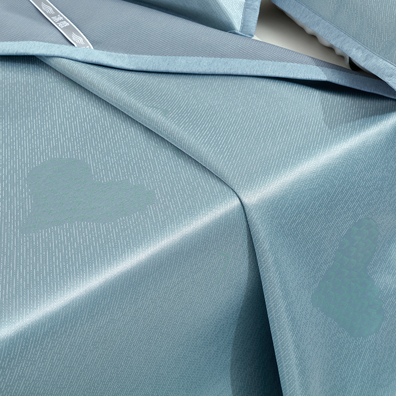 格:180*200cm 枕套:48*74cm*2 面料:碳光冰丝 复合料:三明治 执行标准:Q/TDY 01-2016 安全类别:GB18401-2010 B类 1.高密碳光冰丝席,自然清凉,凉而不冰,久睡不粘。 2.碳光凉感冰丝纤维织物本身经过处理,可以破坏细菌的寄生环境,有效防止细菌滋生进入,切断它们的食物链,洁净卫生,适合裸睡。