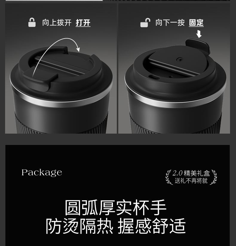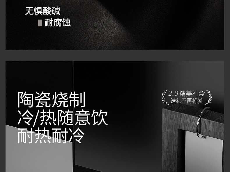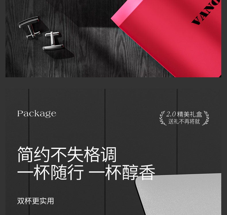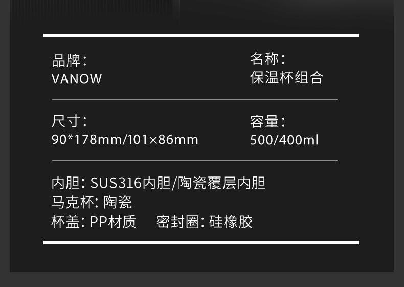 型号:VO-COF-B1TZ、VO-COF-B3TZ 颜色:耶加白,波盘黑 容量:500ml/400ml 尺寸:182*87mm/101*86mm 材质:SUS316不锈钢内胆/陶瓷覆层,陶瓷马克杯,硅橡胶,pp材质