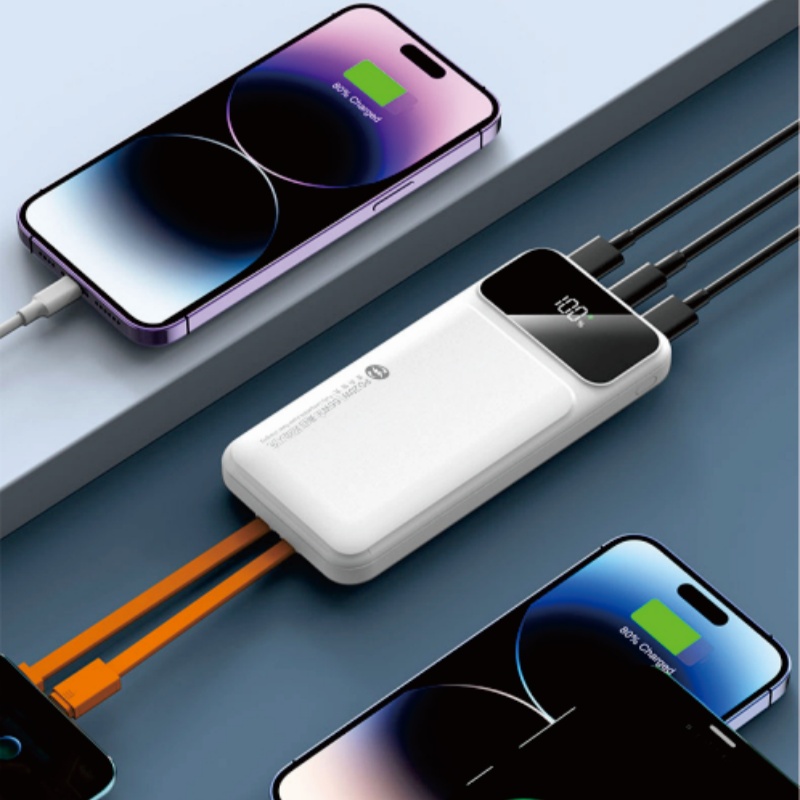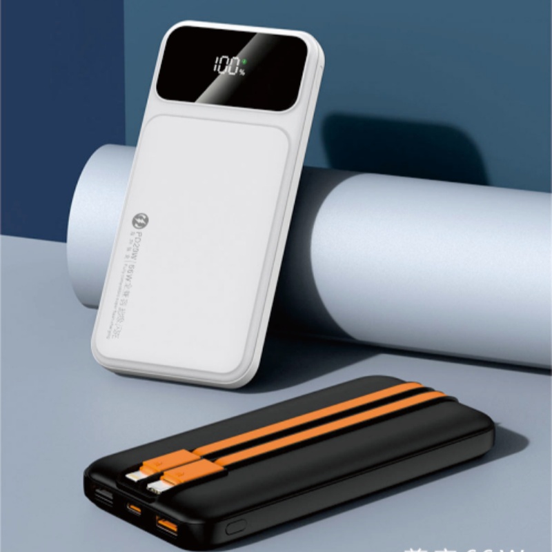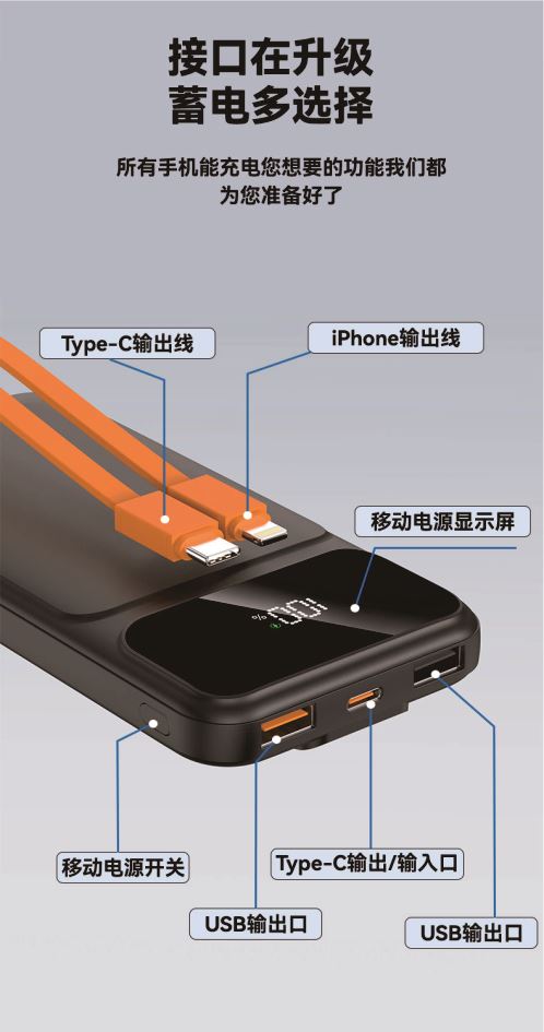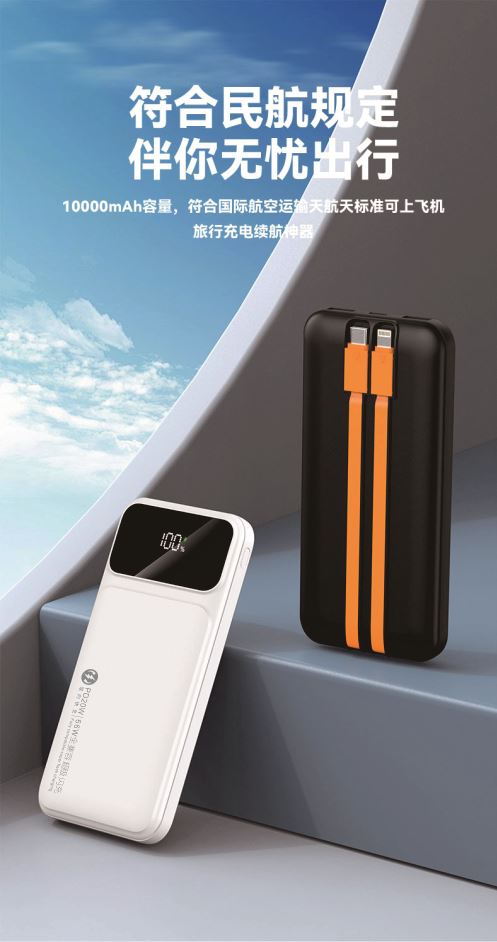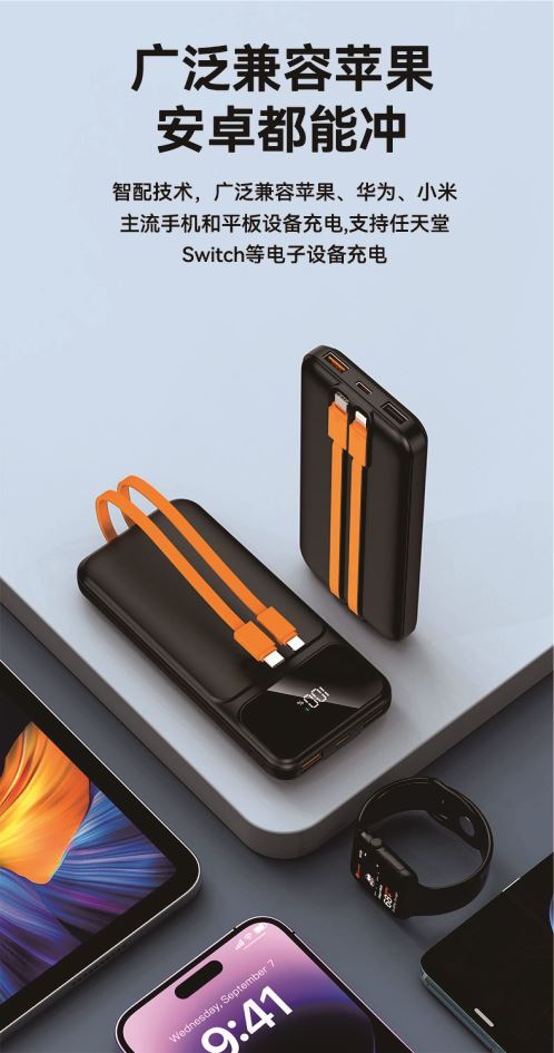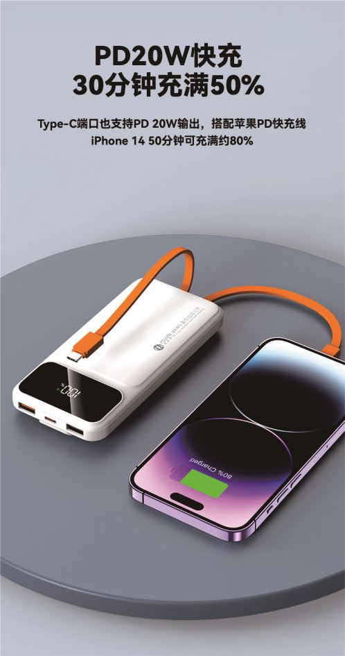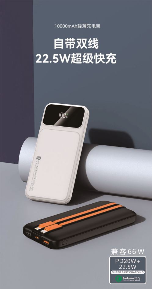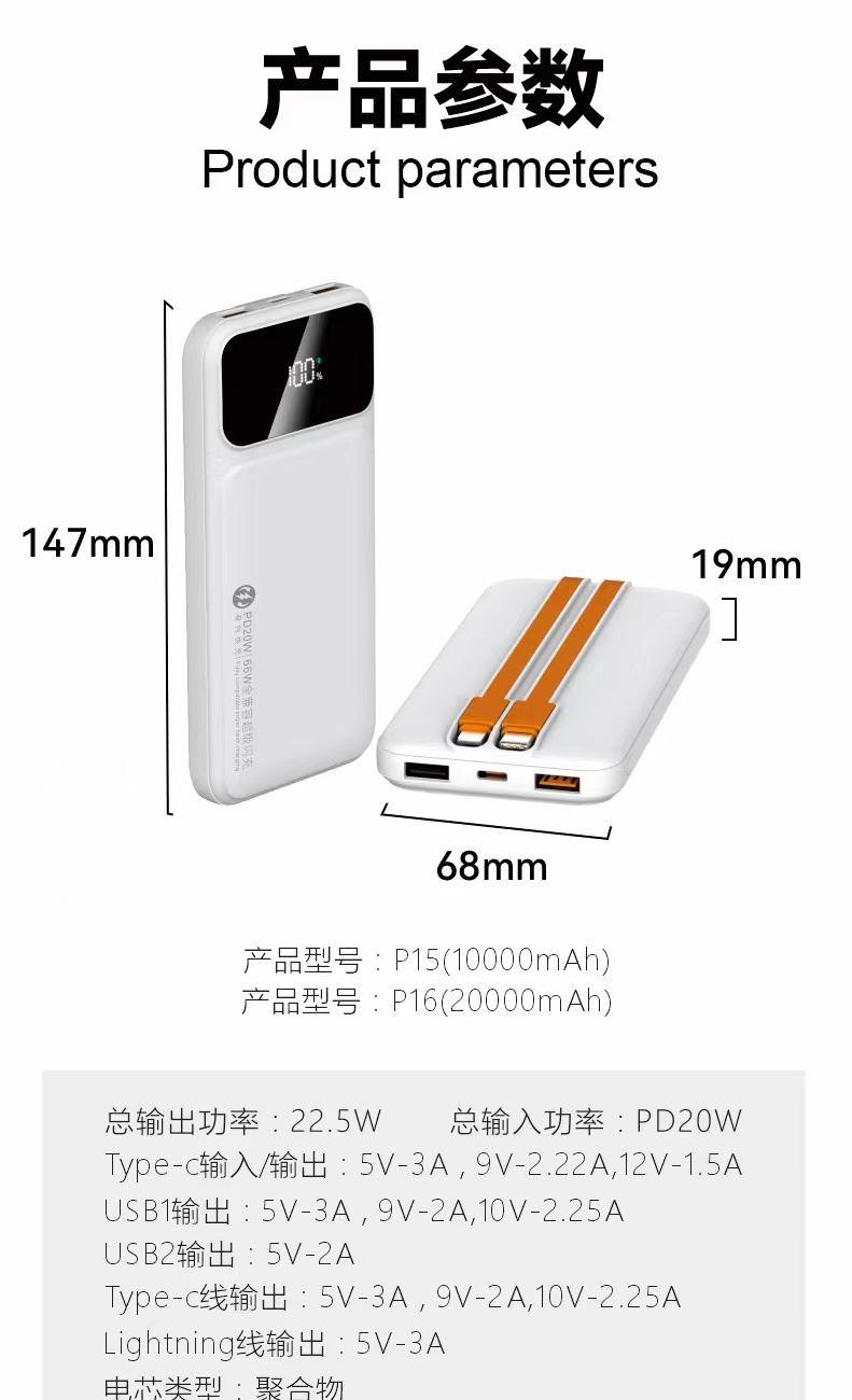 22.5W经典超级快充内置线移动电源 型 号: P15/P16/P17 电池 :聚合物*1pcs 电池类型 :聚合物电芯 容量:10000mAh/20000mAh/30000mAh 材质 :ABS+PC 尺寸 :147*19*68MM 颜色 :白色 /黑色 功能特点 简约设计风格,时尚大气; 22.5W超级快充,迅速充电; 10000mAh锂电池,澎湃动力; 自带苹果和Type-C充电线; 一输入三输出,支持苹果15手机 智能数显查看电量