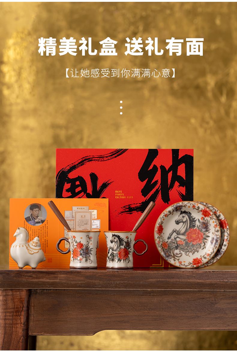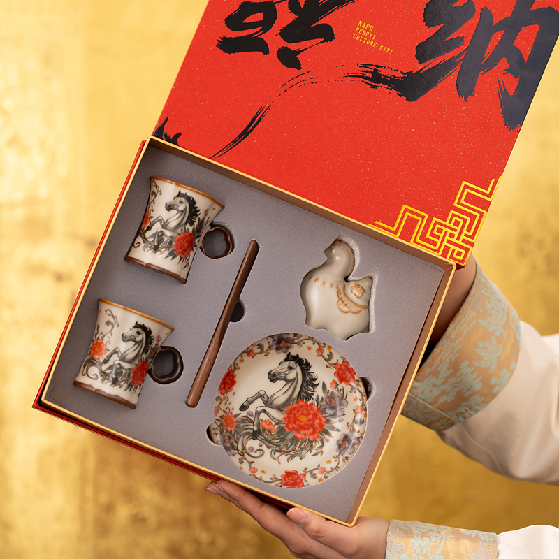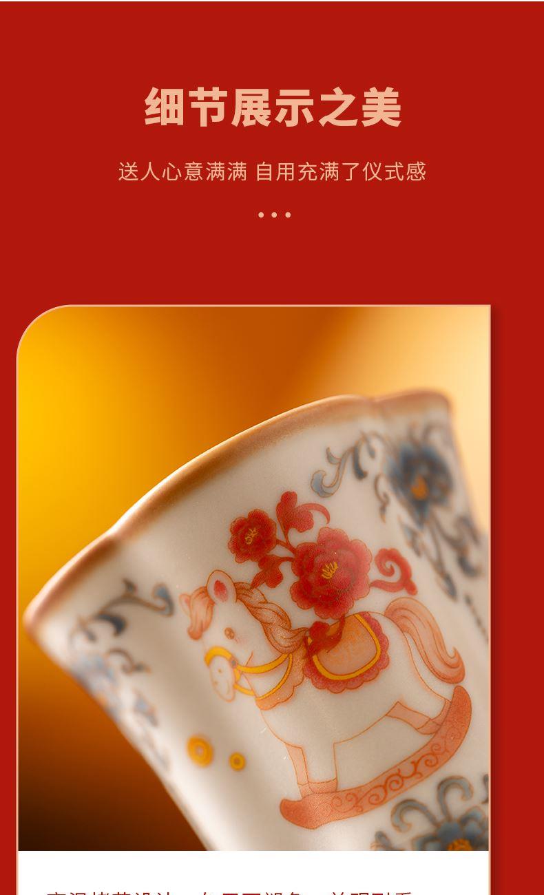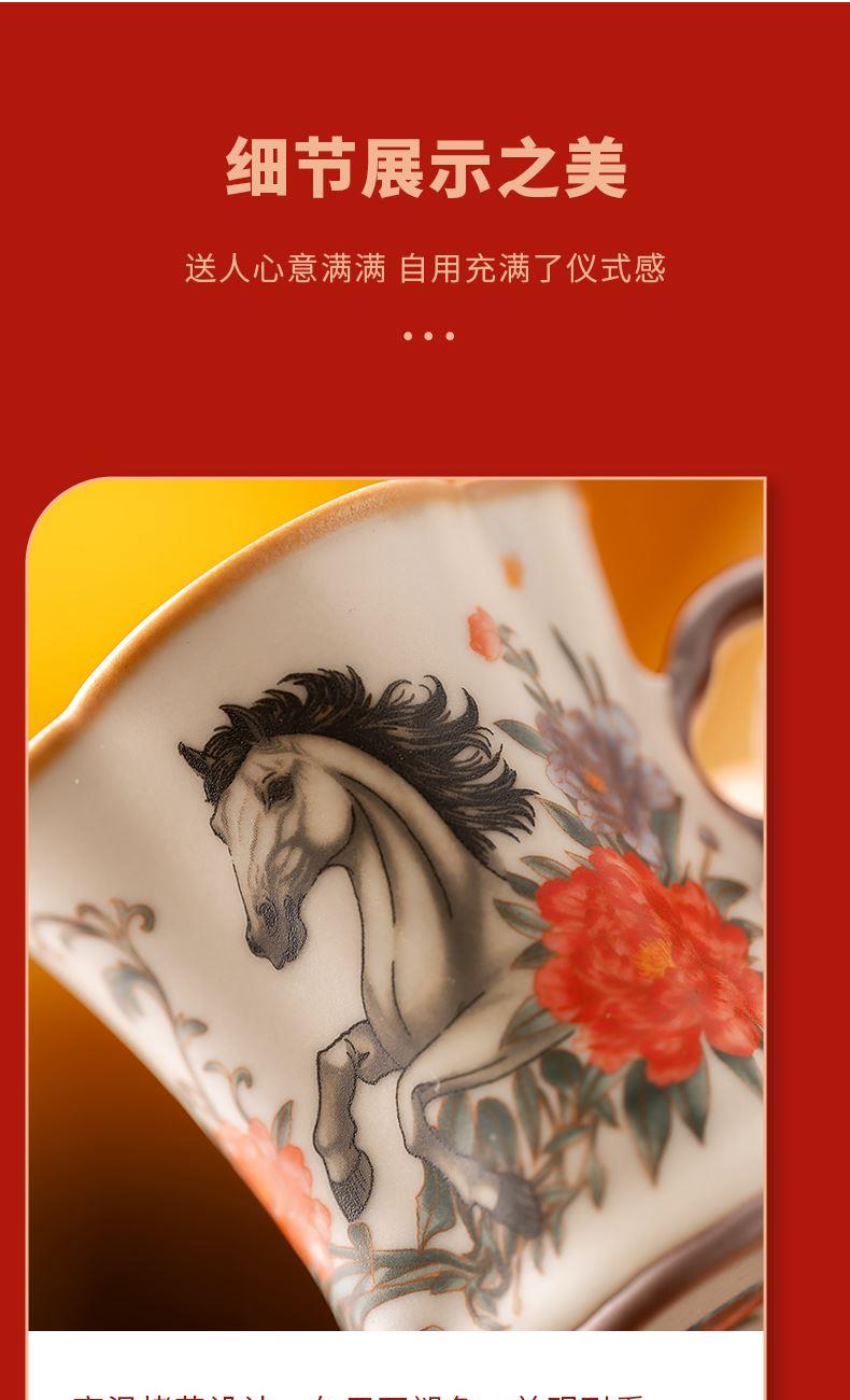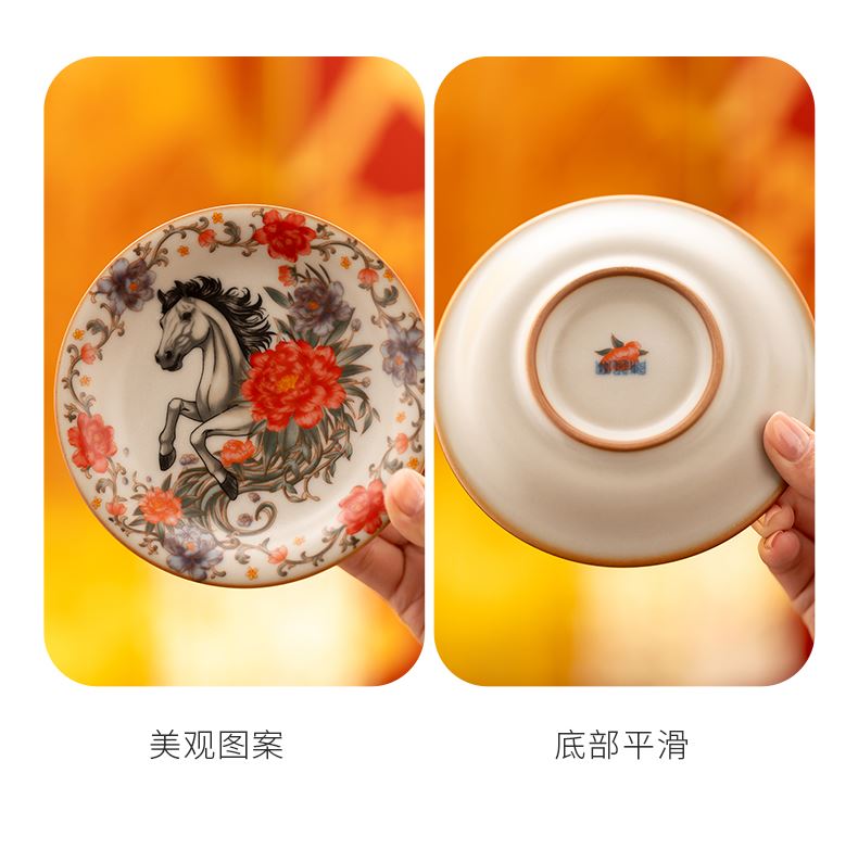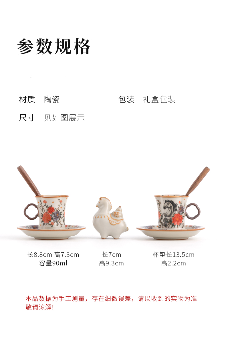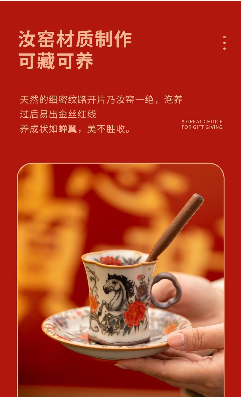 配 制:2杯 2盘 2实木搅拌棒 1摆件 1收藏证书 1礼盒 手提袋 材质:汝黄瓷 胡桃木 规格:杯子8.8*7.3cm 碟子直径13.5cm高2.2cm 摆件9.3*7cm 容量:杯子70ml 推荐说明:马上有钱,马到成功杯子摆件套装,马背上葫芦造型,寓意福禄,2盘精美大气。亚黄汝瓷,玛瑙入釉,蝉翼开片,内外皆有花面,家有千财万贯,不如汝窑一片。技术新品。画面堆料技术,富有立体浮雕质感,真实感强。杯身开片,可养瓷。