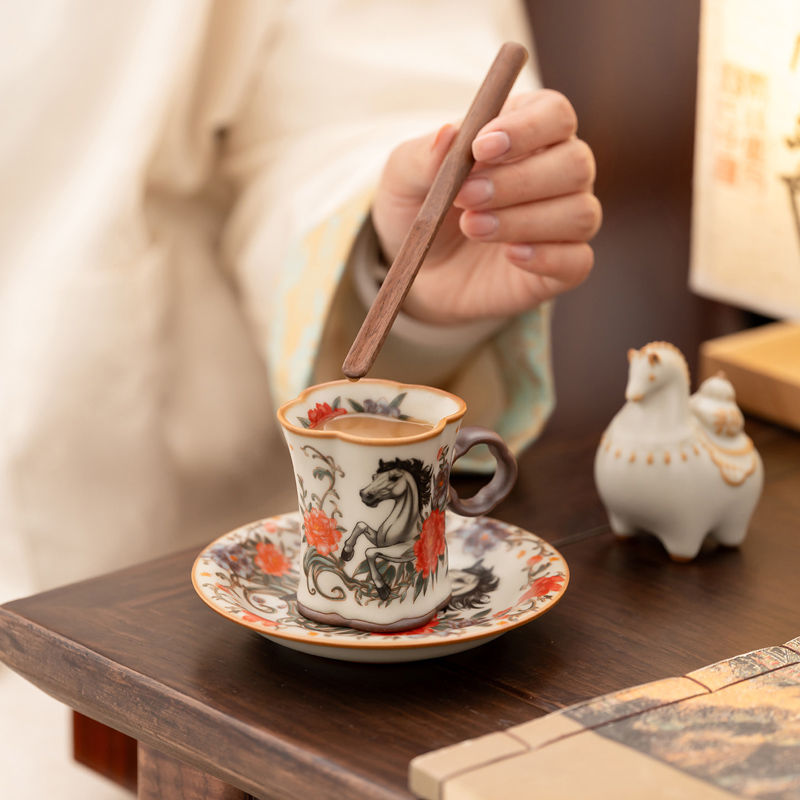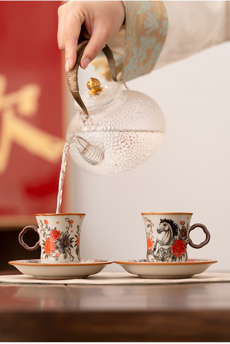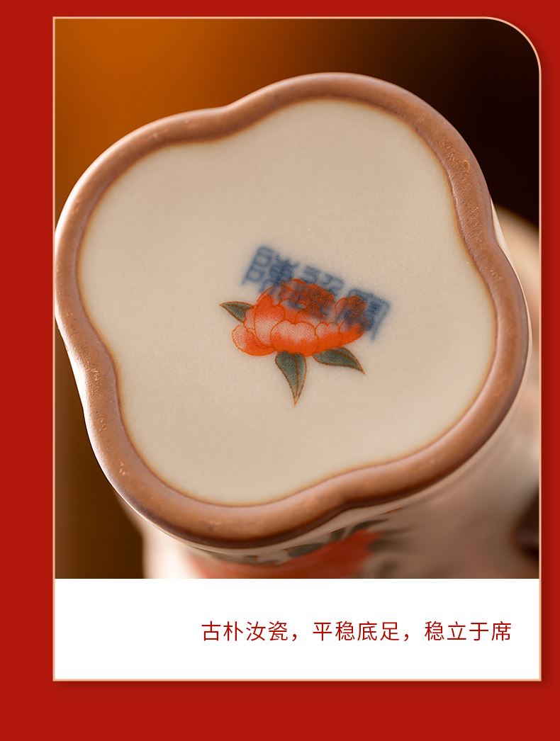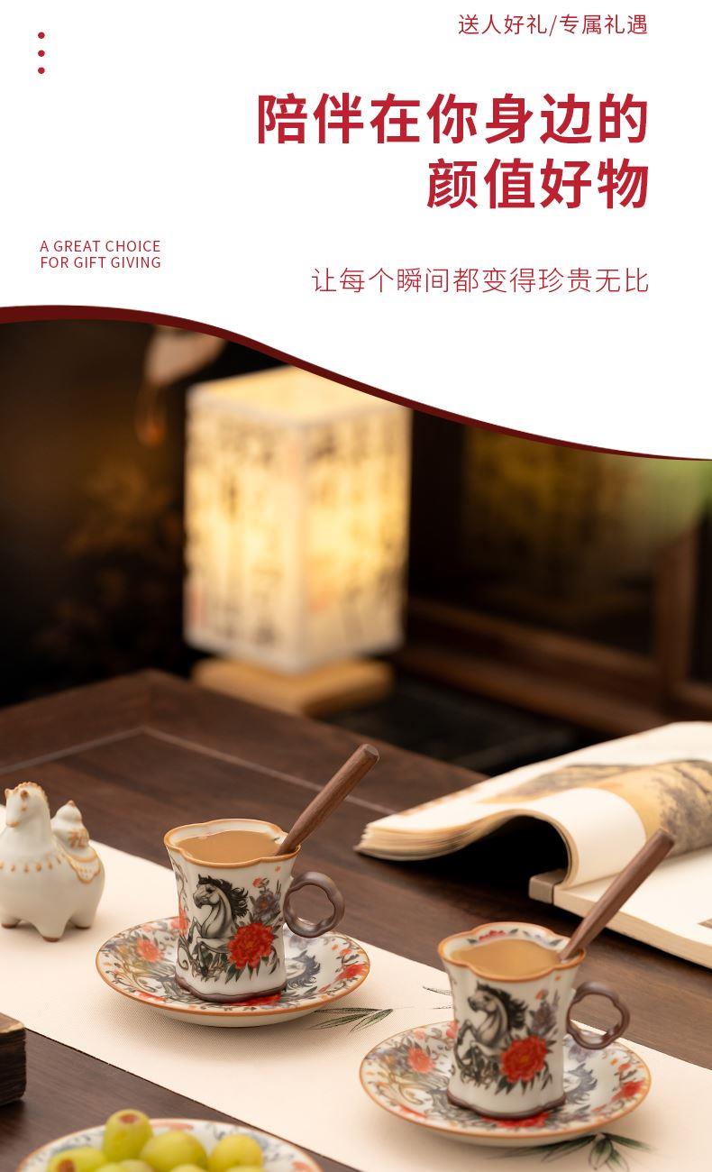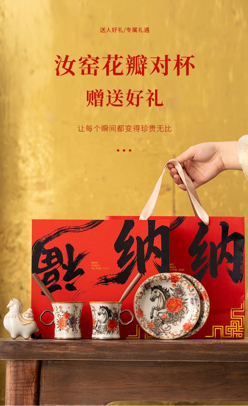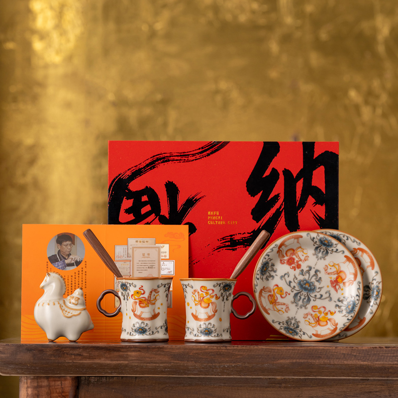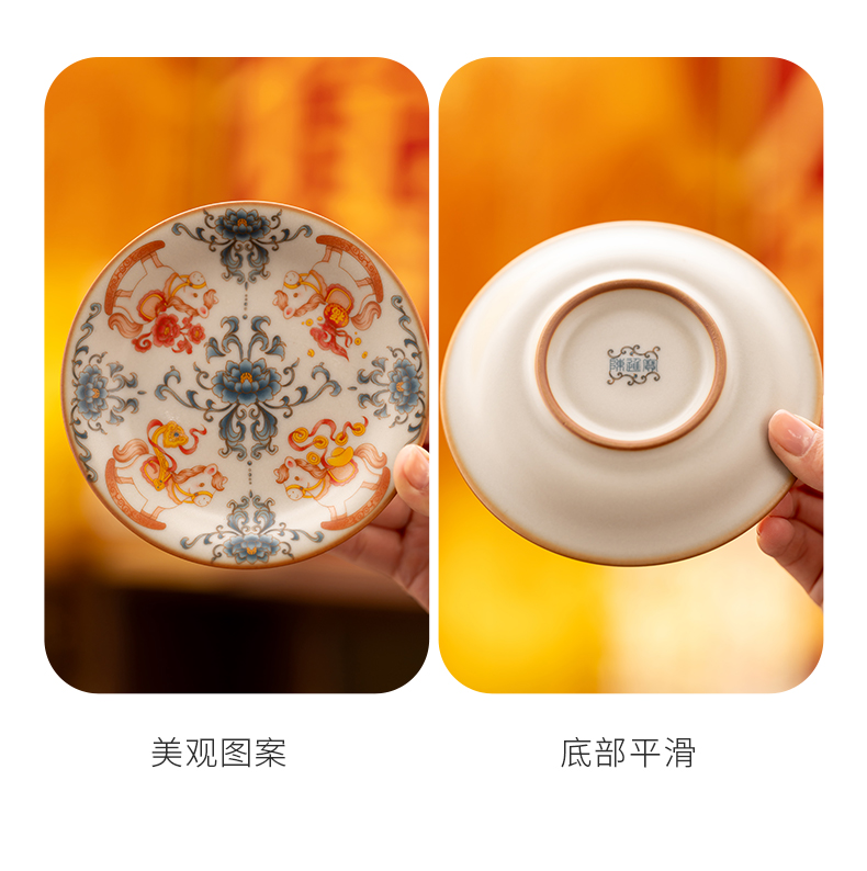 配 制:2杯 2盘 2实木搅拌棒 1摆件 1收藏证书 1礼盒 手提袋 材质:汝黄瓷 胡桃木 规格:杯子8.8*7.3cm 碟子直径13.5cm高2.2cm 摆件9.3*7cm 容量:杯子70ml 推荐说明:马上有钱,马到成功杯子摆件套装,马背上葫芦造型,寓意福禄,2盘精美大气。亚黄汝瓷,玛瑙入釉,蝉翼开片,内外皆有花面,家有千财万贯,不如汝窑一片。技术新品。画面堆料技术,富有立体浮雕质感,真实感强。杯身开片,可养瓷。