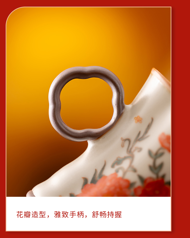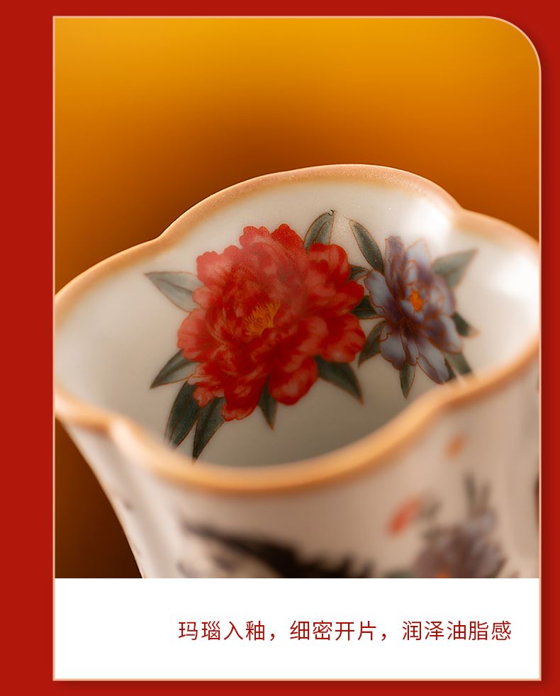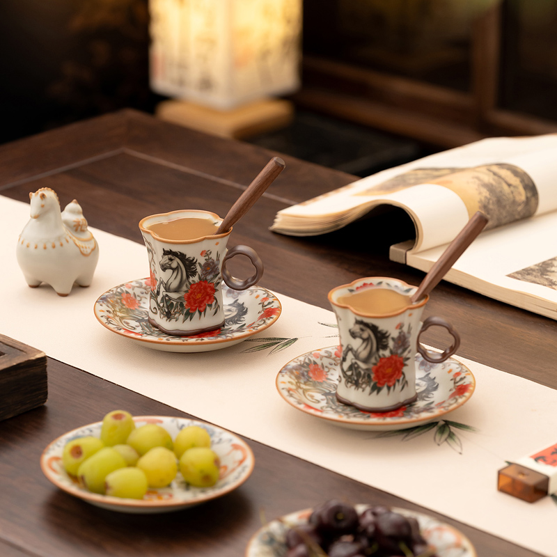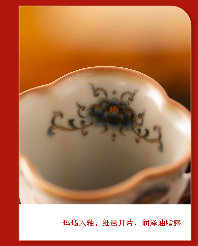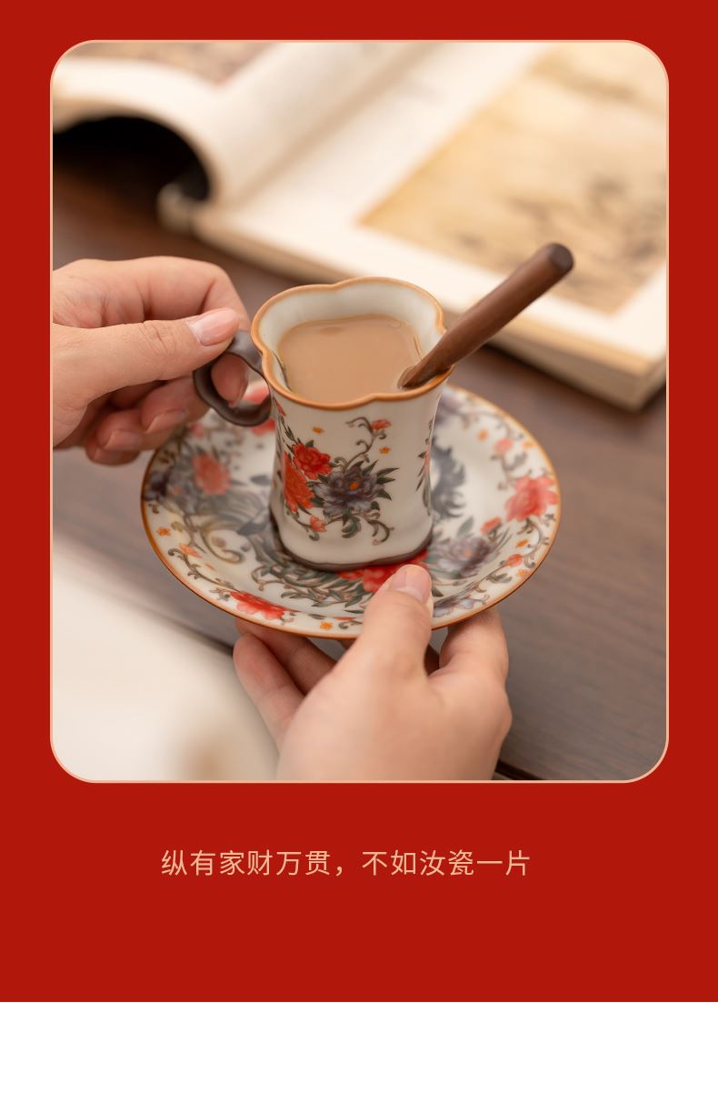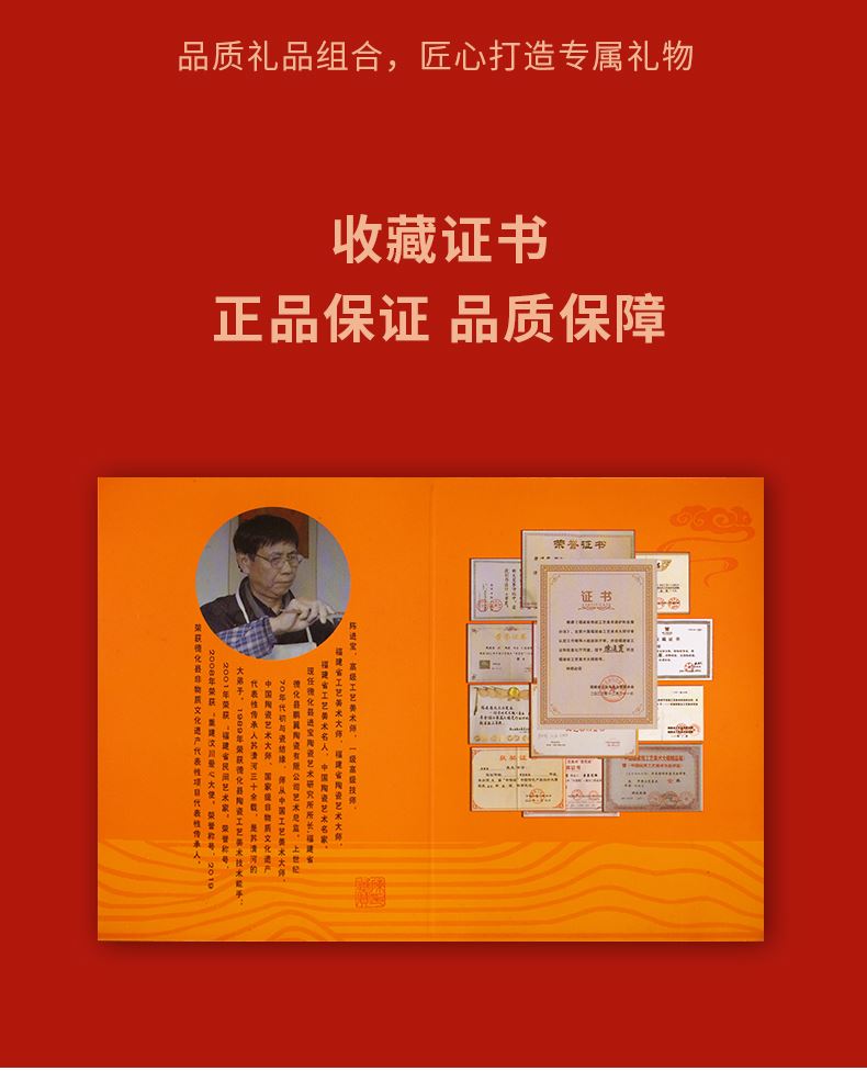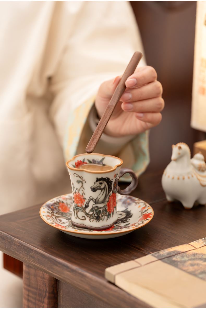 配 制:2杯 2盘 2实木搅拌棒 1摆件 1收藏证书 1礼盒 手提袋 材质:汝黄瓷 胡桃木 规格:杯子8.8*7.3cm 碟子直径13.5cm高2.2cm 摆件9.3*7cm 容量:杯子70ml 推荐说明:马上有钱,马到成功杯子摆件套装,马背上葫芦造型,寓意福禄,2盘精美大气。亚黄汝瓷,玛瑙入釉,蝉翼开片,内外皆有花面,家有千财万贯,不如汝窑一片。技术新品。画面堆料技术,富有立体浮雕质感,真实感强。杯身开片,可养瓷。