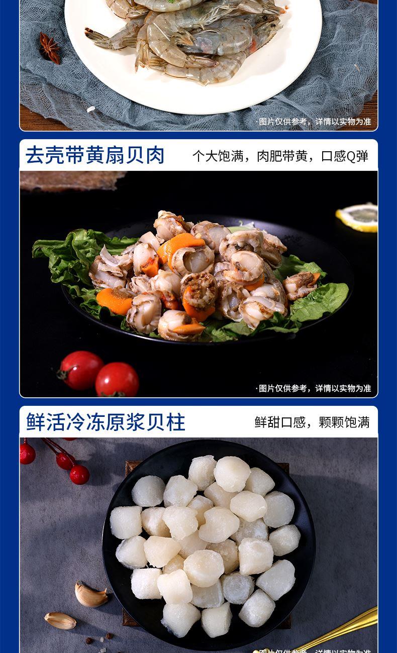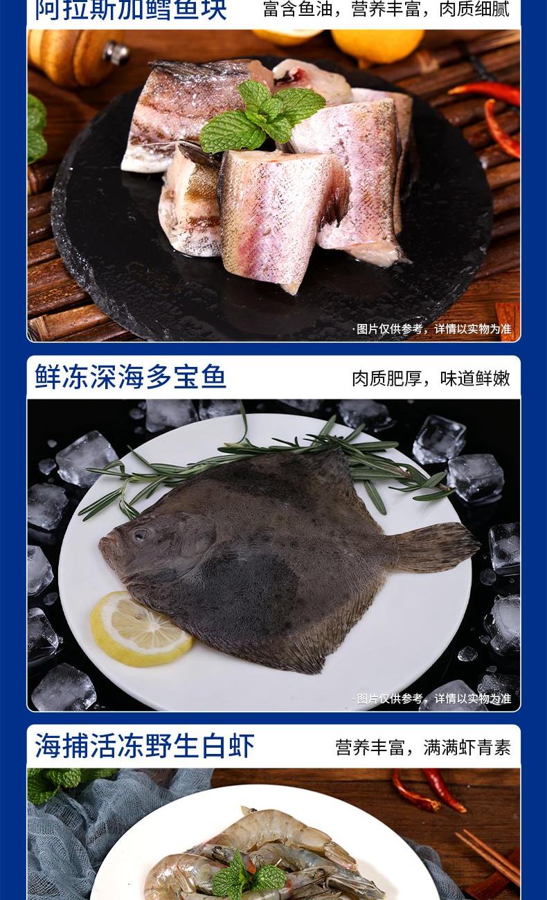 阿拉斯加熟冻鳕蟹300g-400g 海捕活冻半壳鲍鱼400g 阿拉斯加鳕鱼块300g 鲜冻深海多宝鱼250g-300g 海捕活冻野生白虾400g 冷冻去壳带黄扇贝肉300g 鲜活冷冻原浆贝柱300g 鲜活冷冻鱿鱼须300g