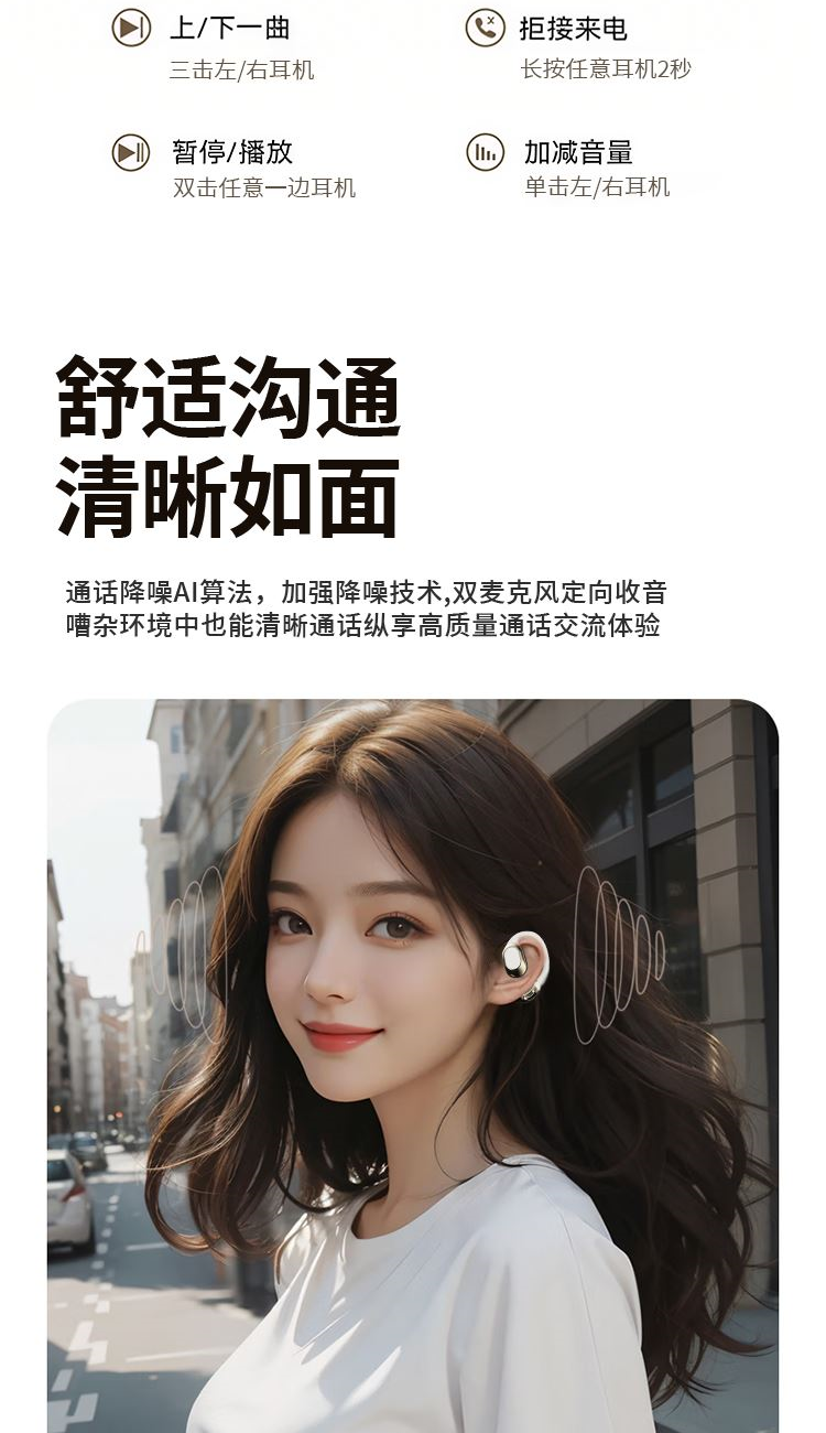 颜色: 米白色,黑色 通话时间: 4-5小时小时 充电时间: 1小时 (耳机) 输出功率:3mW*2 产品尺寸 : 56*40*11mm(耳机) 产品净重:42.5g 夹耳式生动流线型设计,触控功能,佩戴牢固舒适 采用进口MEMS麦克风,高清滤音,双耳机,任意单耳可以独立使用