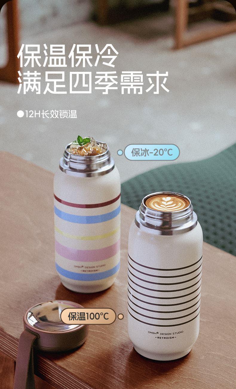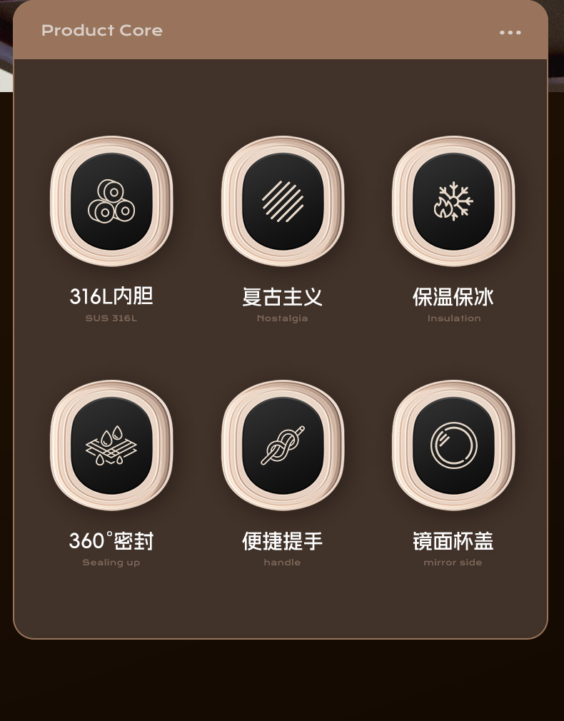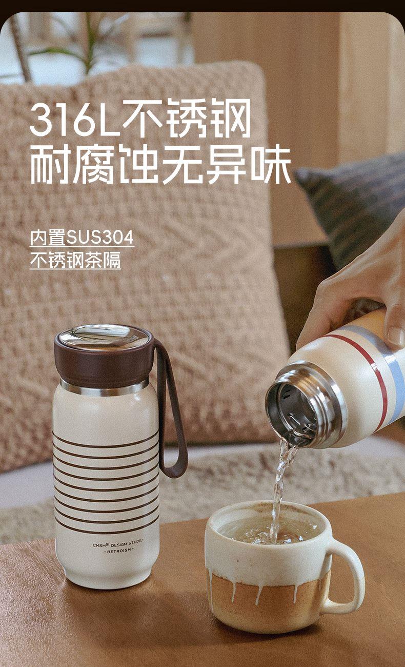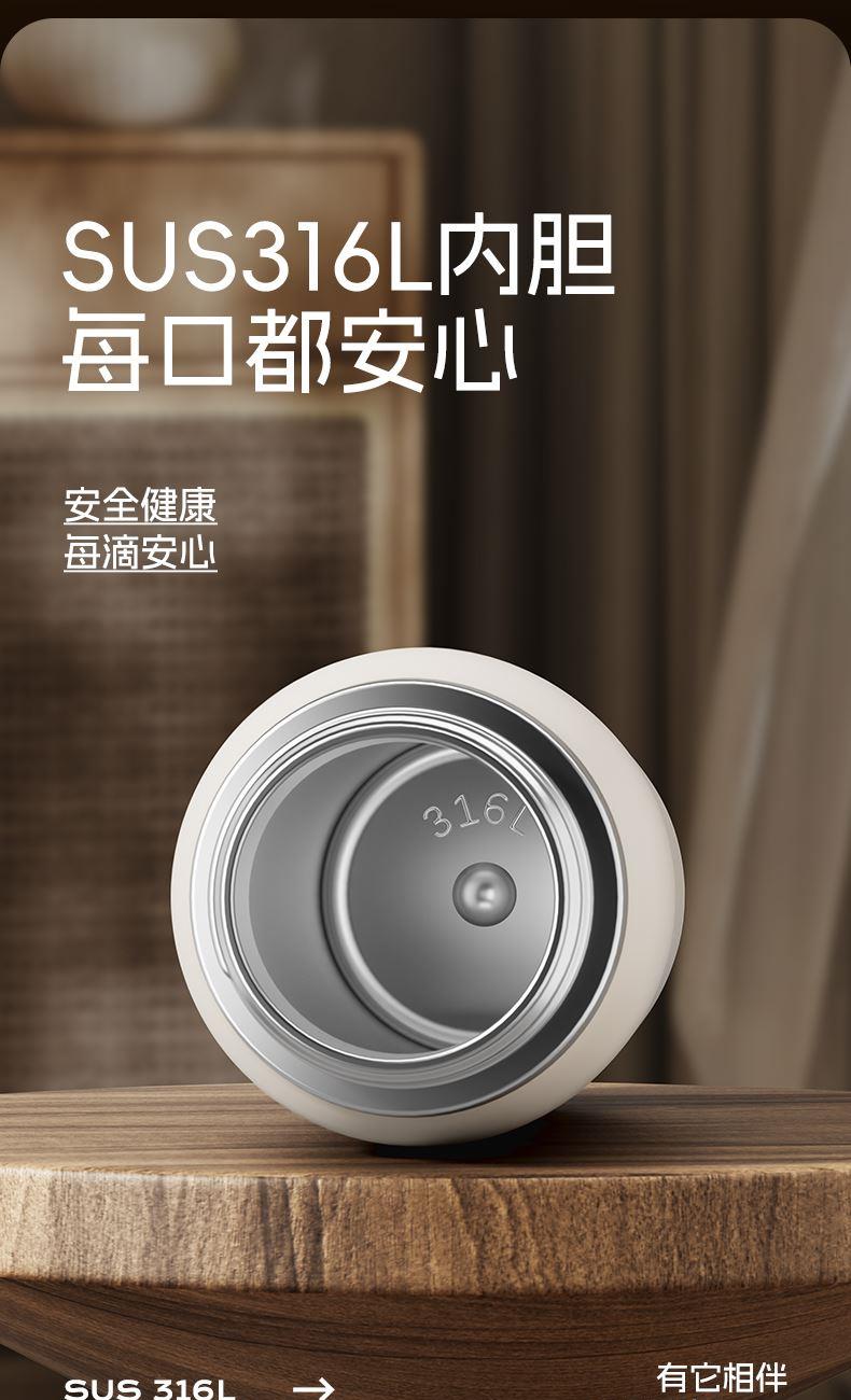 产品条码:6922958205976 内胆材质:316不锈钢 外壳材质:304不锈钢 茶隔材质:304不锈钢 密封圈材质:硅胶 产品容量:500ml 产品尺寸:82*75*182mm 产品净重:300g 产品颜色:咖色,粉色,黄色 装 箱 数:48pcs 包装方式:独立彩盒包装 箱 重 量:12.5kg 外箱尺寸:48.8x33.2x39.2cm 产品特点: 316L不锈钢内胆 长效锁温。 镜片顶盖设计 精致点缀。 可拆卸细孔茶隔 茶渣分离。 复古胶片风 古典且温柔。