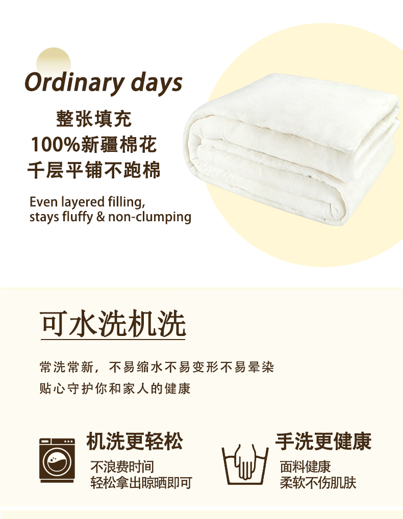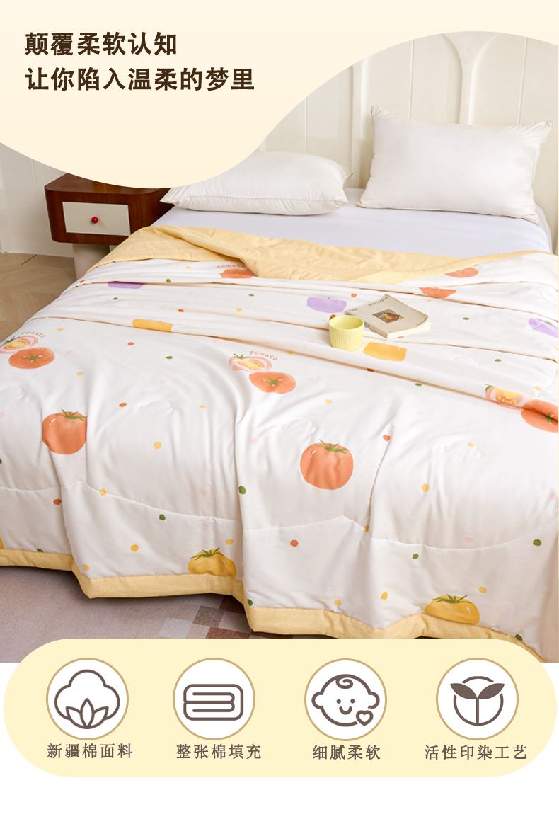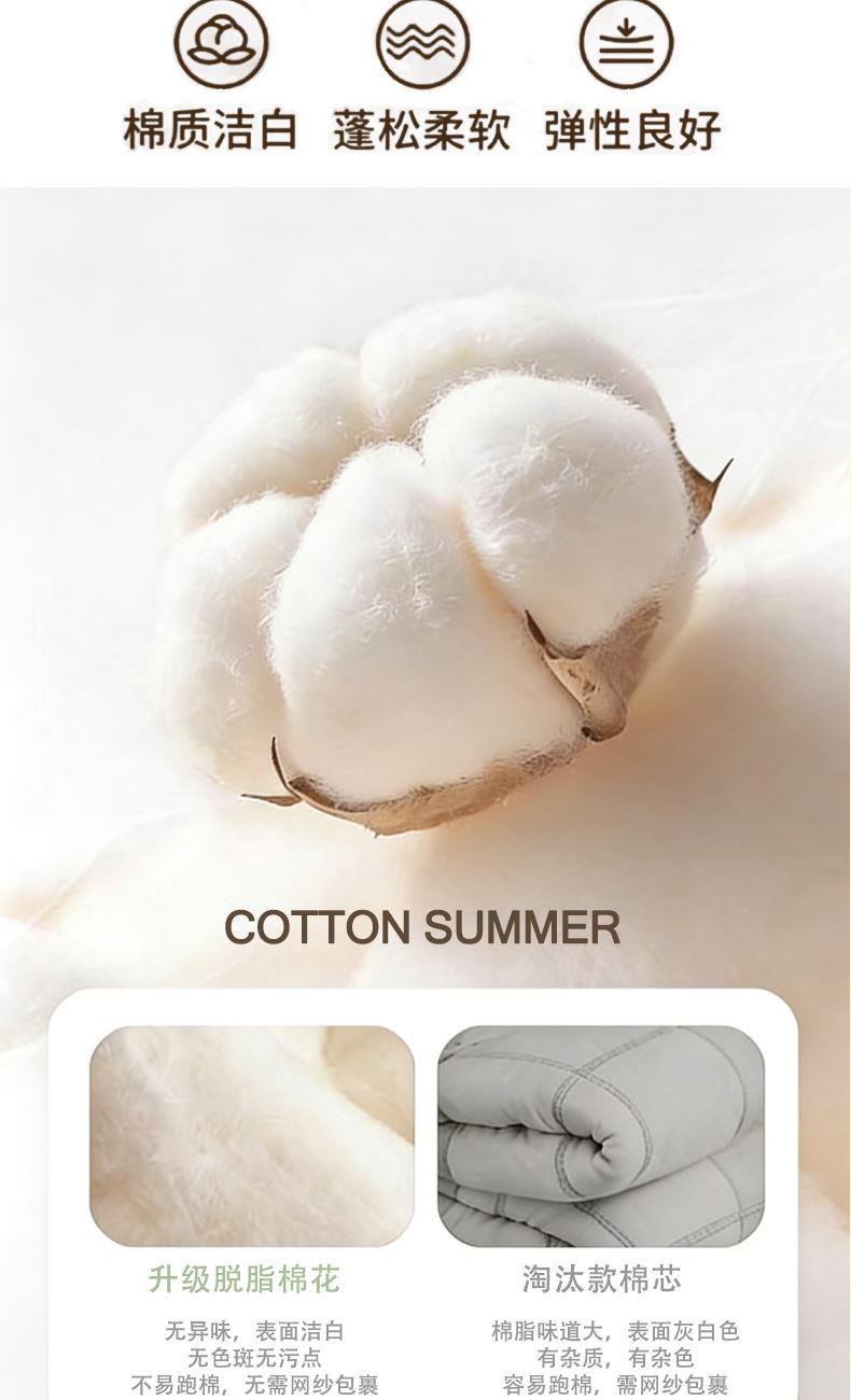 产品参数: 面料:纯 棉 填充:棉花 重量:1500克 规格: 200*230cm 产品卖点 采用纯 棉面料,舒适透气,吸湿性强,填充10 0%棉花,给您健康陪伴
