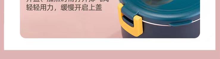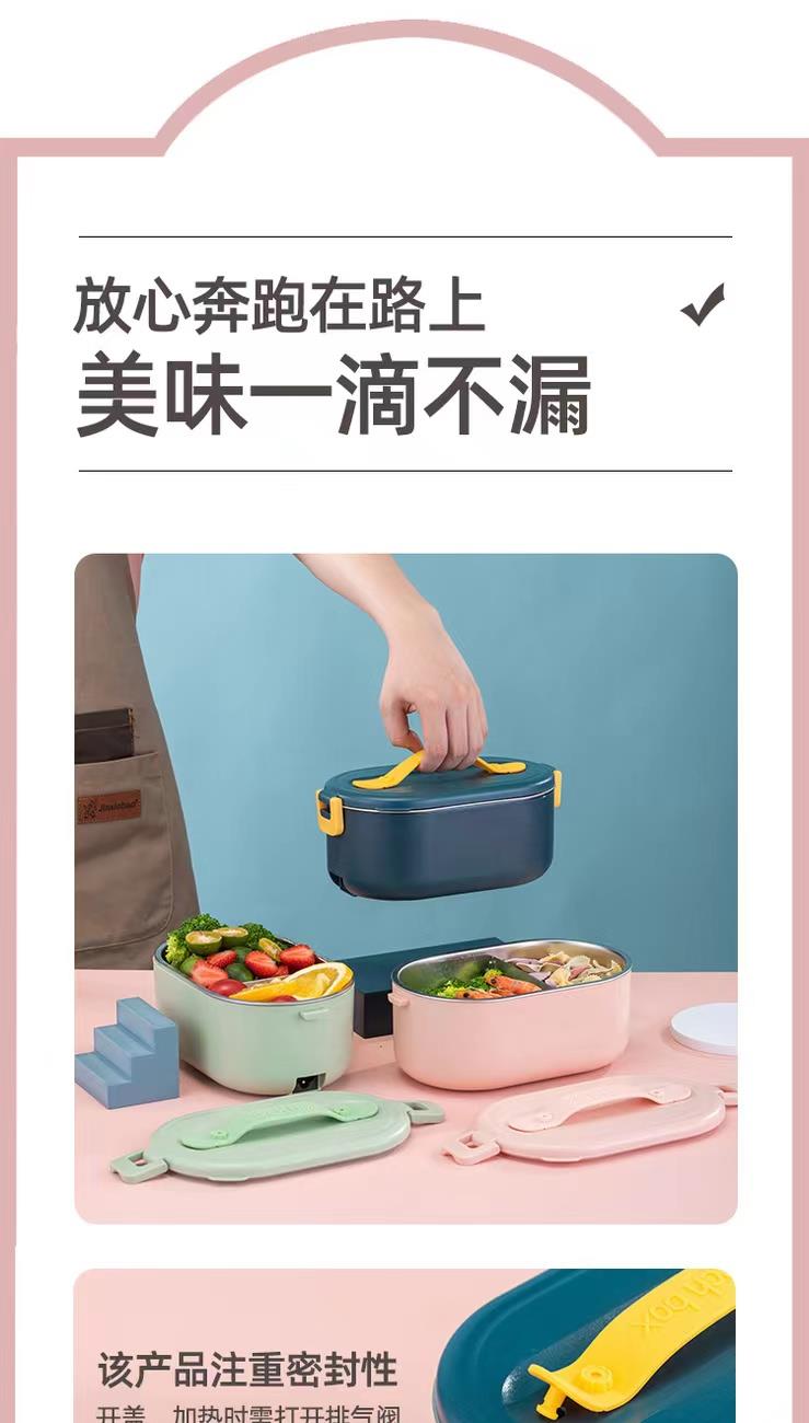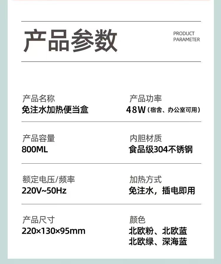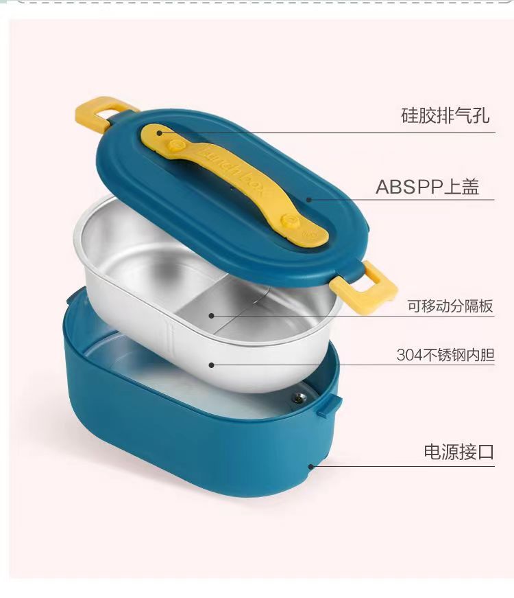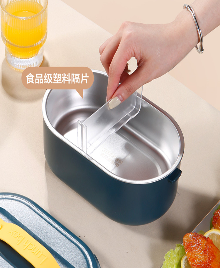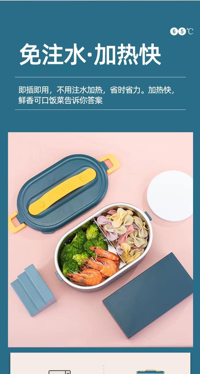 加热便当饭盒+移动PP隔板 额定功率:48W 额定电压:220V 产品颜色:深蓝/浅蓝/粉/绿 产品容量:800ML 产品款式:无需加水单格带PP分隔板 包装清单:便当盒、移动分隔板、电源线、说明书 包装尺寸:13.1*9.8*22.1(cm) 特色功能 1、食品级食品可接触内胆 耐腐蚀材质 2、机身582G,轻巧实用颜色可选 3、免加收水,即插即用,人体工程学 舒适提手 4、携带方便,出行必备