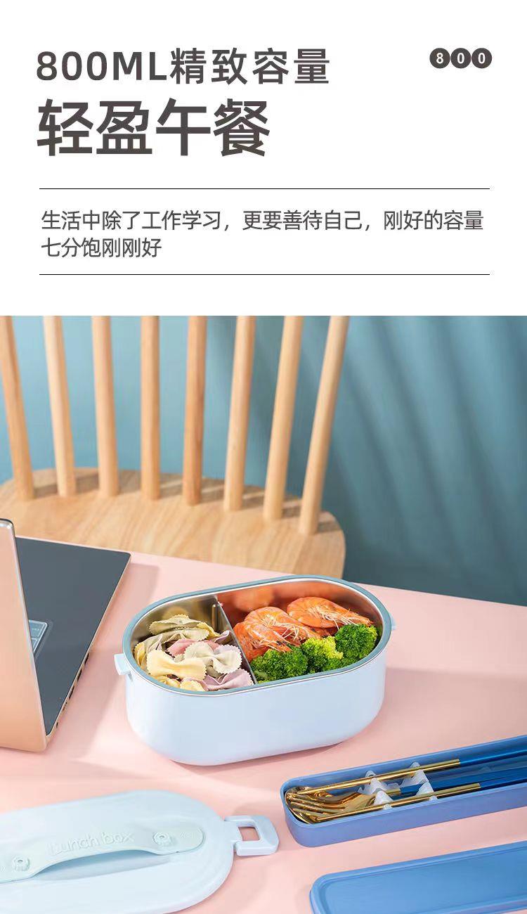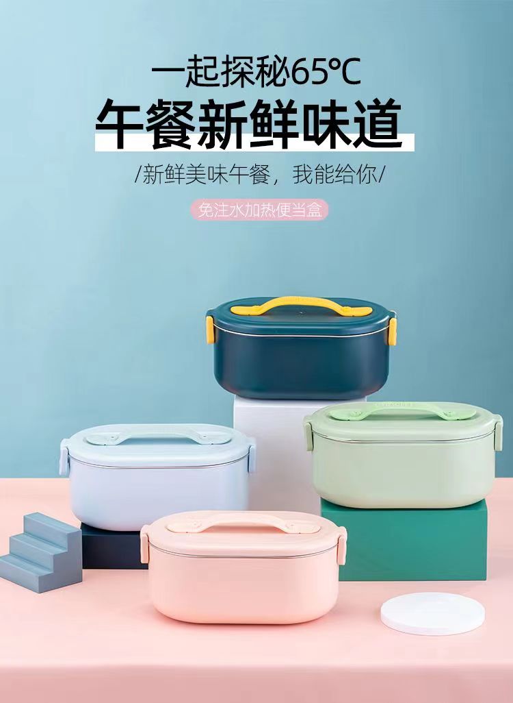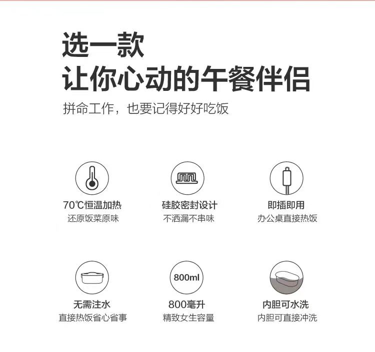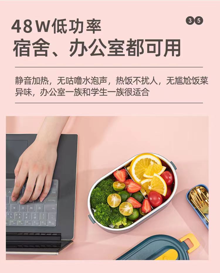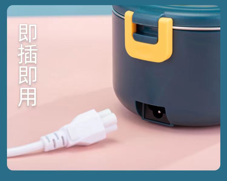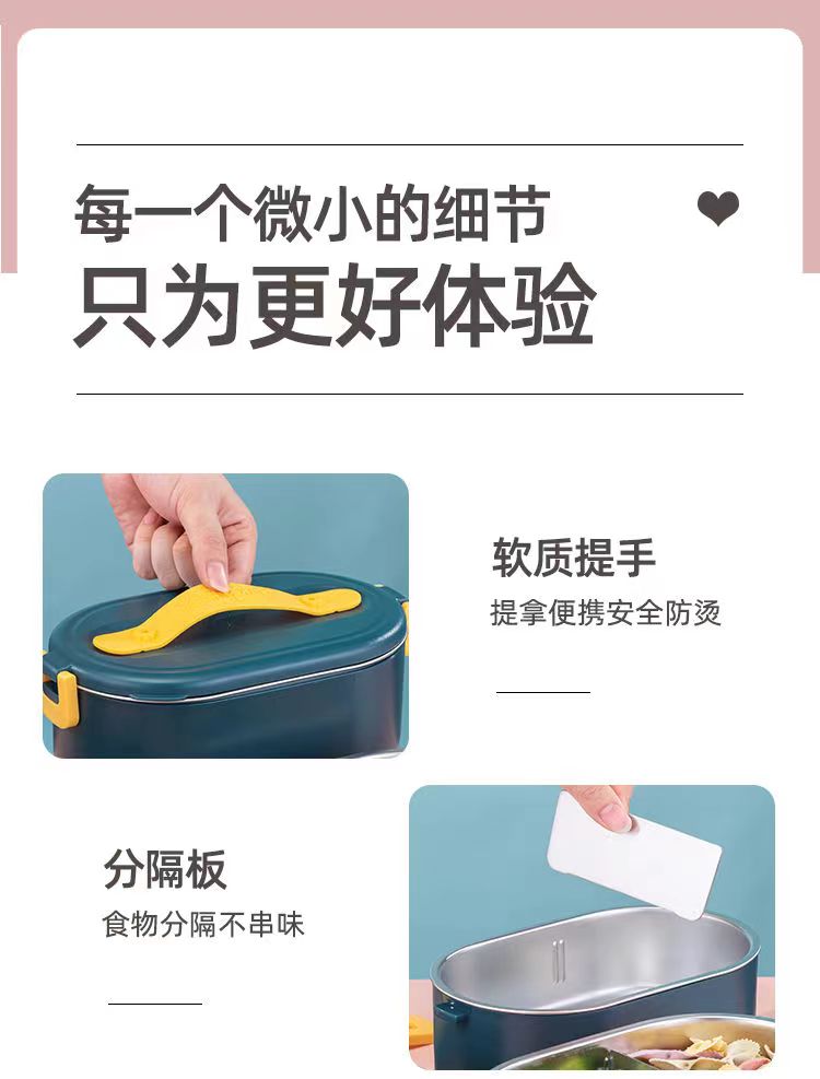 加热便当饭盒+移动PP隔板 额定功率:48W 额定电压:220V 产品颜色:深蓝/浅蓝/粉/绿 产品容量:800ML 产品款式:无需加水单格带PP分隔板 包装清单:便当盒、移动分隔板、电源线、说明书 包装尺寸:13.1*9.8*22.1(cm) 特色功能 1、食品级食品可接触内胆 耐腐蚀材质 2、机身582G,轻巧实用颜色可选 3、免加收水,即插即用,人体工程学 舒适提手 4、携带方便,出行必备