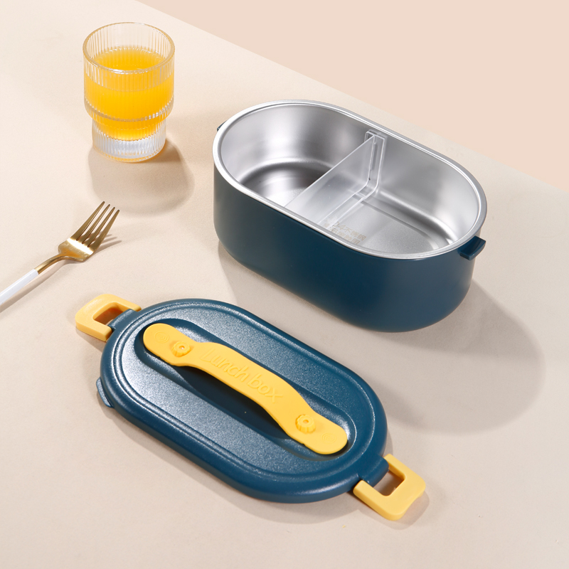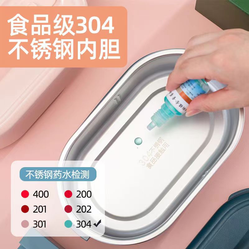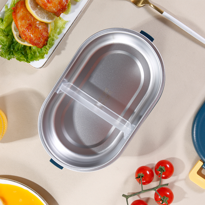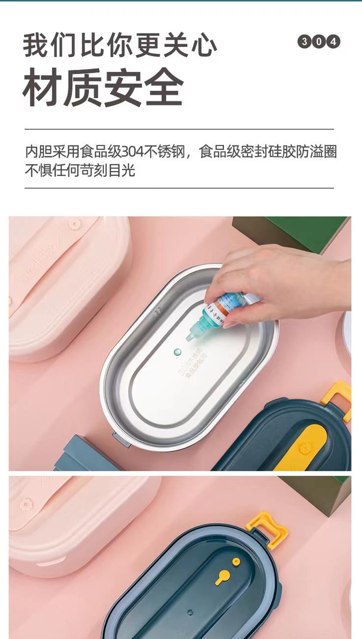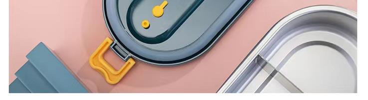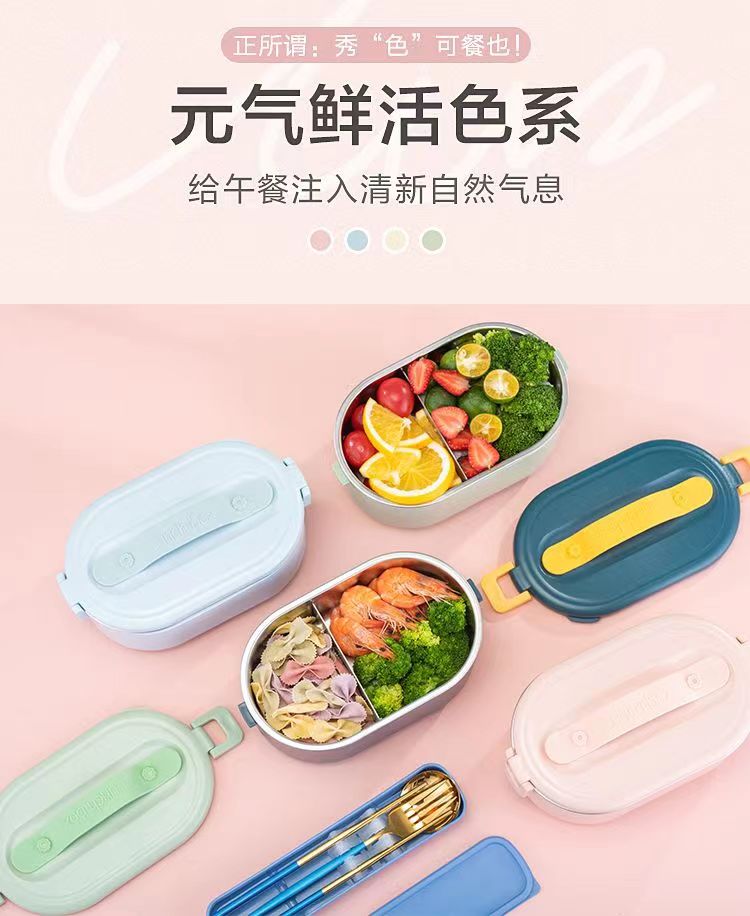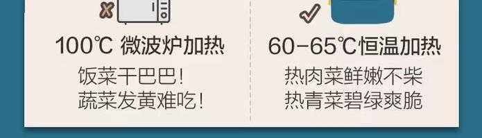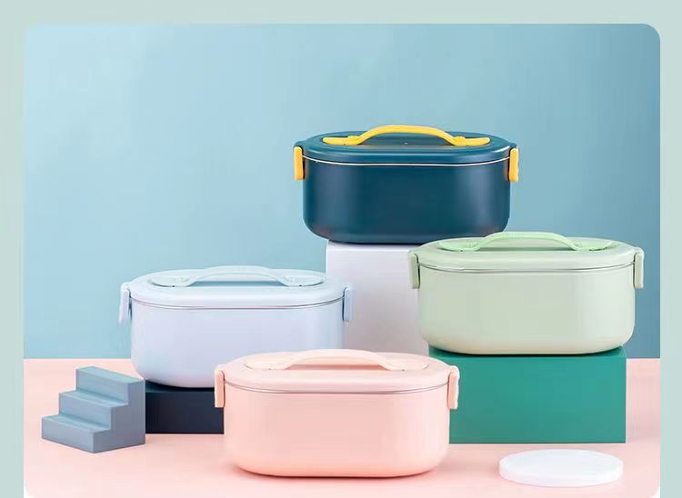 加热便当饭盒+移动PP隔板 额定功率:48W 额定电压:220V 产品颜色:深蓝/浅蓝/粉/绿 产品容量:800ML 产品款式:无需加水单格带PP分隔板 包装清单:便当盒、移动分隔板、电源线、说明书 包装尺寸:13.1*9.8*22.1(cm) 特色功能 1、食品级食品可接触内胆 耐腐蚀材质 2、机身582G,轻巧实用颜色可选 3、免加收水,即插即用,人体工程学 舒适提手 4、携带方便,出行必备