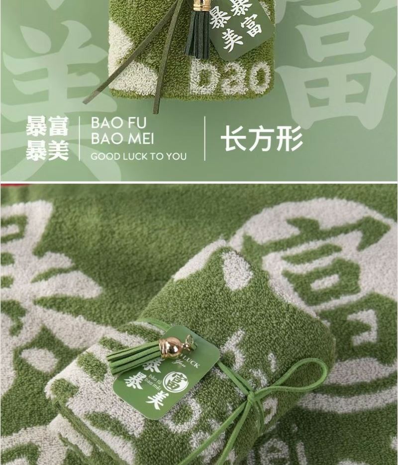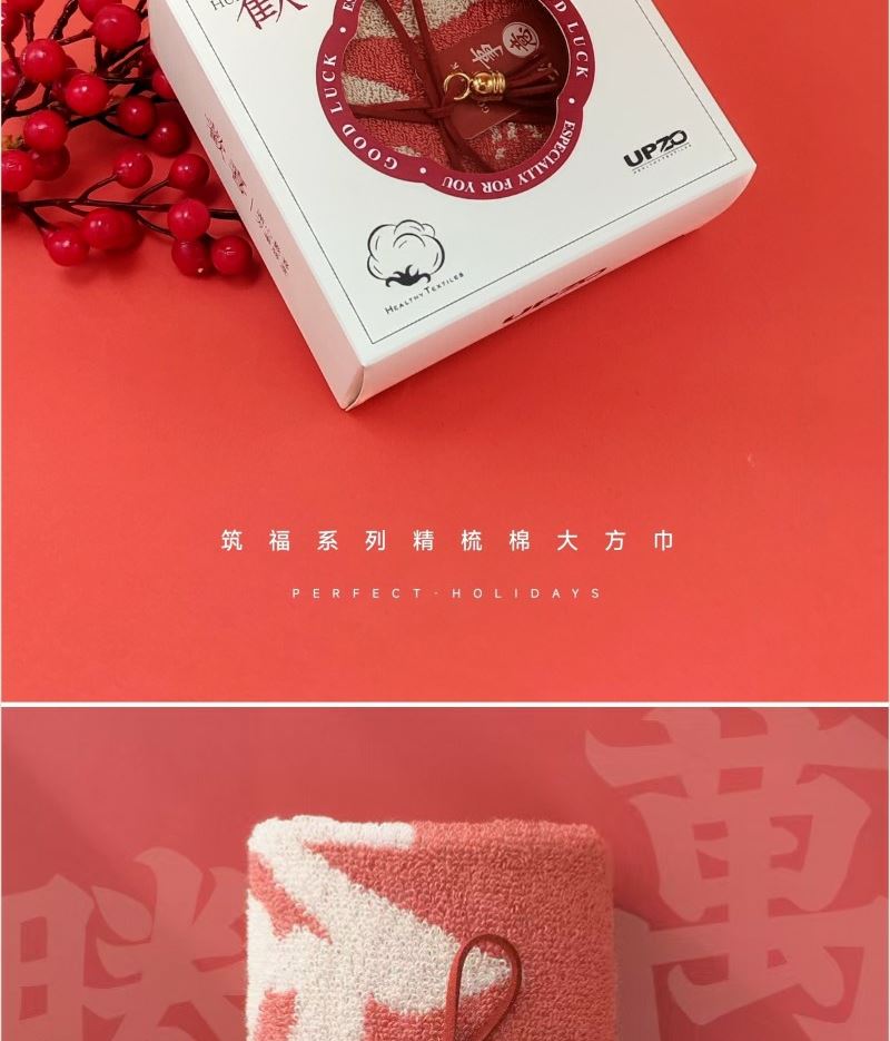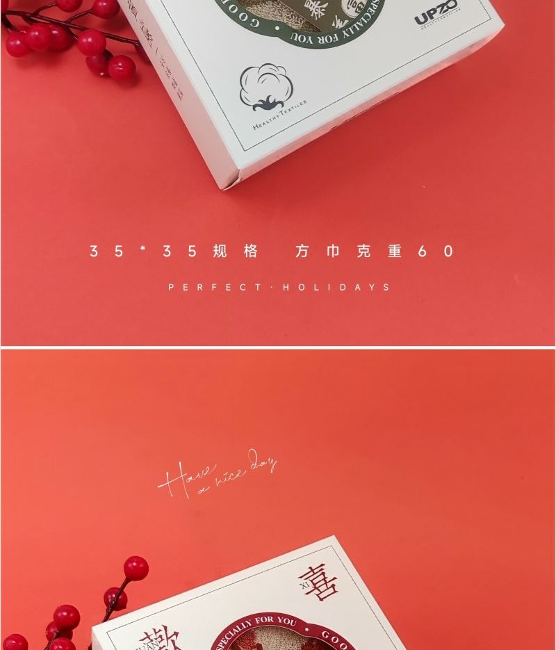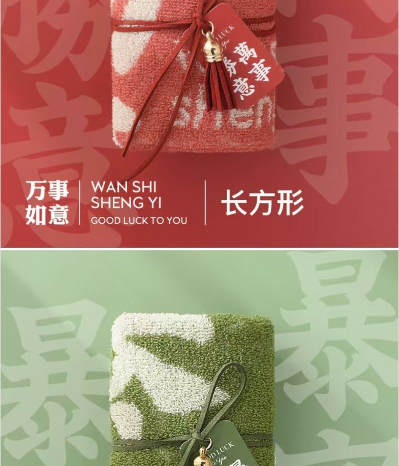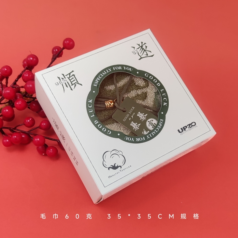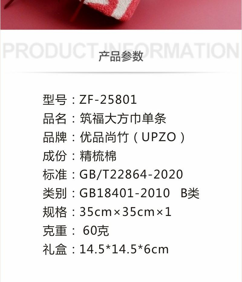 型号: ZF-25801 成份: 精梳棉 类别: GB18401-2010 B类 规格: 35cm×35cm×1 克重: 60克每条 礼盒: 14.5*14.5*6CM 祝福融入毛巾与礼盒设计