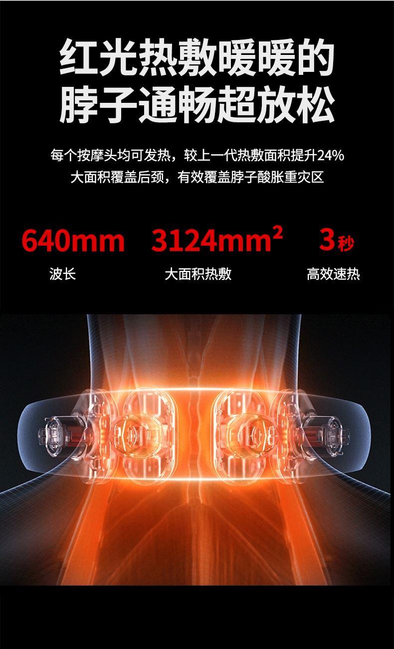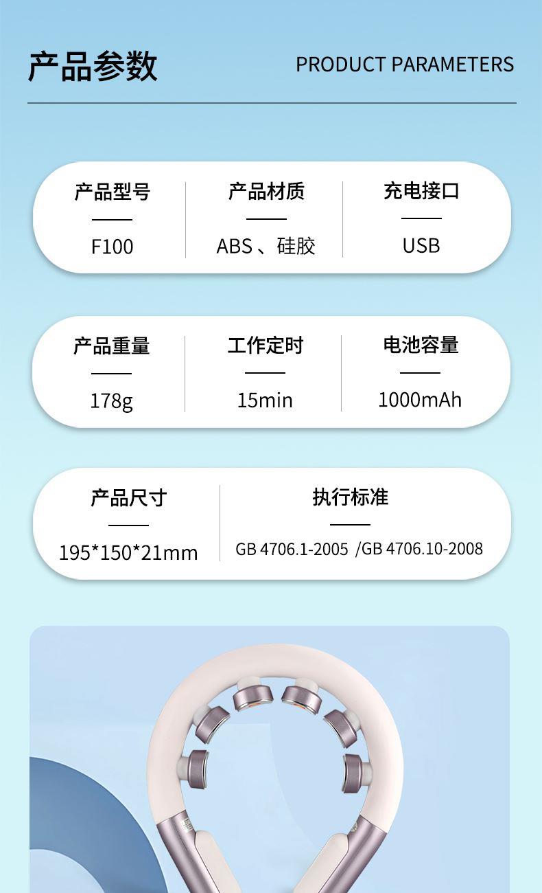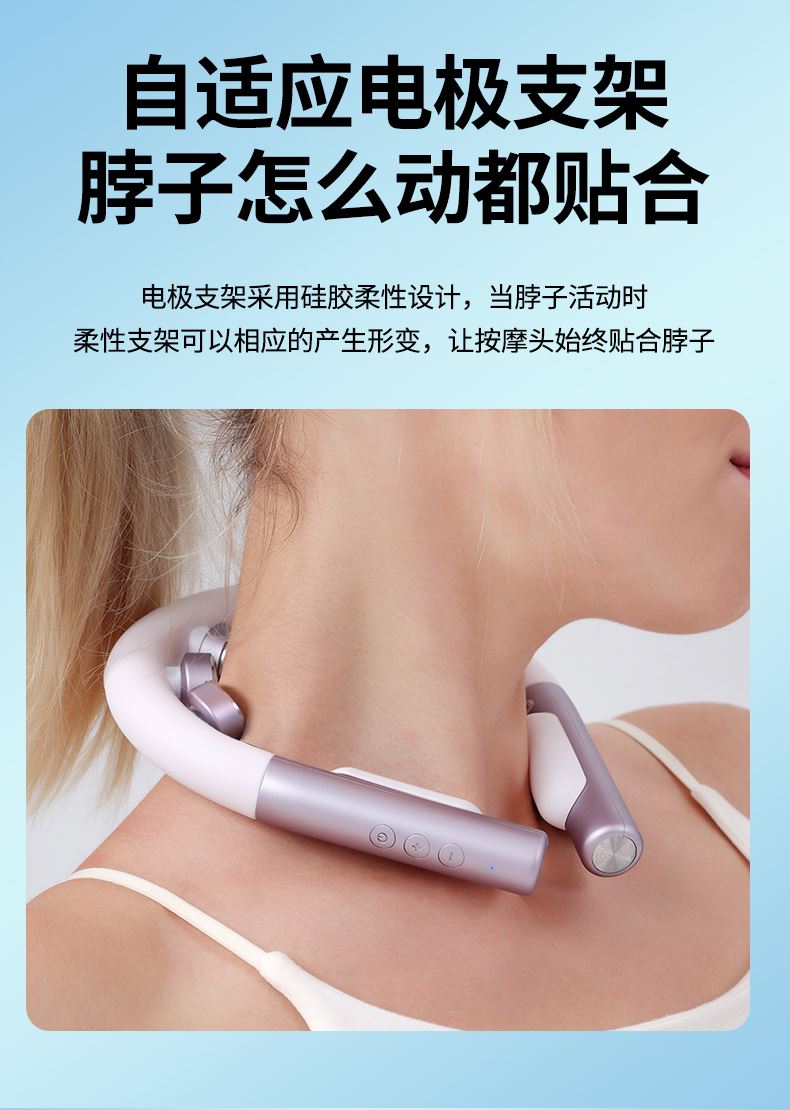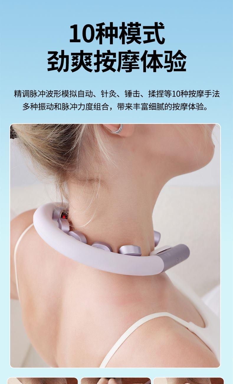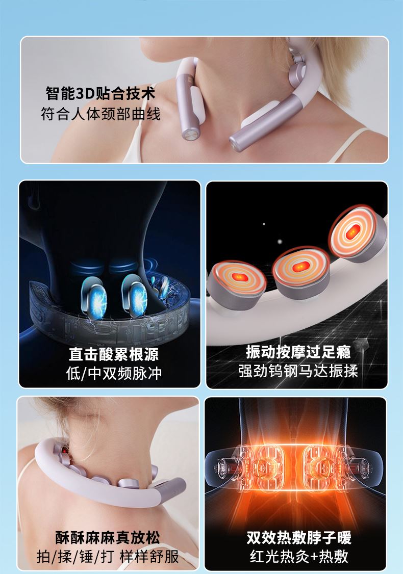 产品材质:ABS、硅胶 额定参数:5V/1.5W 充电接口:USB 产品重量:178g 电池容量:1000mAh 6 头立体按摩 + 360° 旋转:6 组按摩头搭配 360° 任性旋转设计,突破传统按摩局限,贴合颈椎曲线,覆盖后颈、肩周等酸痛区域,多维度模拟人手揉捏、按压,一次按摩即可缓解大面积肌肉僵硬 一键开启 42℃恒温热敷:无需复杂操作,一键启动热敷功能,暖流透过亲肤硅胶渗透颈肩,搭配脉冲、震动按摩同步作用,快速驱散肌肉寒意,秋冬使用暖颈更暖心,缓解酸痛效果翻倍 食品级软硅胶亲肤材质:按摩头与接触面均采用软硅胶材质,触感细腻亲肤,敏感肌使用无刺激,长期佩戴不闷汗、不压痕,贴合颈部时如同人手轻抚,舒适度远超普通塑料材质按摩仪 10 大模式 + 16 档力度 + 双频按摩:涵盖揉捏、捶打、脉冲等 10 大专业按摩模式,搭配 16 档细腻力度调节,再加上低 / 中双频按摩可选,无论是日常放松、运动后舒缓,还是针对性缓解颈椎不适,都能匹配需求,全家老少都能用 无线遥控 + 随心调节:配备无线遥控器,无需低头操作,躺卧、办公时随手就能切换模式、调节力度,远距离操控不耽误追剧、工作,享受按摩更自由,懒人必备便捷设计 智能芯片动态调节技术:内置高灵敏智能芯片,实时检测电极片与皮肤的贴合度,根据皮肤接触状态动态调整脉冲功率,避免高阻抗下的刺痛感,让脉冲按摩全程平稳舒适,新手也能轻松驾驭 多技术融合仿真人手体验:整合热敷、脉冲、震动三大核心技术,搭配智能芯片模拟专业按摩师手法,从浅层放松到深层舒缓,每一下按摩都到位,足不出户就能享受线下理疗店级别的颈椎护理