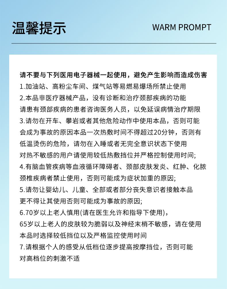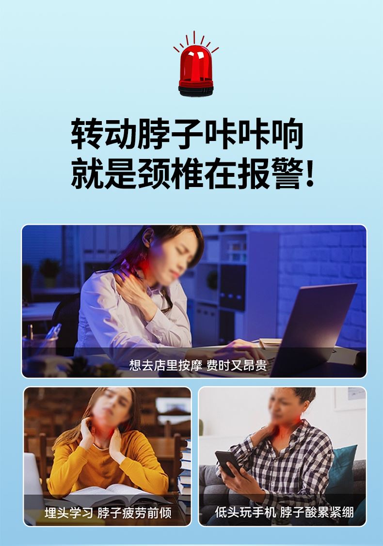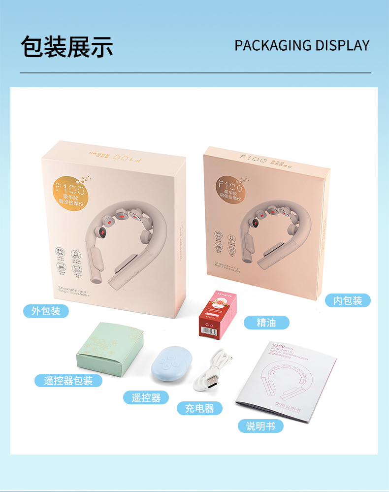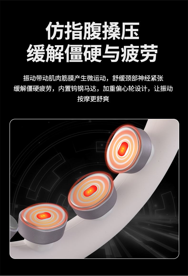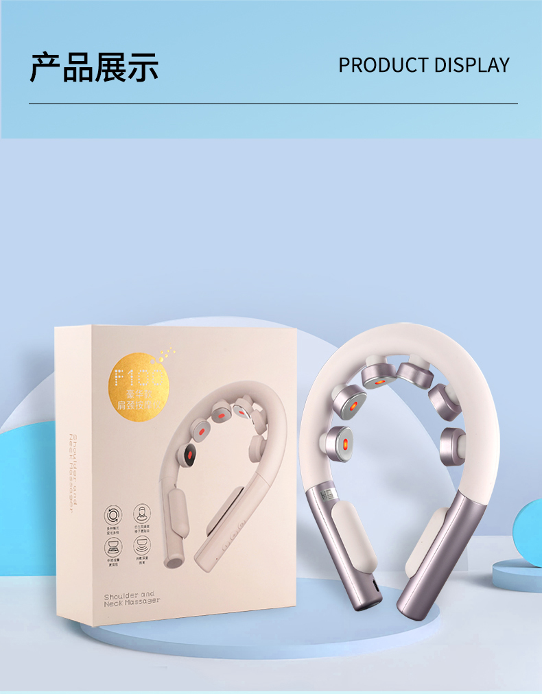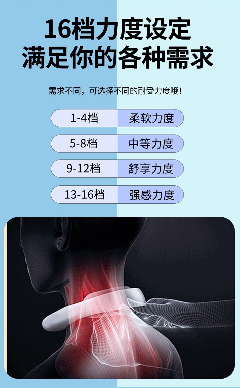 产品材质:ABS、硅胶 额定参数:5V/1.5W 充电接口:USB 产品重量:178g 电池容量:1000mAh 6 头立体按摩 + 360° 旋转:6 组按摩头搭配 360° 任性旋转设计,突破传统按摩局限,贴合颈椎曲线,覆盖后颈、肩周等酸痛区域,多维度模拟人手揉捏、按压,一次按摩即可缓解大面积肌肉僵硬 一键开启 42℃恒温热敷:无需复杂操作,一键启动热敷功能,暖流透过亲肤硅胶渗透颈肩,搭配脉冲、震动按摩同步作用,快速驱散肌肉寒意,秋冬使用暖颈更暖心,缓解酸痛效果翻倍 食品级软硅胶亲肤材质:按摩头与接触面均采用软硅胶材质,触感细腻亲肤,敏感肌使用无刺激,长期佩戴不闷汗、不压痕,贴合颈部时如同人手轻抚,舒适度远超普通塑料材质按摩仪 10 大模式 + 16 档力度 + 双频按摩:涵盖揉捏、捶打、脉冲等 10 大专业按摩模式,搭配 16 档细腻力度调节,再加上低 / 中双频按摩可选,无论是日常放松、运动后舒缓,还是针对性缓解颈椎不适,都能匹配需求,全家老少都能用 无线遥控 + 随心调节:配备无线遥控器,无需低头操作,躺卧、办公时随手就能切换模式、调节力度,远距离操控不耽误追剧、工作,享受按摩更自由,懒人必备便捷设计 智能芯片动态调节技术:内置高灵敏智能芯片,实时检测电极片与皮肤的贴合度,根据皮肤接触状态动态调整脉冲功率,避免高阻抗下的刺痛感,让脉冲按摩全程平稳舒适,新手也能轻松驾驭 多技术融合仿真人手体验:整合热敷、脉冲、震动三大核心技术,搭配智能芯片模拟专业按摩师手法,从浅层放松到深层舒缓,每一下按摩都到位,足不出户就能享受线下理疗店级别的颈椎护理