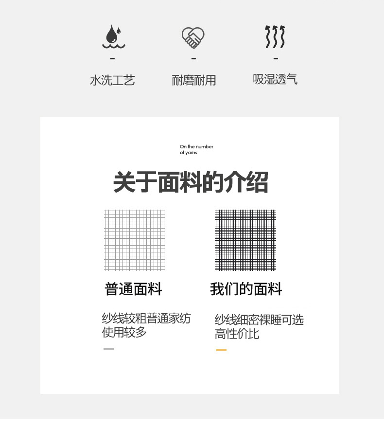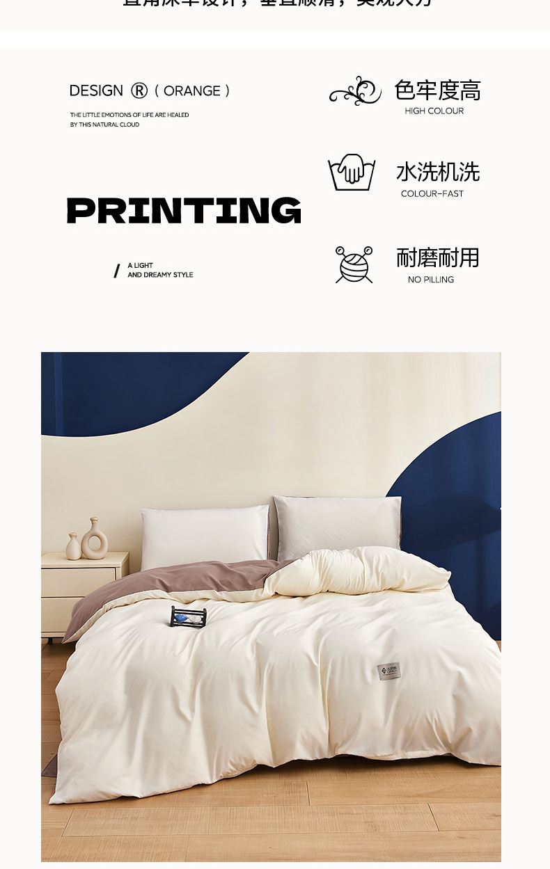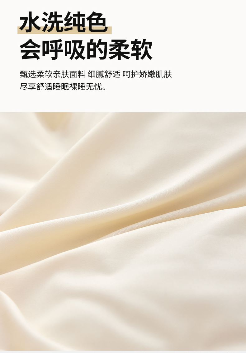 被套:200*230cm 床单:230*245cm 枕套:48*74cm*2 面料:水洗棉 执行标准:GB/T22796-2021 安全类别:GB18401-2010 B类 1.采用生态水洗棉面料,柔软亲肤、透气吸湿,贴身舒适不闷汗。面料细腻顺滑,裸睡安心,四季可用。 2.做工工整,走线细密,被套隐形拉链、床单圆角设计,美观又实用。花色清新百搭,机洗不易褪色、不起球,居家睡眠更舒适。