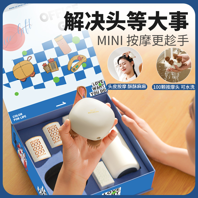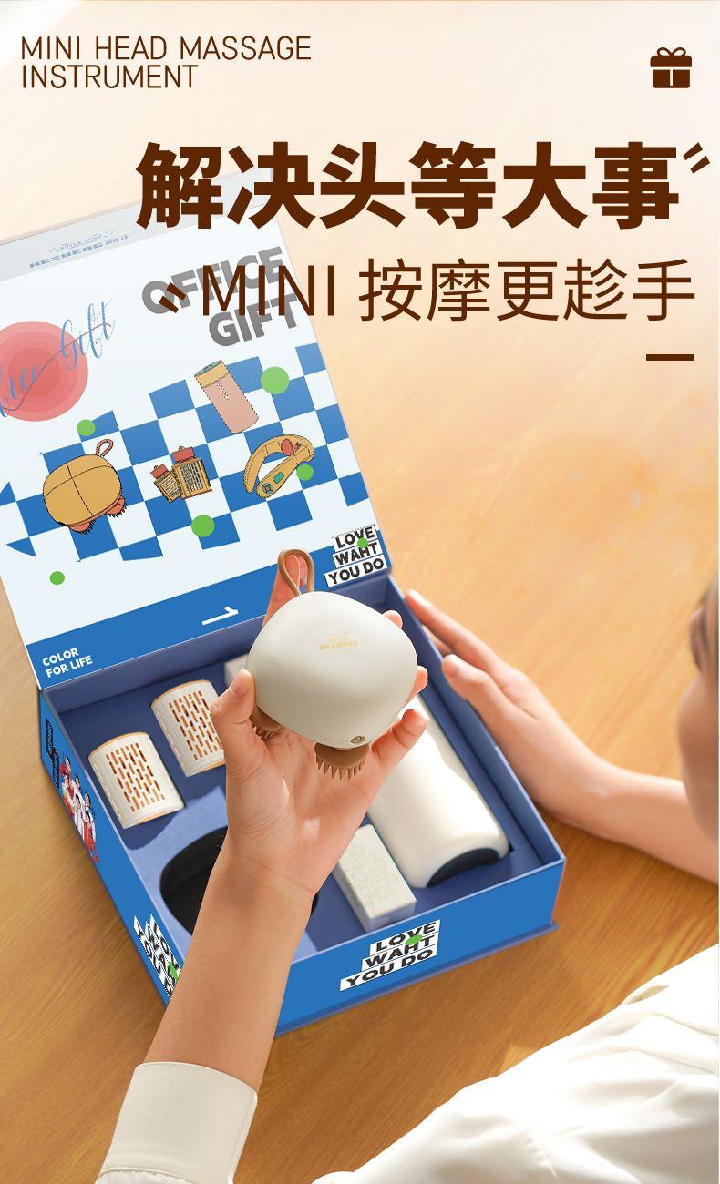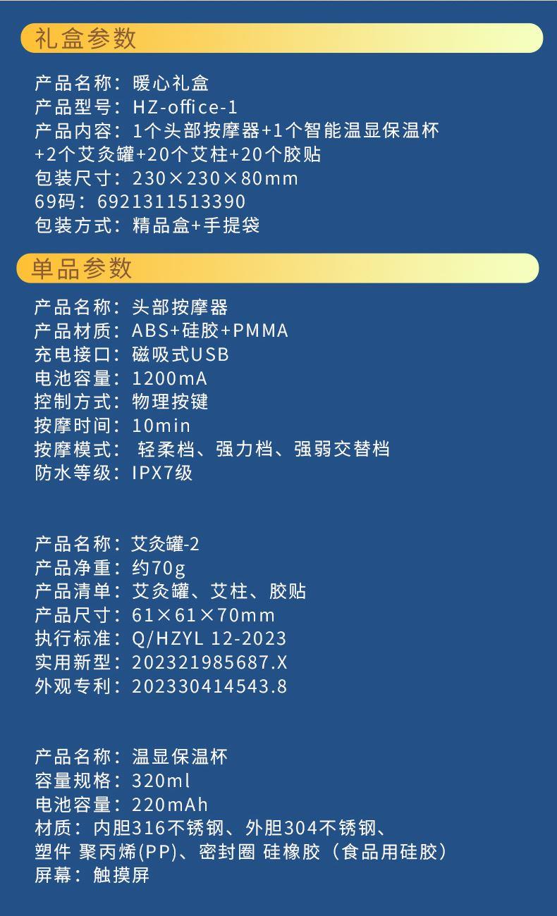 产品内容: 1个头部按摩器+1个智能温显保温杯 +2个艾灸罐+20个艾柱+20个胶贴 包装尺寸:230×230×80mm 69码:6921311513390 包装方式:精品盒+手提袋 头部按摩器HZ-HEAD-2 电池容量:1200毫安 控制方式:物理按键 按摩时间:10min 按摩模式: 轻柔档、强力档、强弱交替档 防水等级:7级