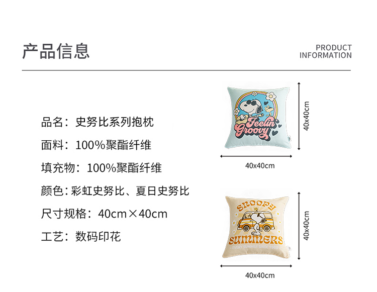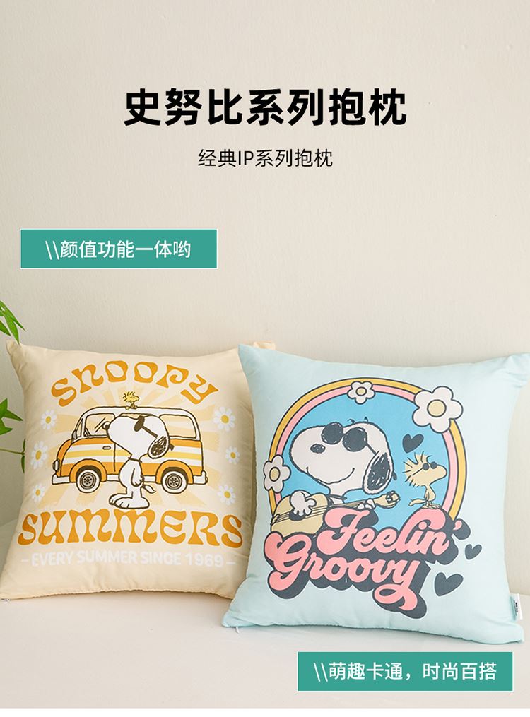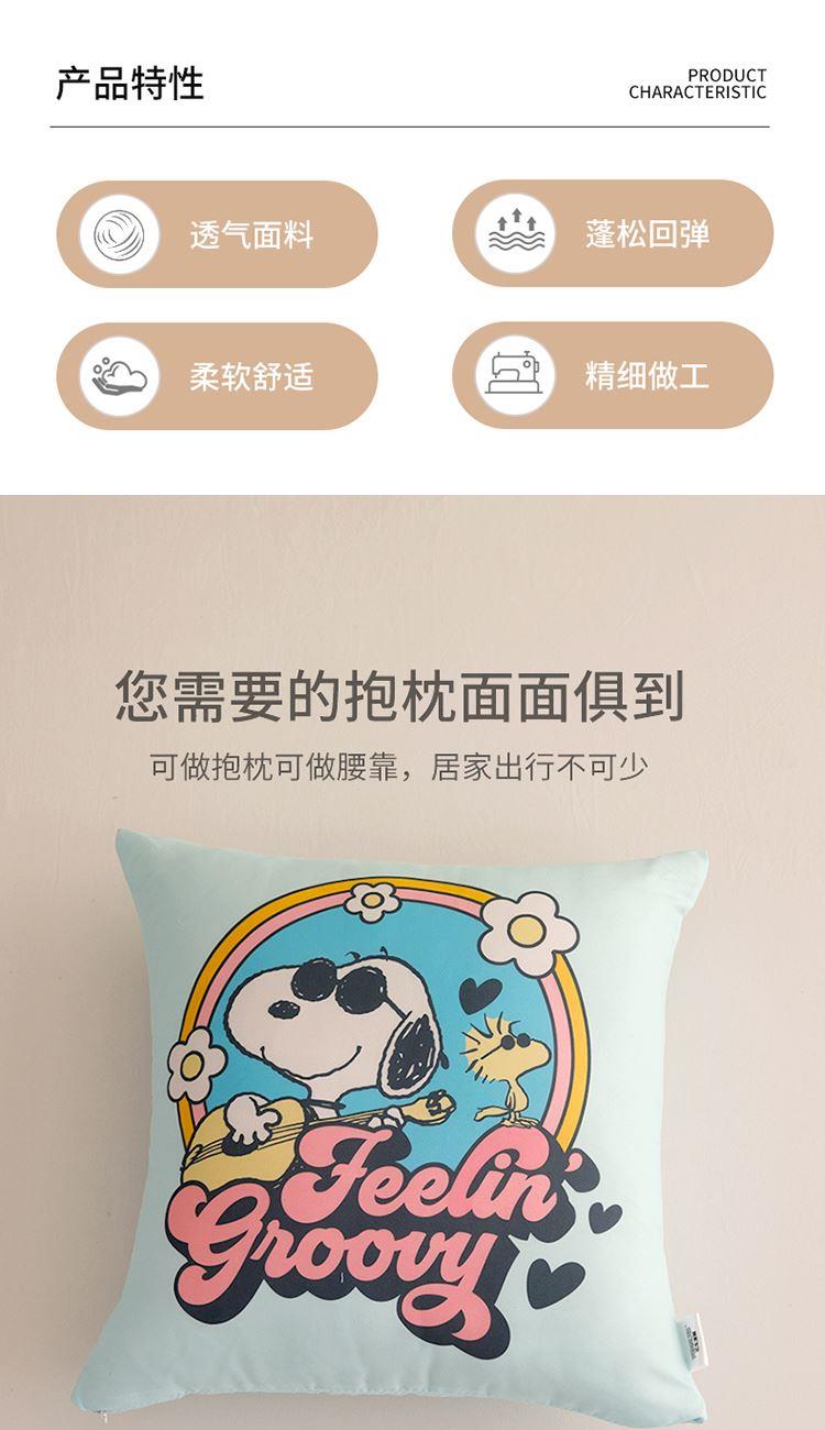 商品货号:SBZ21 商品面料:聚酯纤维 商品填充:聚酯纤维 商品颜色:夏日史努比、彩虹史努比 优质面料 柔软亲肤 经久耐用不跑棉 活性印染工艺 固色性牢 可作抱枕 午睡枕 适用多种场合 易于携带 方便又实用 健康环保 颜色鲜艳 经久不掉色