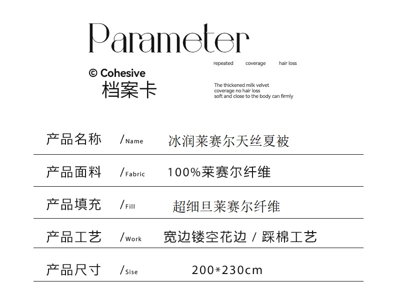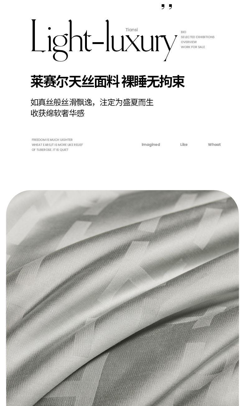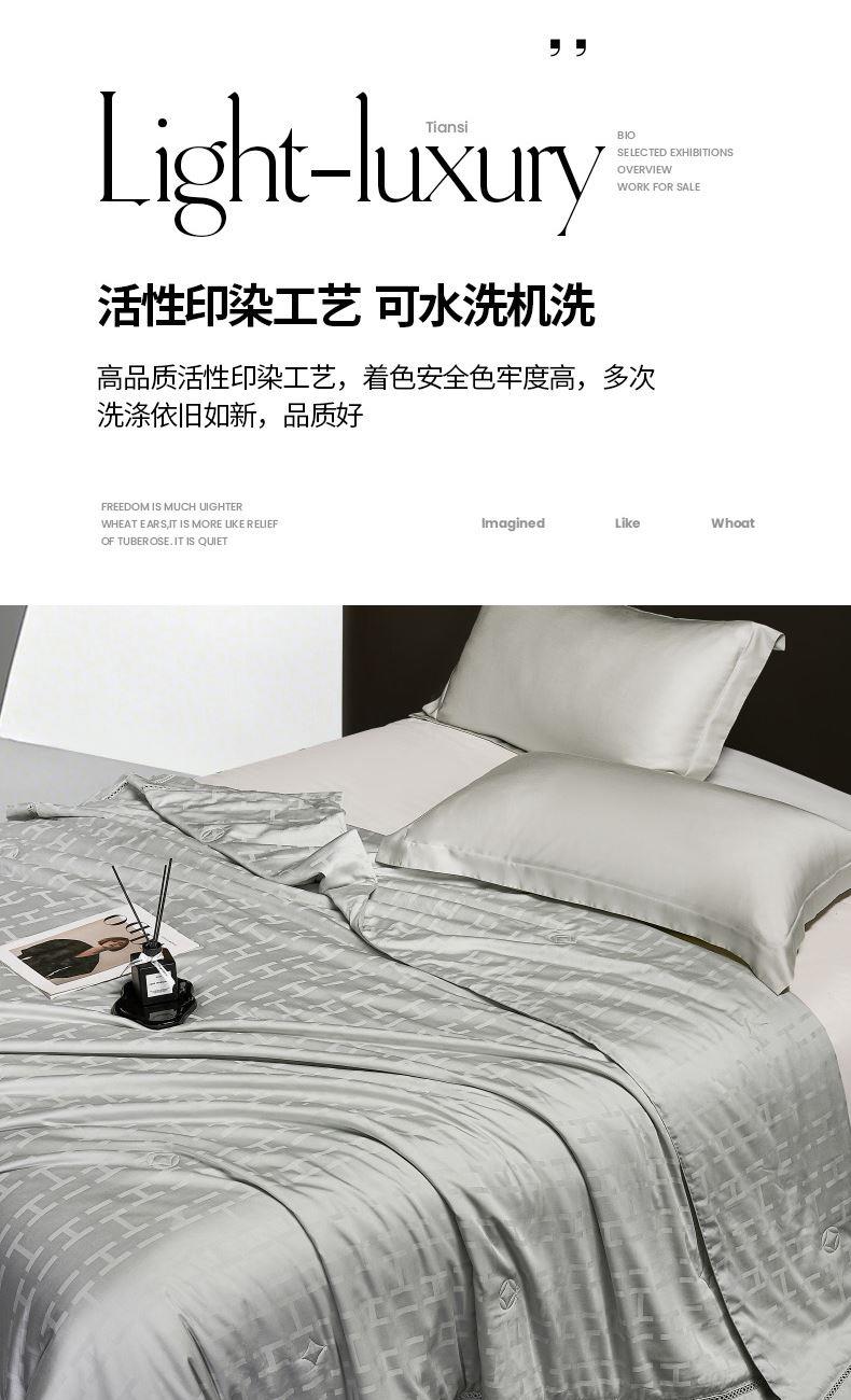 面料材质:莱赛尔纤维 填充:超细旦莱赛尔纤维 产品规格:200*230cm 克重:1900g 产品特点: 享爱蚕丝柔滑,享受拥享睡眠。会呼吸的面料,舒适软糯,躺在床上的一瞬间,感受渗透全身的惬意。