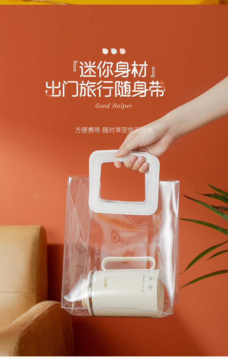 额定功率:300W 额定电压:220V 产品颜色:元气绿/樱花粉/象牙白 产品容量:400ML 产品款式:机械款 包装清单:主机、滤网、电源线、说明书 包装尺寸:13*13*17.5(cm) 特色功能 1、食品级食品可接触304不锈钢内胆 耐腐蚀材质 2、携带方便,出行好伴侣,轻巧实用颜值高 3、机械款方便操作,即插即用人体工程学 4、舒适提手,细密滤网,透气盖口 5、电热杯/水杯二合一,机械款开关档