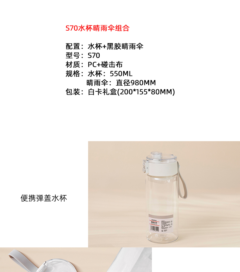 配置:水杯+黑胶晴雨伞 型号:S70 材质:PC+碰击布 规格:水杯:550ml 晴雨伞:直径980mm 包装:白卡礼盒(200*155*80mm)