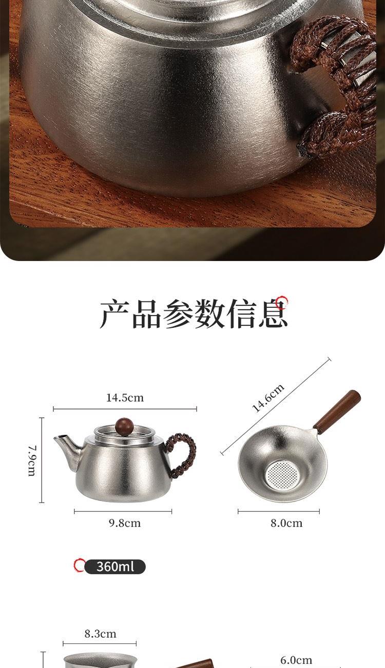 产品参数: 1、产品容量:茶壶容量:360ml; 茶杯容量:45ml 公道杯容量:330ml 2、材质:内外纯钛 3、包装标准:礼盒 4、颜色:冰川银 产品特点: 1、健康纯钛,保鲜不串味,泡茶不败茶; 2、轻盈纯钛茶壶,流线型壶嘴,出水集中不散花,断水利落不滴流; 3、纯钛公道杯,鹰嘴设计,自在控水; 4、纯钛茶漏,西米滤网,清澈茶汤; 5、双层纯钛茶杯,轻量持握手感; 6、经典禅意设计,适应多种风格搭配