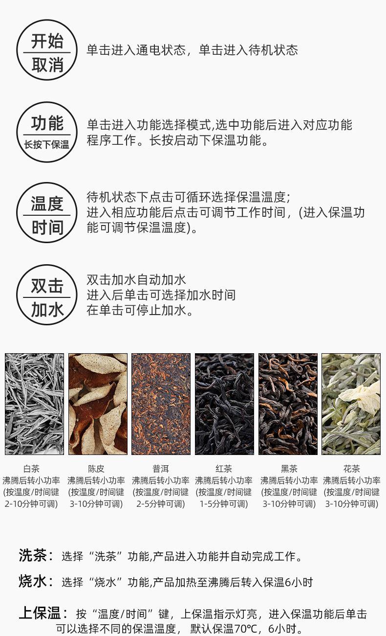 按键功能:洗茶、白茶、红茶、黑茶、陈皮、普洱、花茶、烧水。双击加水,温度时间,保温