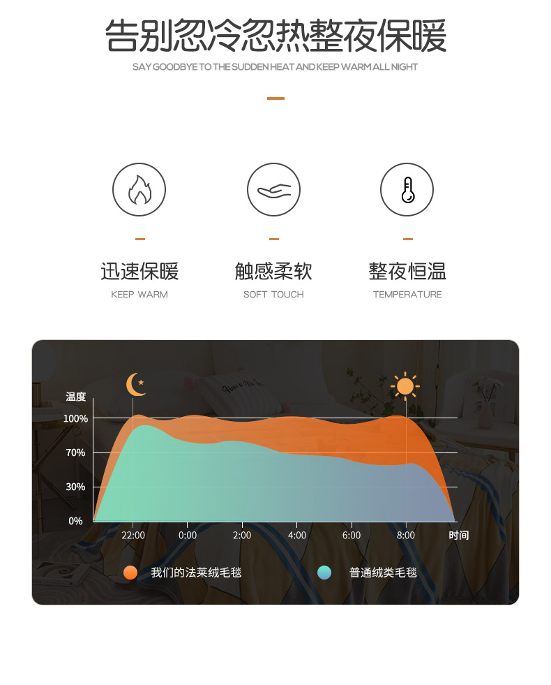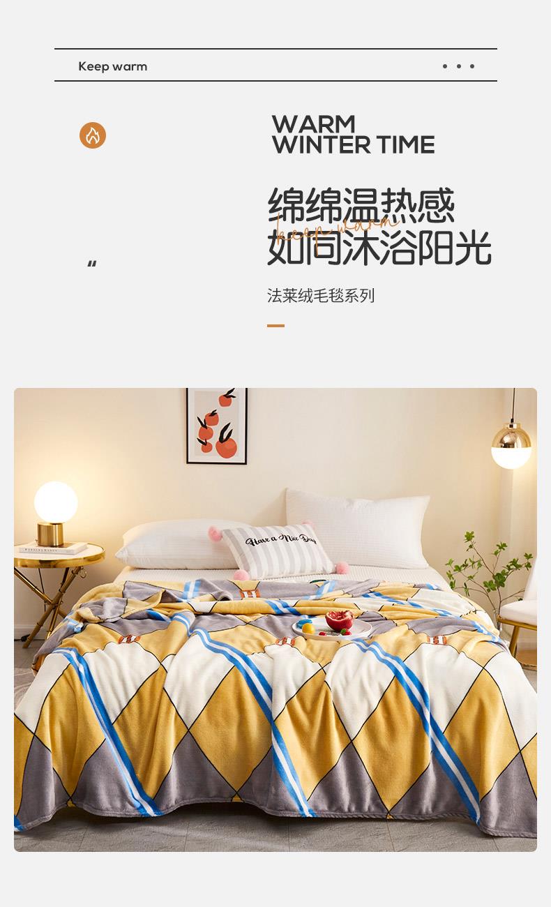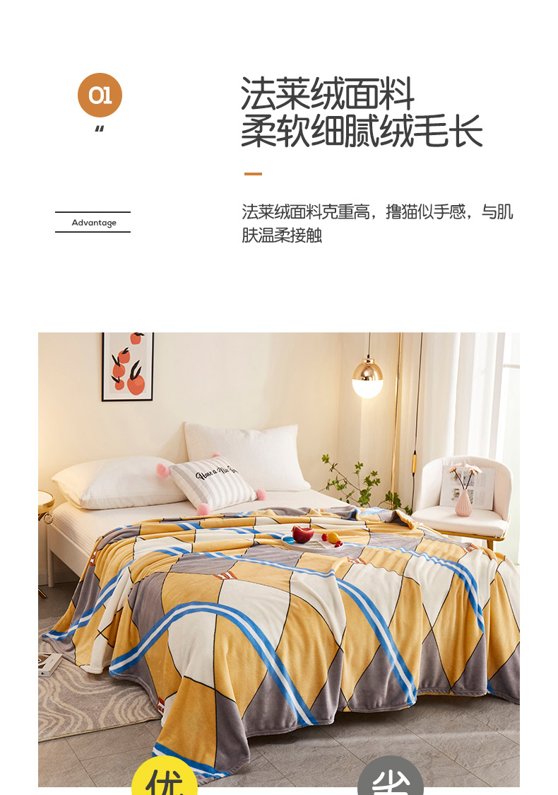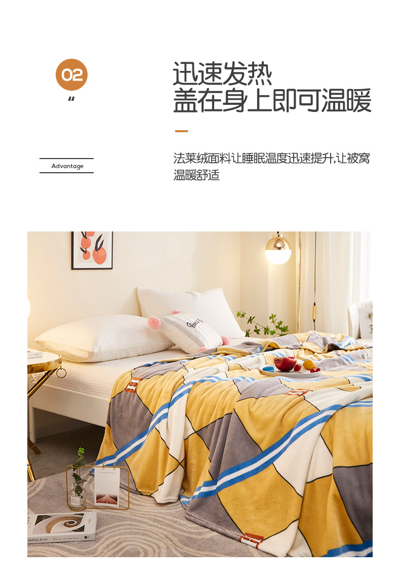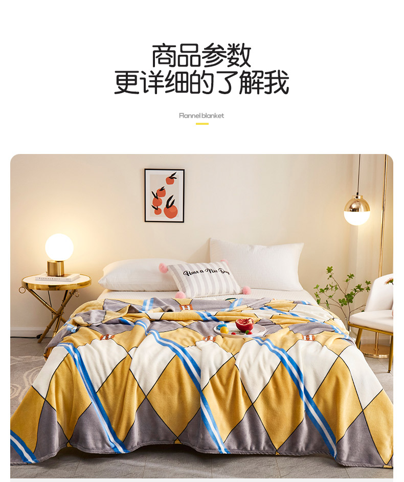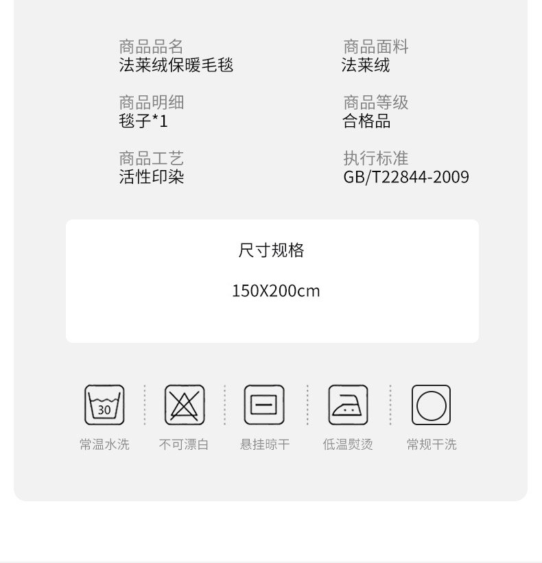 面料:法兰绒(聚酯纤维) 规格:150cm*200cm 工艺:卷边 包装:精美手拎纸盒 法兰绒绵绵温热感如周沭浴阳光,蓄热保暖 ,一夜暖睡 加密加厚法莱绒高克重面料锁住热量、保暖加倍、呵护睡眠。